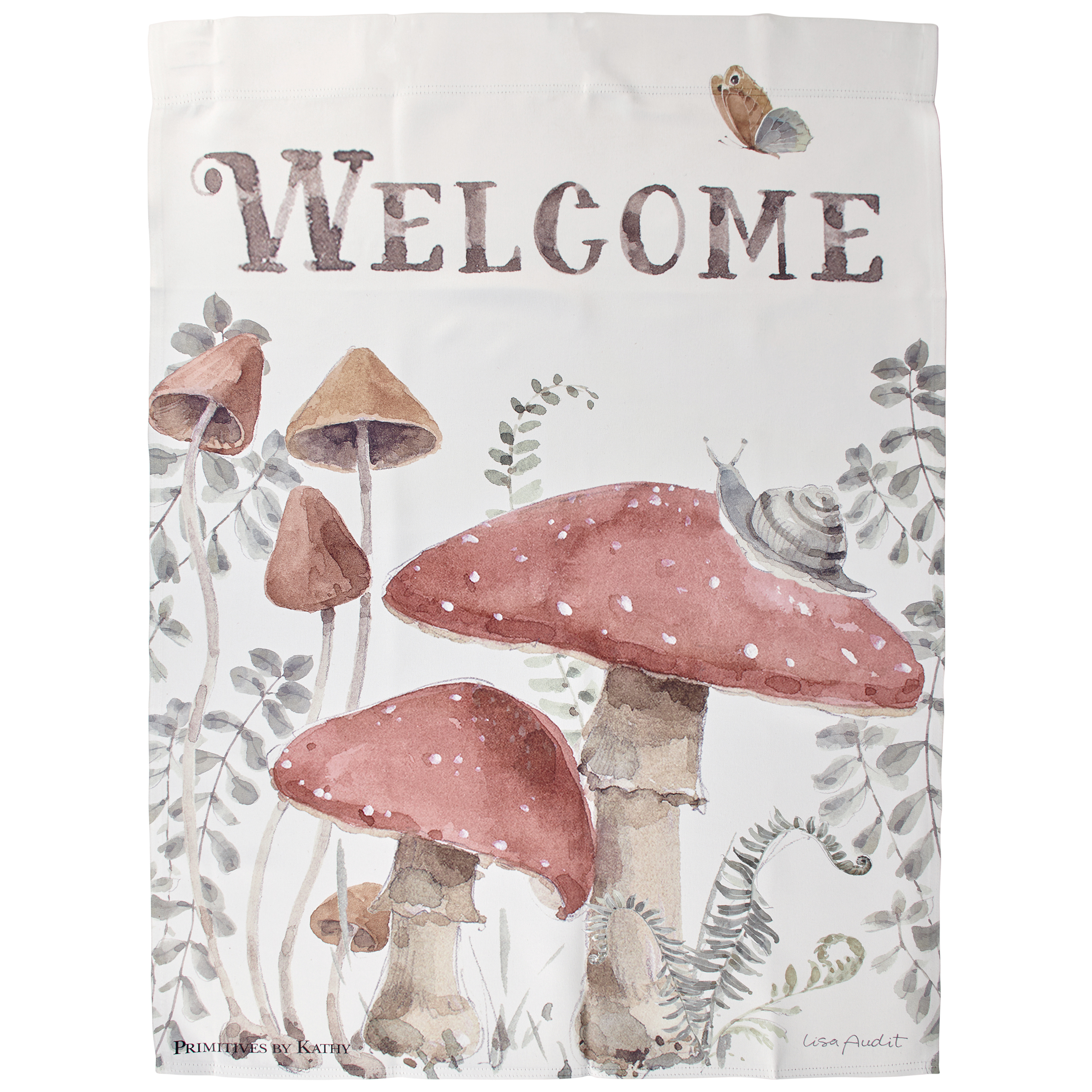 A double-sided polyester house flag from our Cottagecore Collection displaying a garden inspired scene of mushrooms with wildflowers and "Welcome" sentiment. Mushroom design is replicated from original art hand painted in a delicate watercolor style. Garden house flag is weather-resistant and features inside loops that connect to hooks on our House Flag Pole and keep the flag in an open position. Our Welcome house flag is packaged in a polybag folded up with a header card displaying full flag design and a hook to easily hang on rack for store display. Hand wash only. A rustic nature-themed home accent perfect for everyday display.
