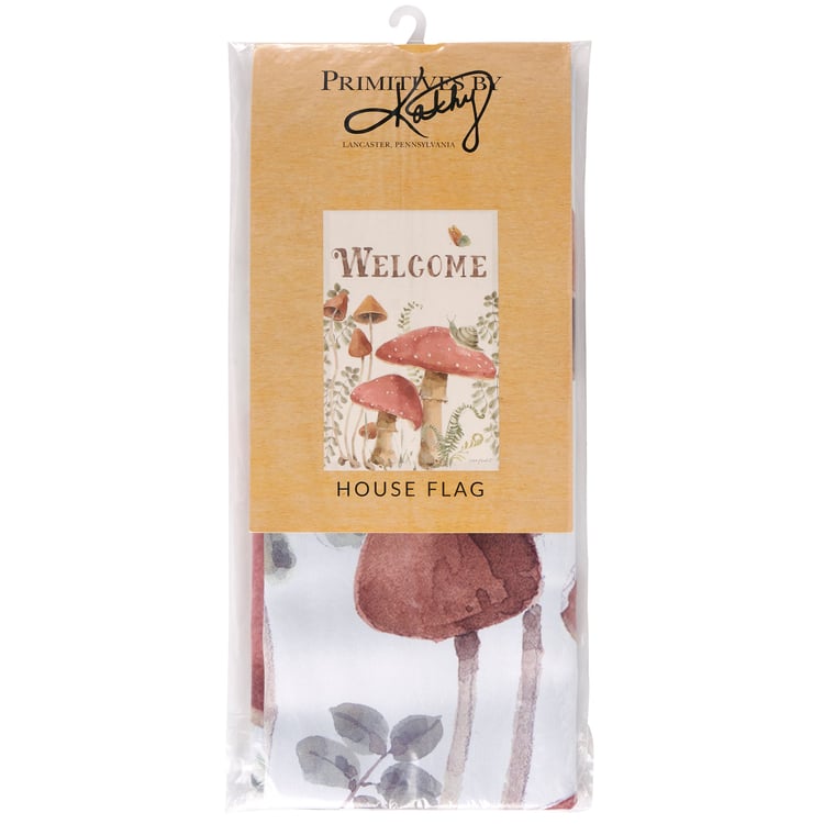 A double-sided polyester house flag from our Cottagecore Collection displaying a garden inspired scene of mushrooms with wildflowers and "Welcome" sentiment. Mushroom design is replicated from original art hand painted in a delicate watercolor style. Garden house flag is weather-resistant and features inside loops that connect to hooks on our House Flag Pole and keep the flag in an open position. Our Welcome house flag is packaged in a polybag folded up with a header card displaying full flag design and a hook to easily hang on rack for store display. Hand wash only. A rustic nature-themed home accent perfect for everyday display.