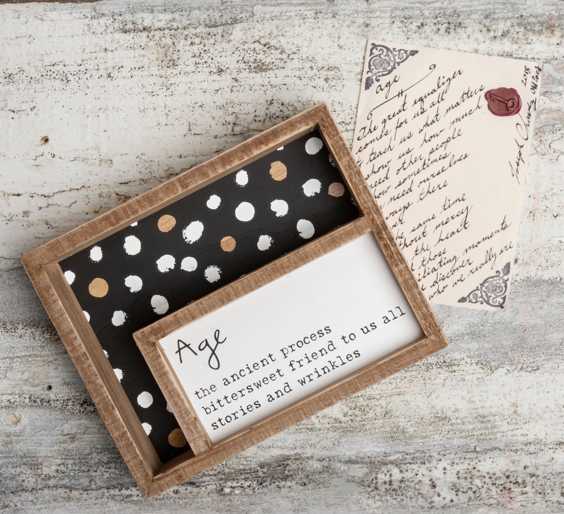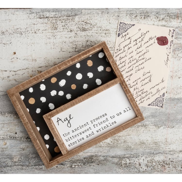 A double-inset box sign featuring a geometric pattern on the background with a front panel for a haiku poem. Poem reads "Age The Ancient Process Bittersweet Friend To Us All Stories And Wrinkles." Easy to hang or can free-stand alone.