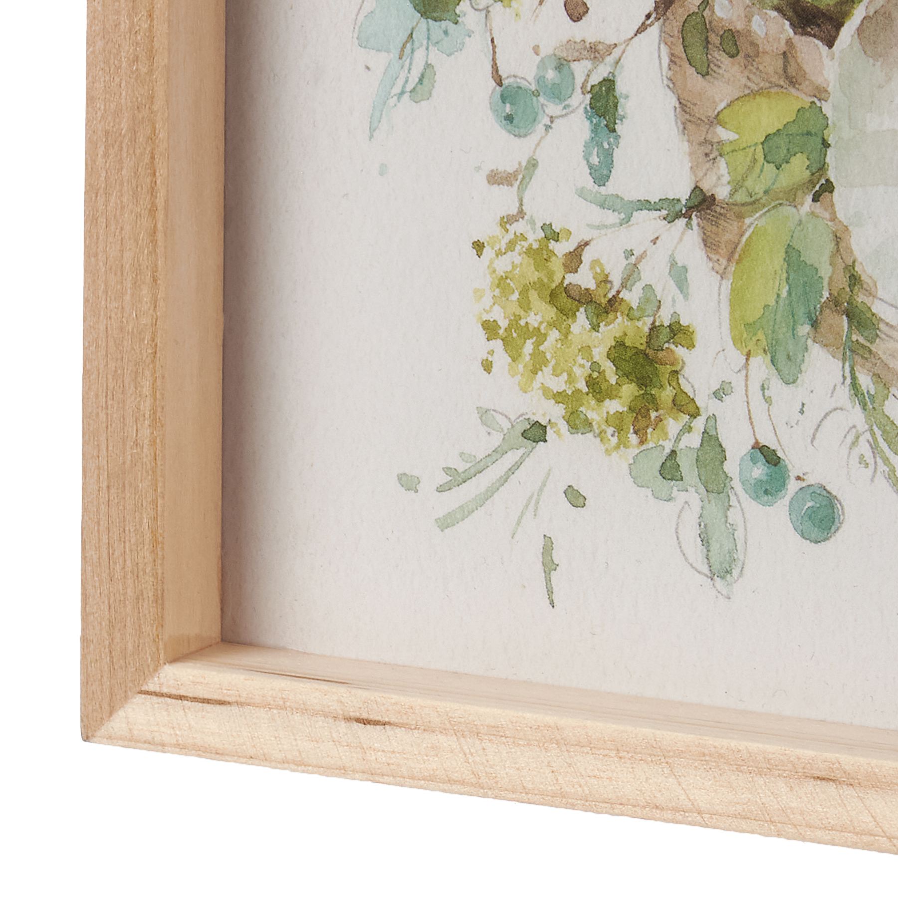 An inset box sign from our Watercolor Collection displaying a fresh pastel color palette with delicate watercolor design of birds and flowers on a bicycle. Box sign frame features light natural wood and inset design. Our Bicycle Meeting inset box sign is easy to hang or can free-stand alone.