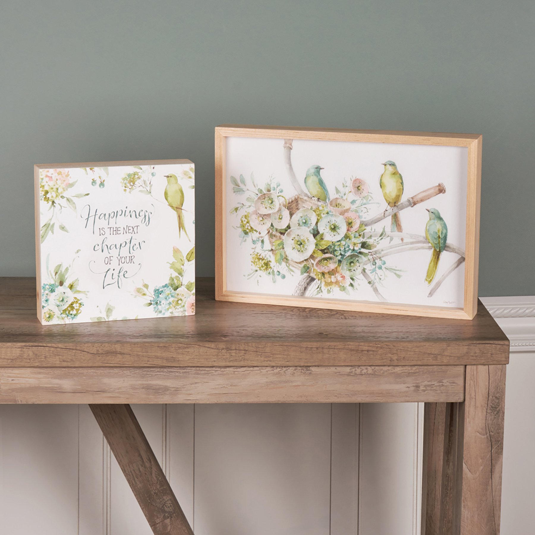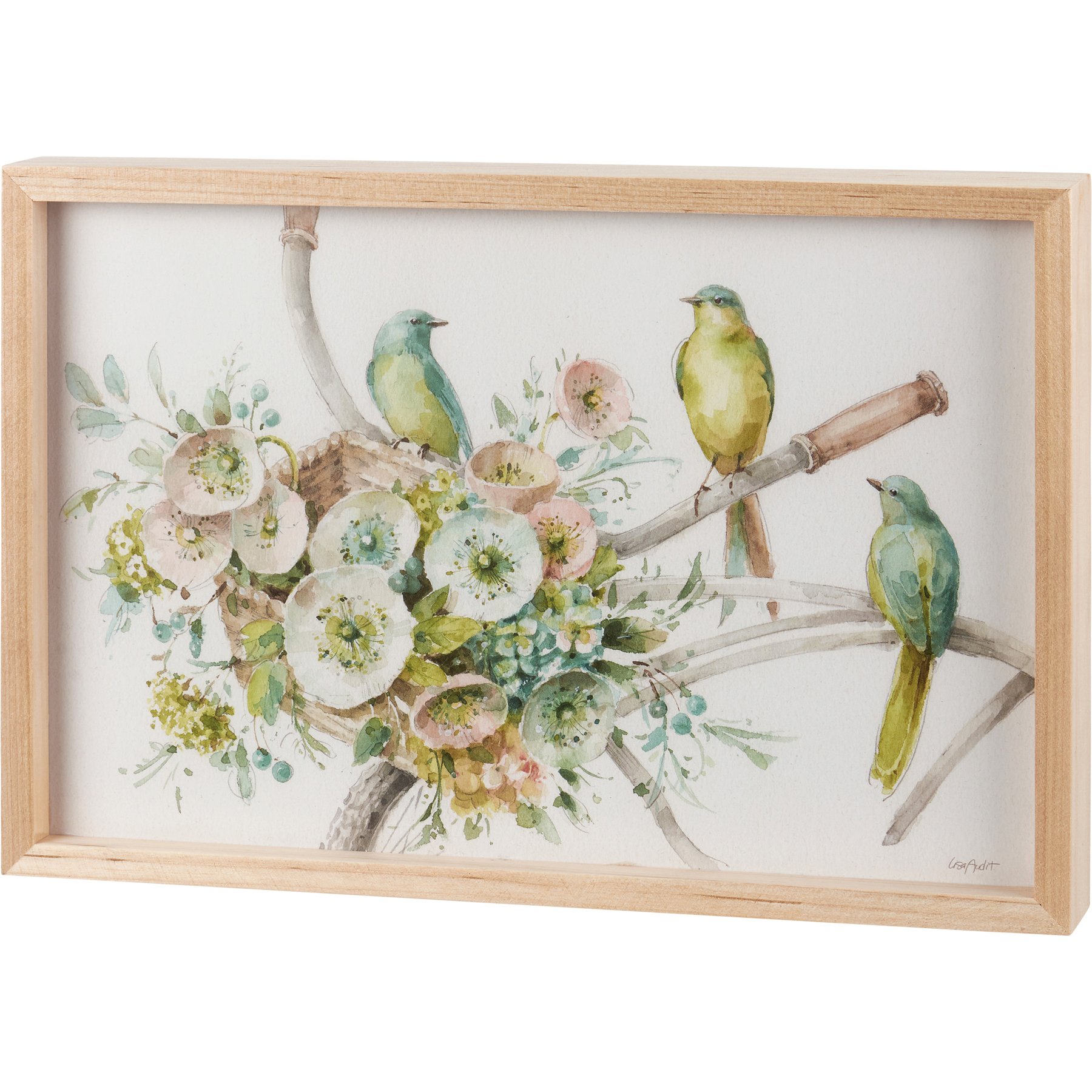 An inset box sign from our Watercolor Collection displaying a fresh pastel color palette with delicate watercolor design of birds and flowers on a bicycle. Box sign frame features light natural wood and inset design. Our Bicycle Meeting inset box sign is easy to hang or can free-stand alone.