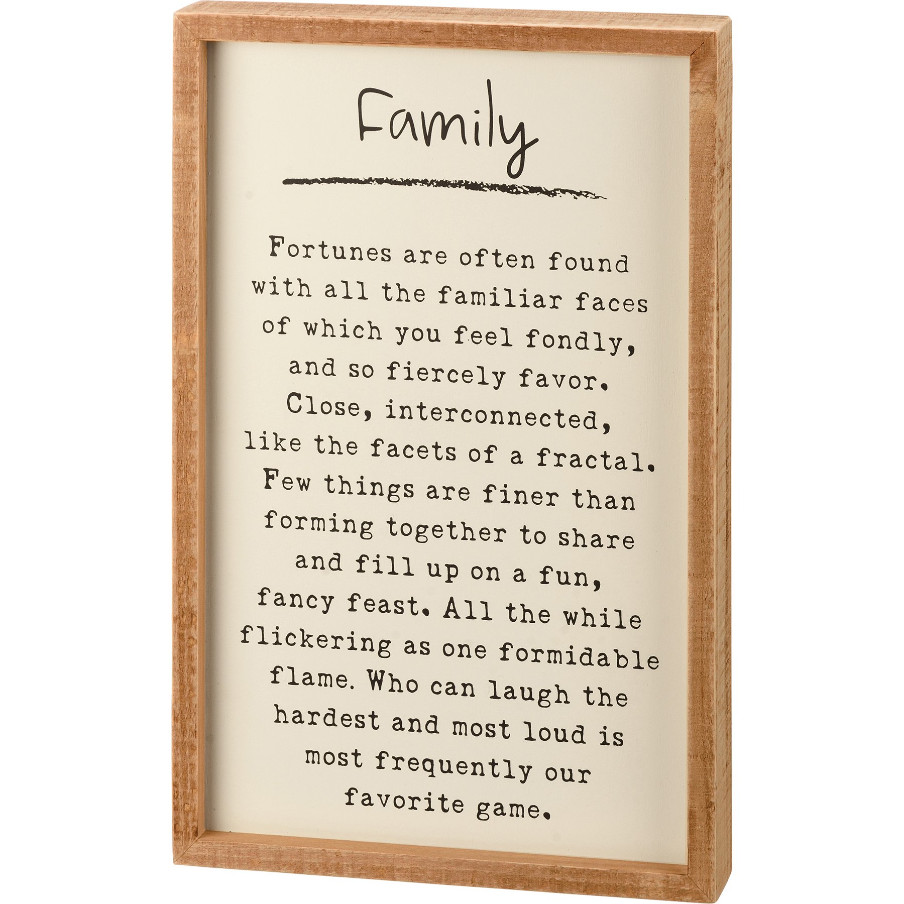 A wooden inset box sign from our Poetry Collection features "Family" sentiment followed by a themed poem on a cream background and natural wood sides for added interest. Our Family inset box sign is easy to hang or can free-stand alone.