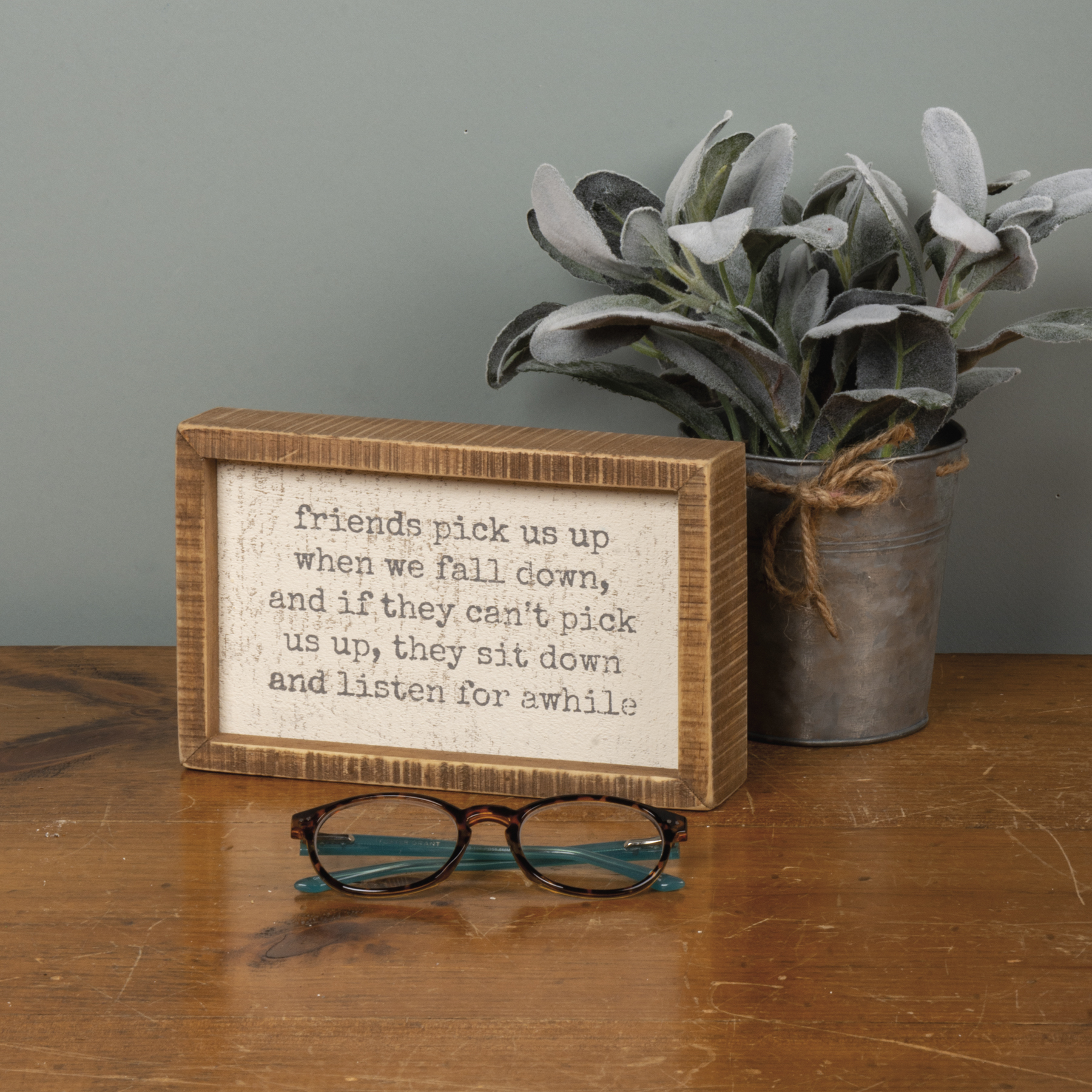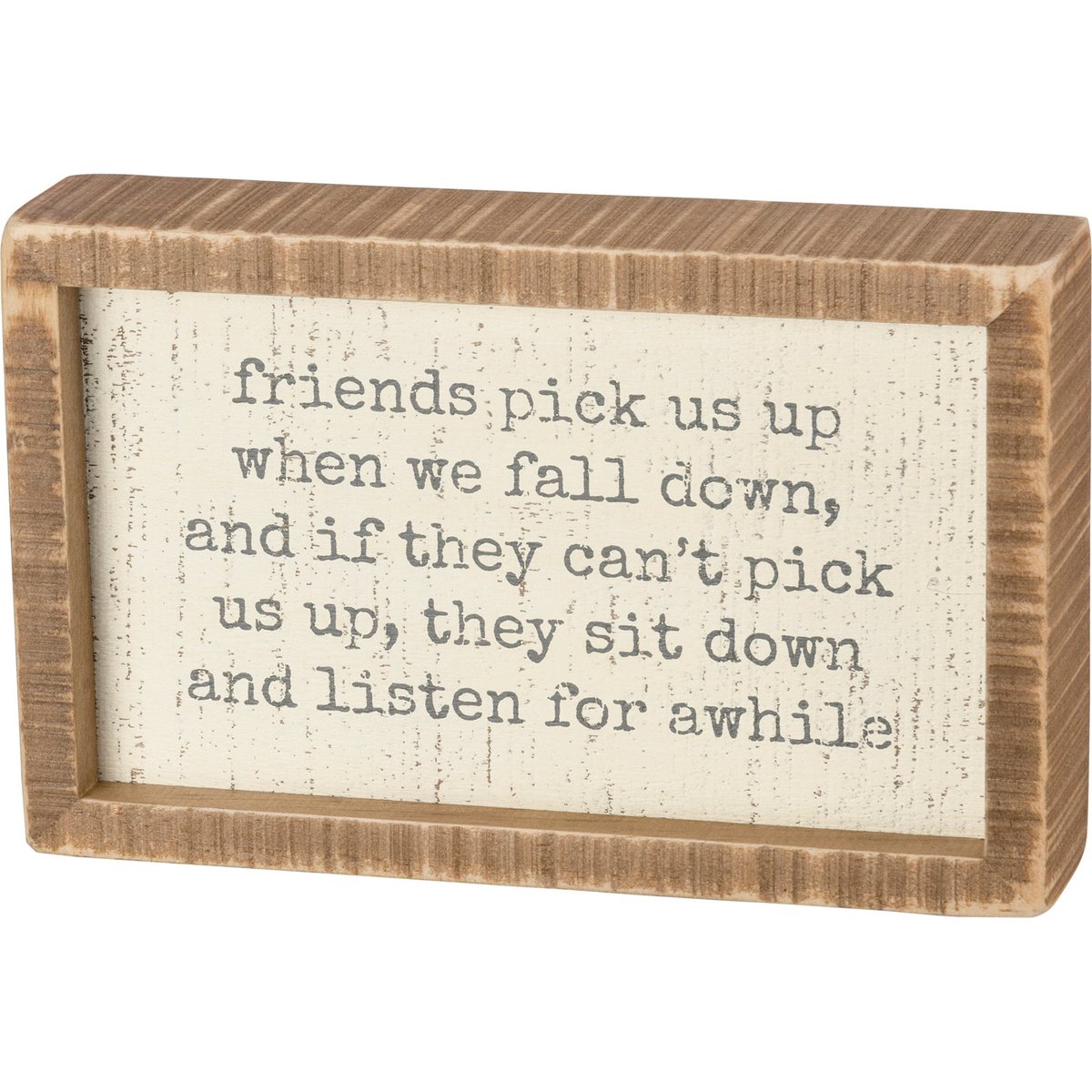 A wooden box sign lending an inset "Friends Pick Us Up When We Fall Down, And If They Can't Pick Us Up, They Sit Down And Listen For Awhile" sentiment. Easy to hang or can free-stand alone on a shelf or mantel. Complements well with coordinating design pieces for a thoughtful gift set.
