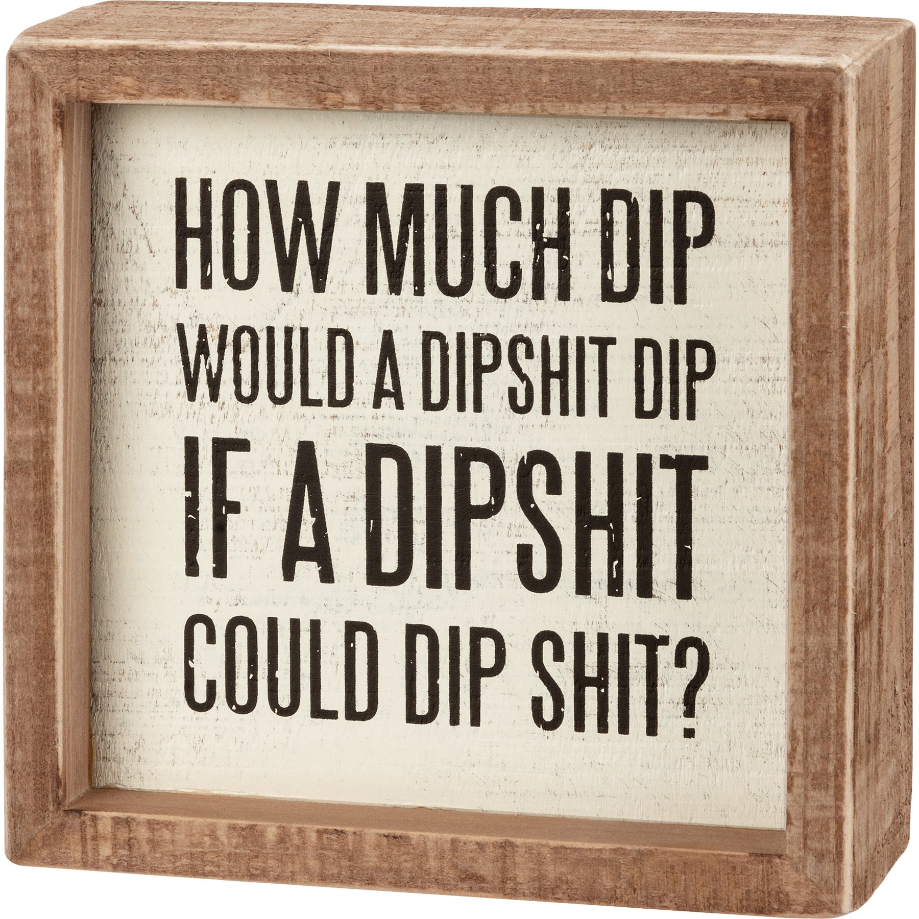An inset wooden box sign featuring "How Much Dip Would A Dipshit Dip If A Dipshit Could Dip Shit?" sentiment. Easy to hang or can free-stand alone.