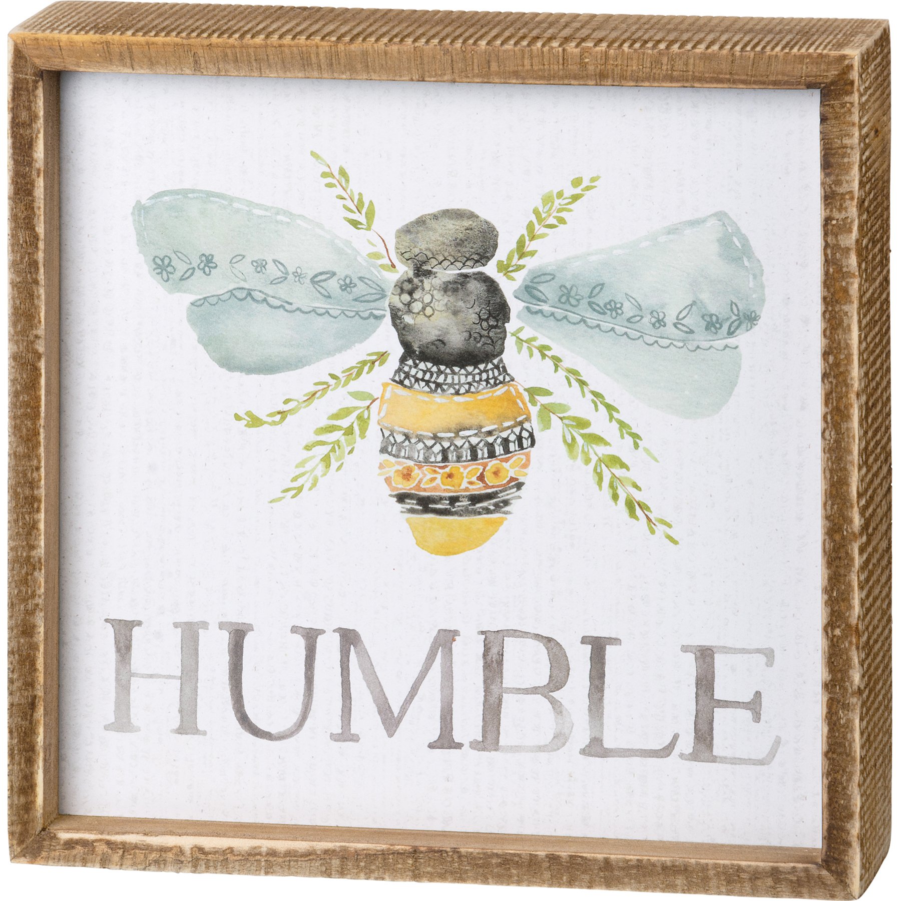 An inset wooden box sign featuring watercolor artwork, "Humble" sentiment with bumblebee design, and floral accents with natural wood trim. Easy to hang or can free-stand alone. Complements well with coordinating pieces in collection for a refreshing spring display.