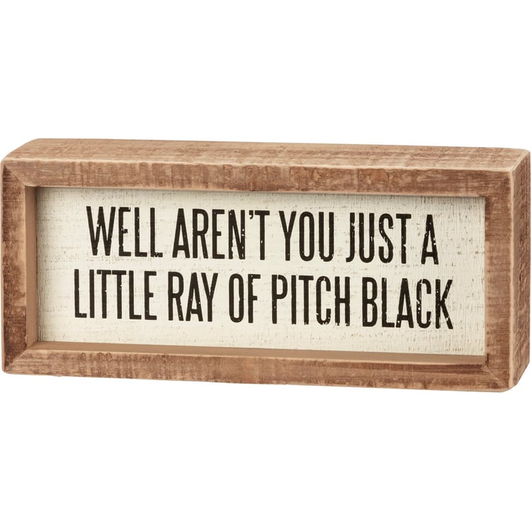 An inset wooden box sign featuring "Well Aren't You Just A Little Ray Of Pitch Black" sentiment. Easy to hang or can free-stand alone.