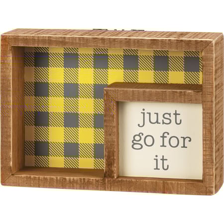 A double-inset box sign featuring a gray and yellow buffalo check background design and a framed front panel with a "Just Go For It" sentiment. Wooden wall art is easy to hang or can free-stand alone.