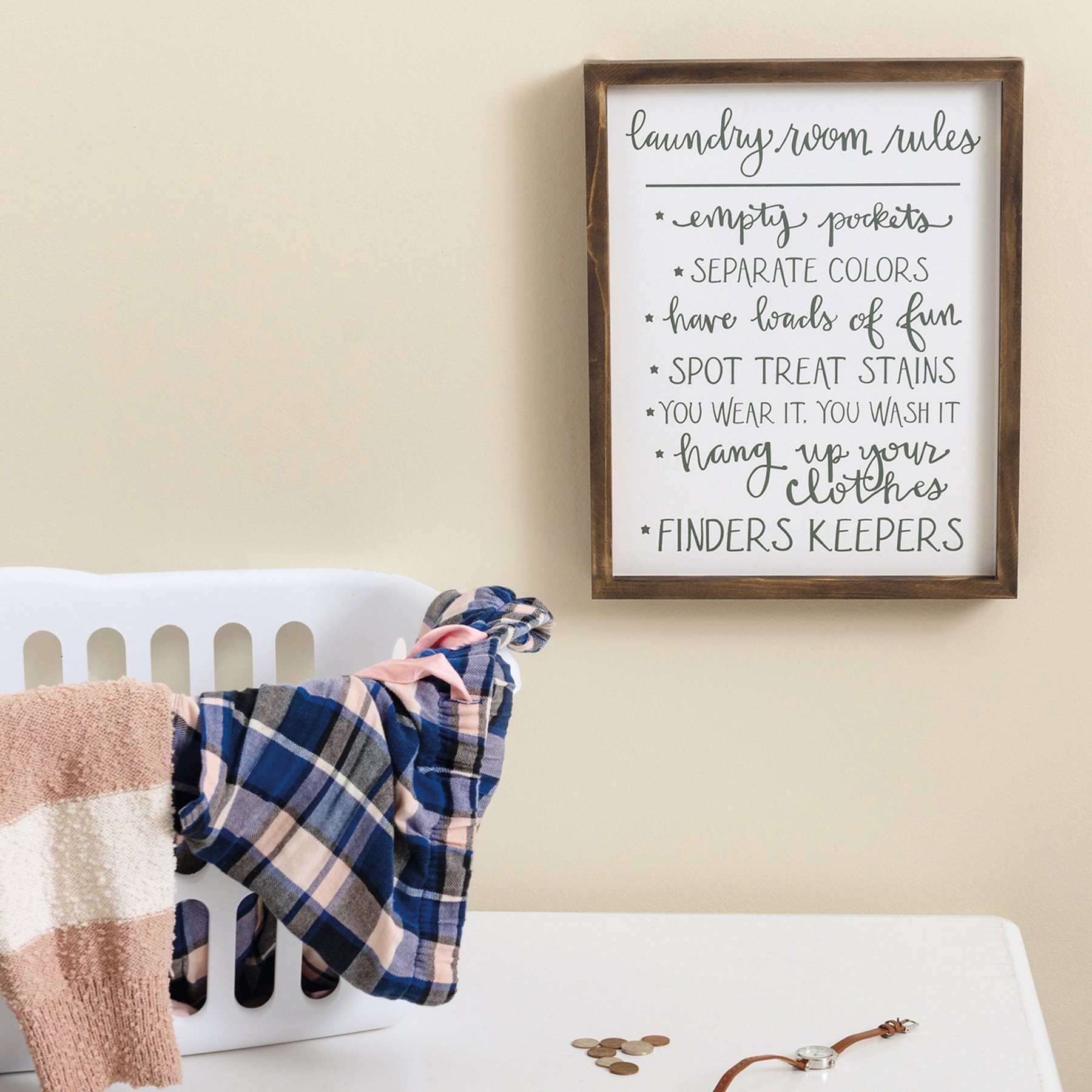 A wooden inset box sign from our Room By Room Collection features a hand lettered "Laundry Room Rules" sentiment followed by a list of rules on a white base with dark stained sides for added interest. Our Laundry Room Rules inset box sign is easy to hang or can free-stand alone.