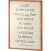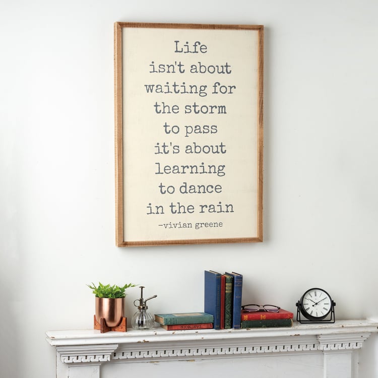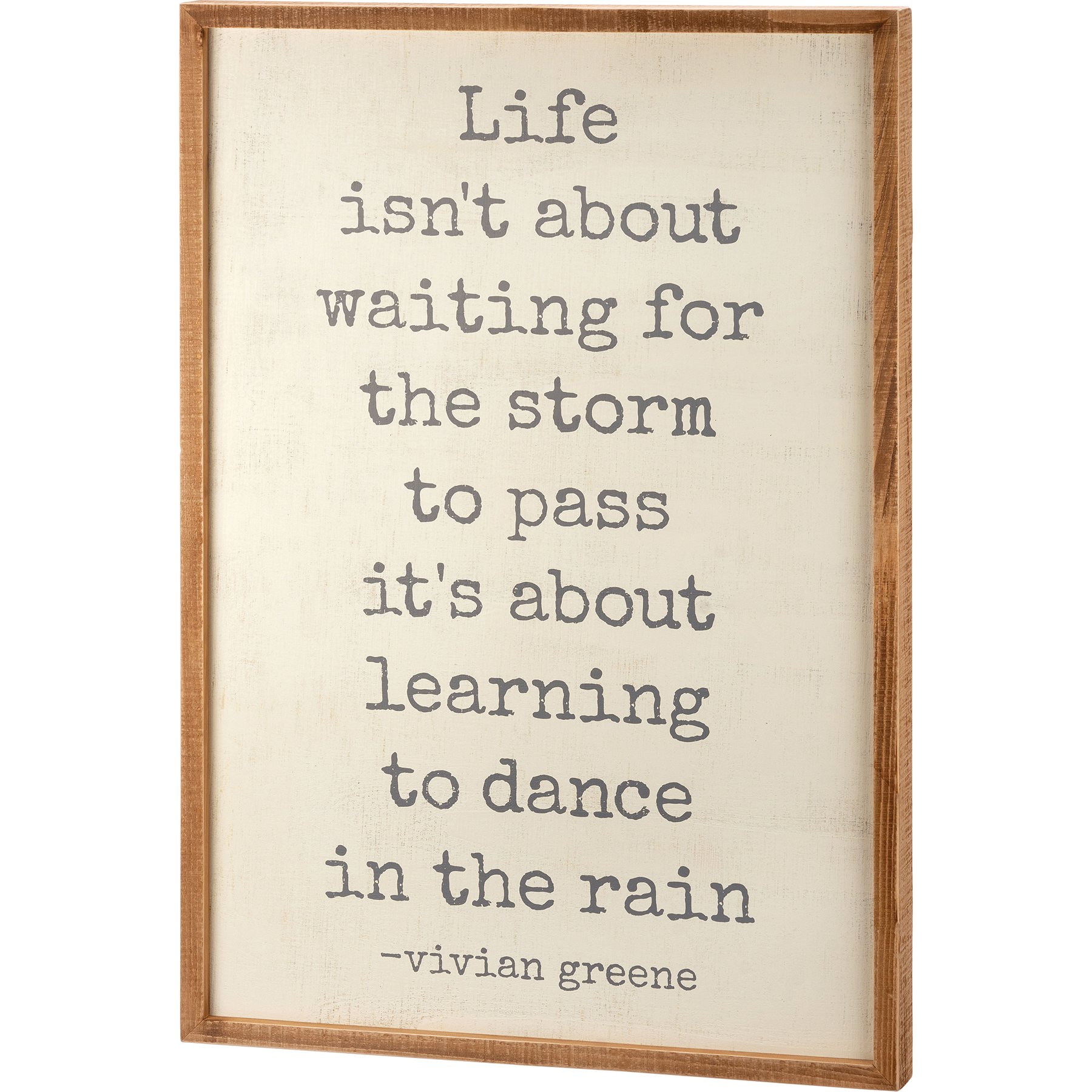 An inset wooden box sign featuring a typeset "Life Isn't About Waiting For The Storm To Pass It's About Learning To Dance In The Rain - Vivian Greene" sentiment, neutral color palette, and natural wood sides for added interest. Our Learning To Dance In The Rain inset box sign is easy to hang or can free-stand alone.