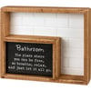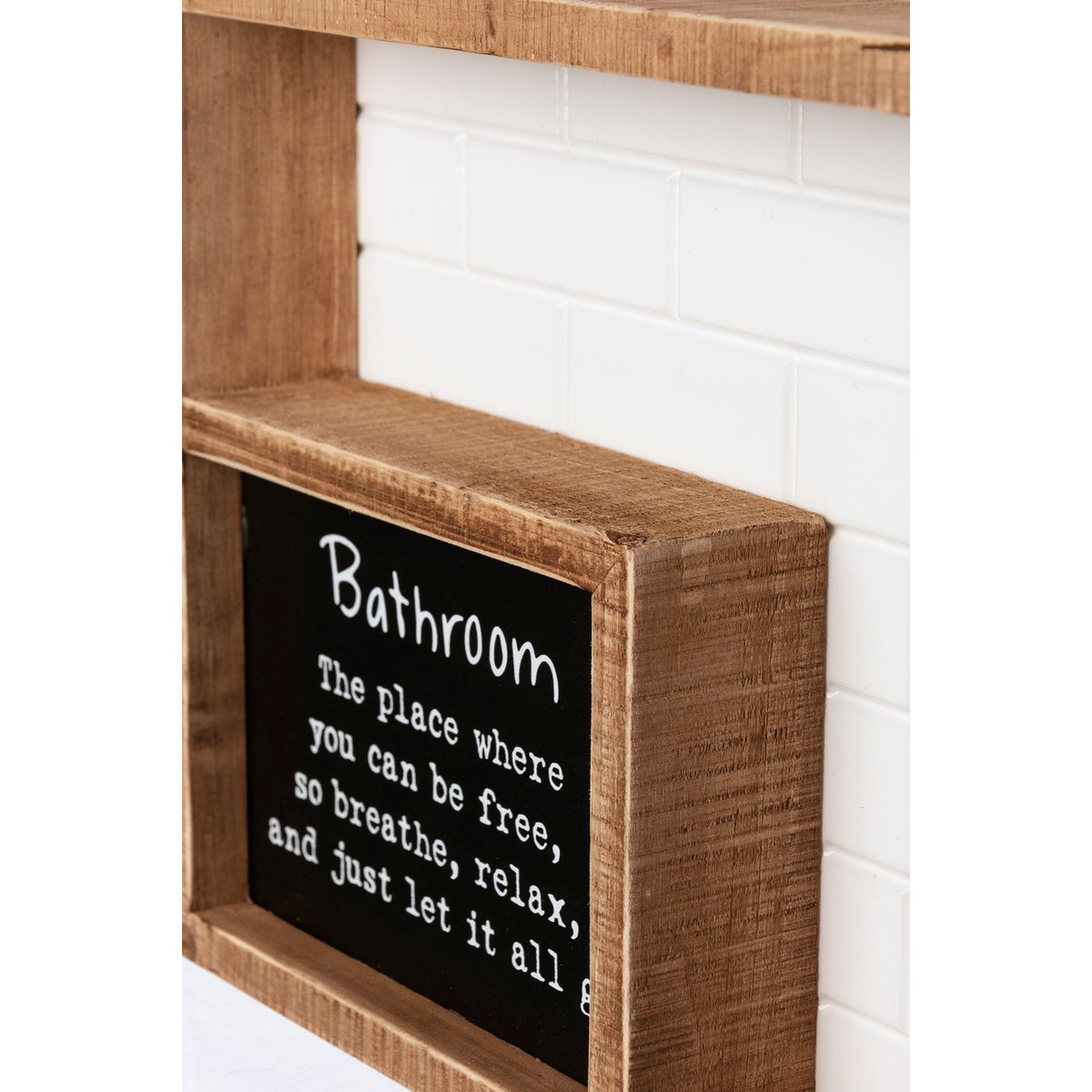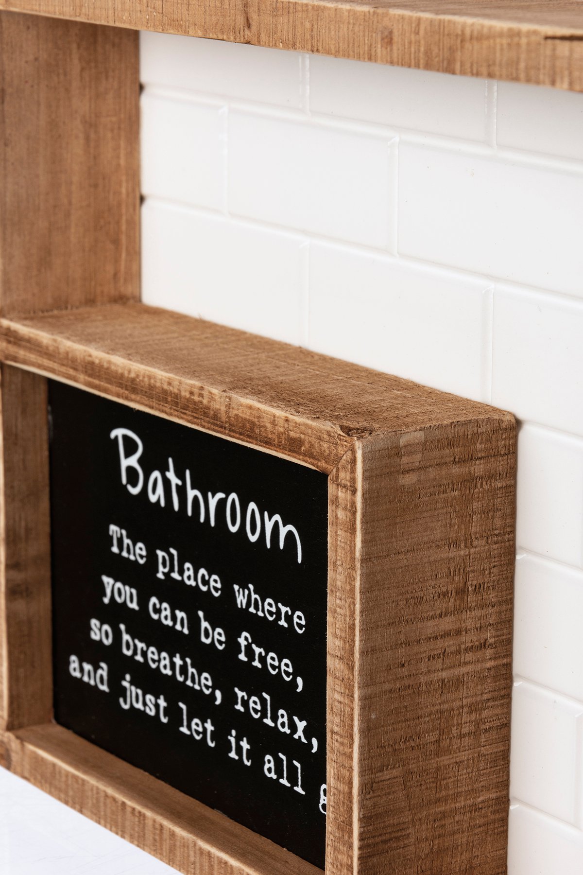A double inset wooden box sign featuring a tile-like enamel background with a front panel for a poem. Poem reads "Bathroom The Place Where You Can Be Free, So Breathe, Relax, And Just Let It All Go." Easy to hang or can free-stand alone.