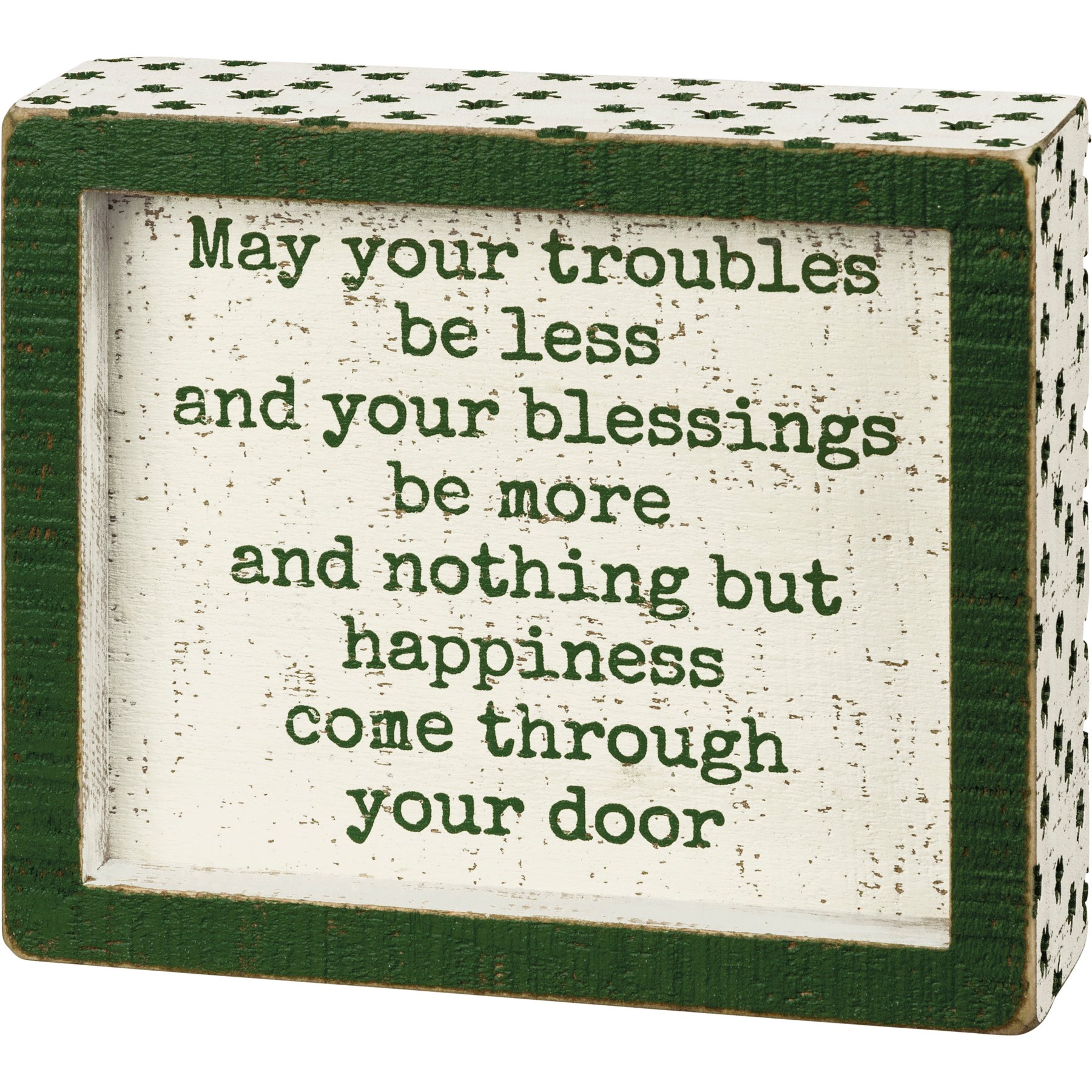 A rustic inset wooden box sign featuring "May Your Troubles Be Less And Your Blessings Be More And Nothing But Happiness Come Through Your Door" sentiment, green accents, distressed cream painted details, and debossed shamrock designs for added interest. Easy to hang or can free-stand alone.
