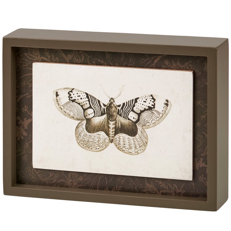 An inset box sign from our Moody Collection featuring a dark gray wood frame and inset design with a leaf pattern background and a center design placed on a raised section for dimensional detail. Center design displays a vintage sketch of a moth. Our Moth inset box sign is easy to hang or can free-stand alone. A dark academia inspired home accent that can be easily displayed in any home or work space.