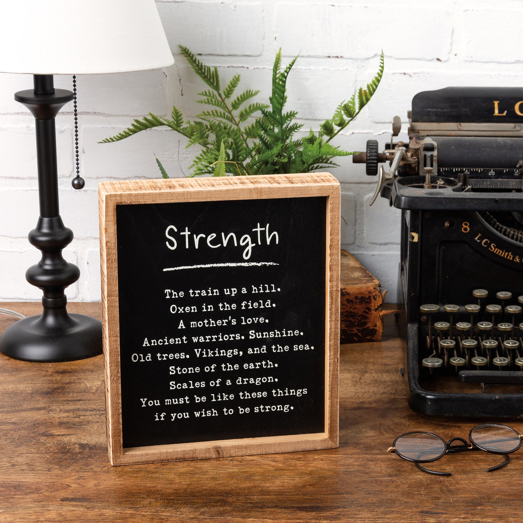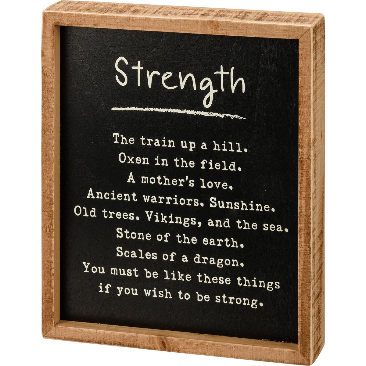 A small wooden inset box sign from our Poetry Collection features "Strength" sentiment followed by a themed poem on a black background and natural wood sides for added interest. Our Strength small inset box sign is easy to hang or can free-stand alone.