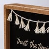 An inset wooden box sign from our Bohemian Collection features an inspirational "Trust The Timing Of Your Life" sentiment, brown background, macrame tassel fringe accents, and natural wood sides for added interest. Our Your Life inset box sign is easy to hang or can free-stand alone. Not eligible for discounting.