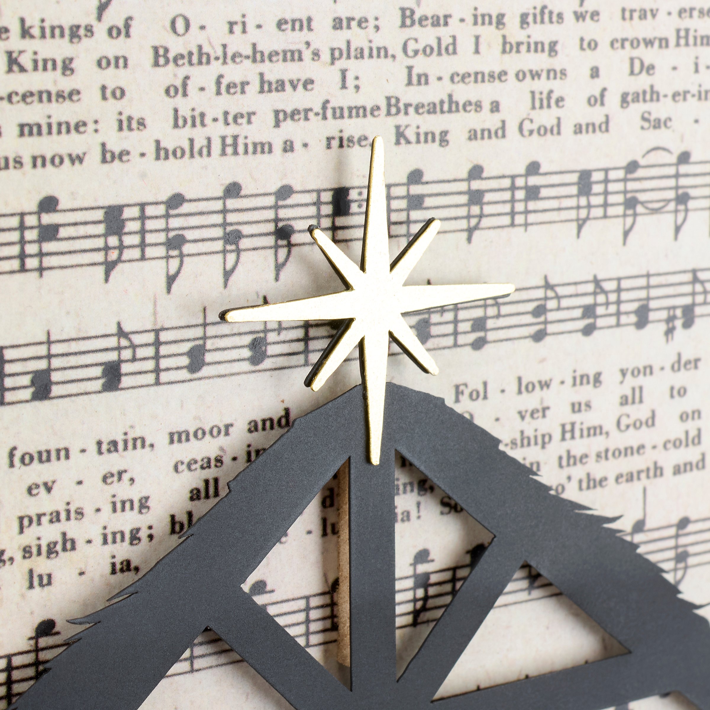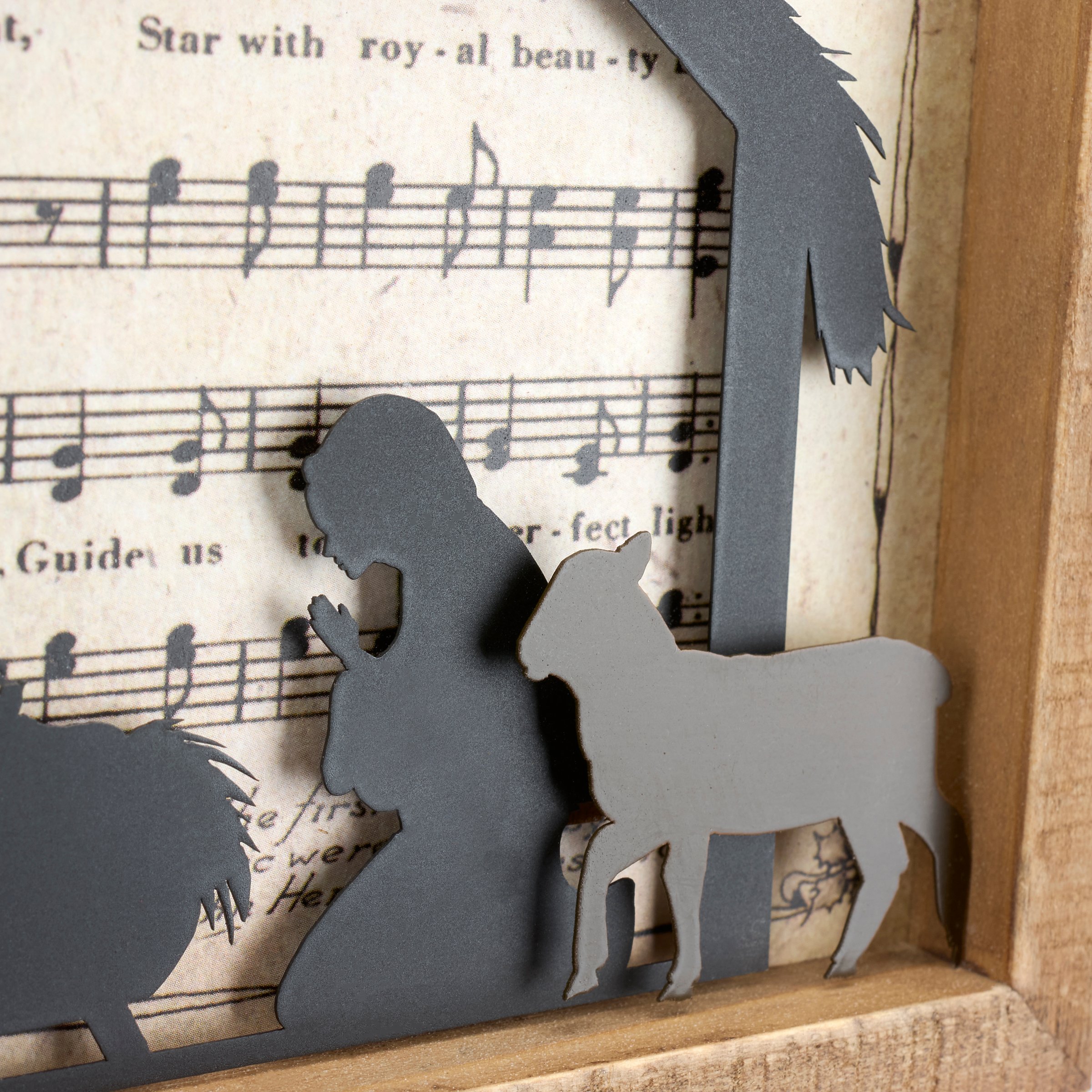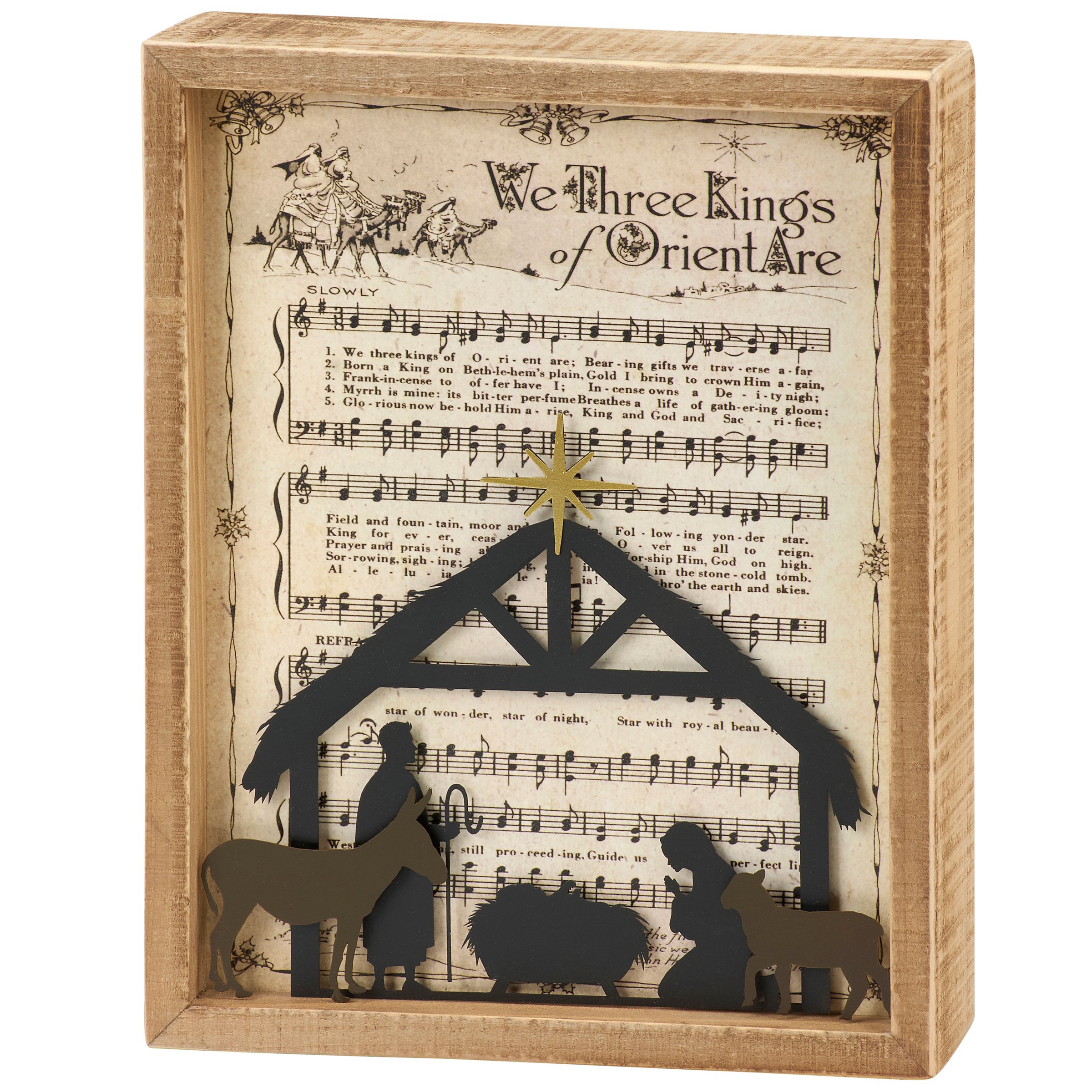An inset box sign from our Christmas Collection featuring an inset design displaying vintage sheet music for "We Three Kings" behind cutout metal pieces creating a nativity scene. Frame is made with natural wood with distressed details. Our We Three Kings inset box sign is easy to hang or can free-stand on a flat surface for display. A nativity themed home accent that can be easily displayed to add seasonal style to any home or work space.