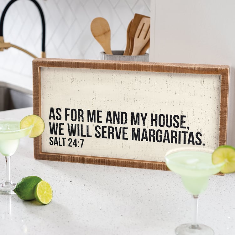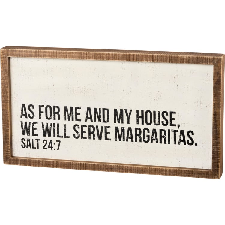A wooden inset box sign featuring a humorous "As For Me And My House, We Will Serve Margaritas. Salt 24:7" sentiment in a neutral palette with a natural wood trim. Complements well with existing decor, and is easy to hang or can free-stand alone.