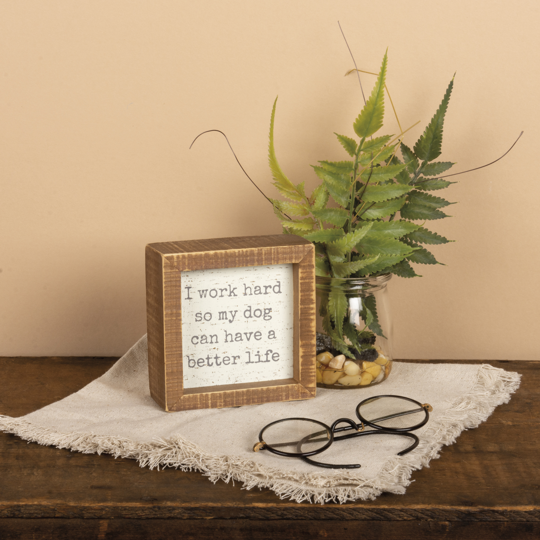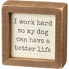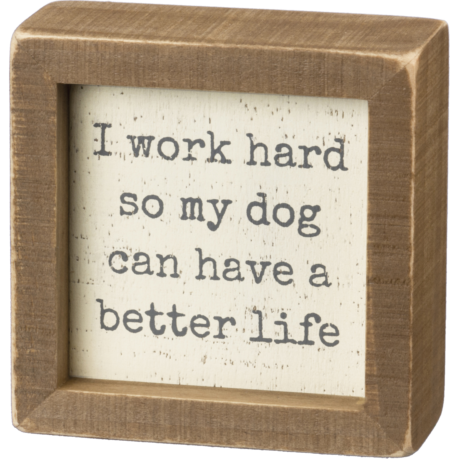 An inset box sign featuring a natural wood frame and inset design displaying a heartwarming pet inspired sentiment that reads "I Work Hard So My Dog Can Have A Better Life." Our Work Hard So Dog Has Better Life sign is easy to hang for display or can free-stand alone on a flat surface. A lovely pet-themed home accent that can be easily displayed in any home or work space.