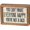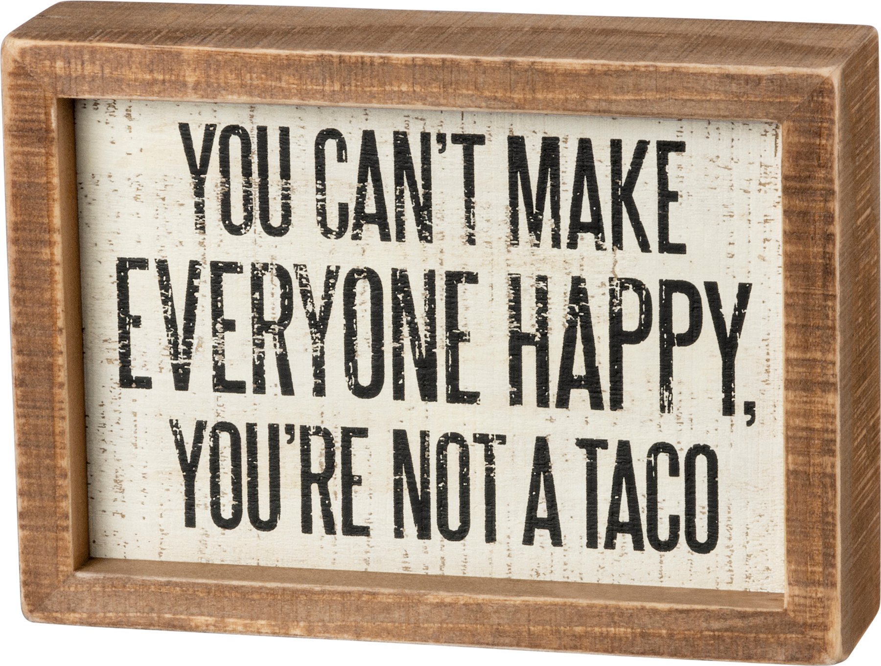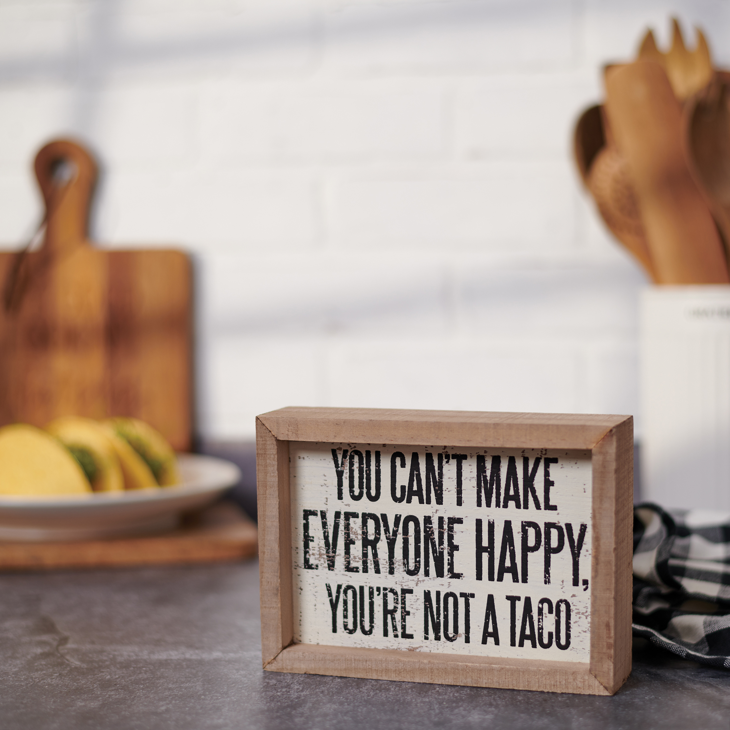 A wooden inset box sign featuring a humorous "You Can't Make Everyone Happy, You're Not A Taco" sentiment in a neutral palette with a natural wood trim. Complements well with existing decor, and is easy to hang or can free-stand alone. Not eligible for discounting.