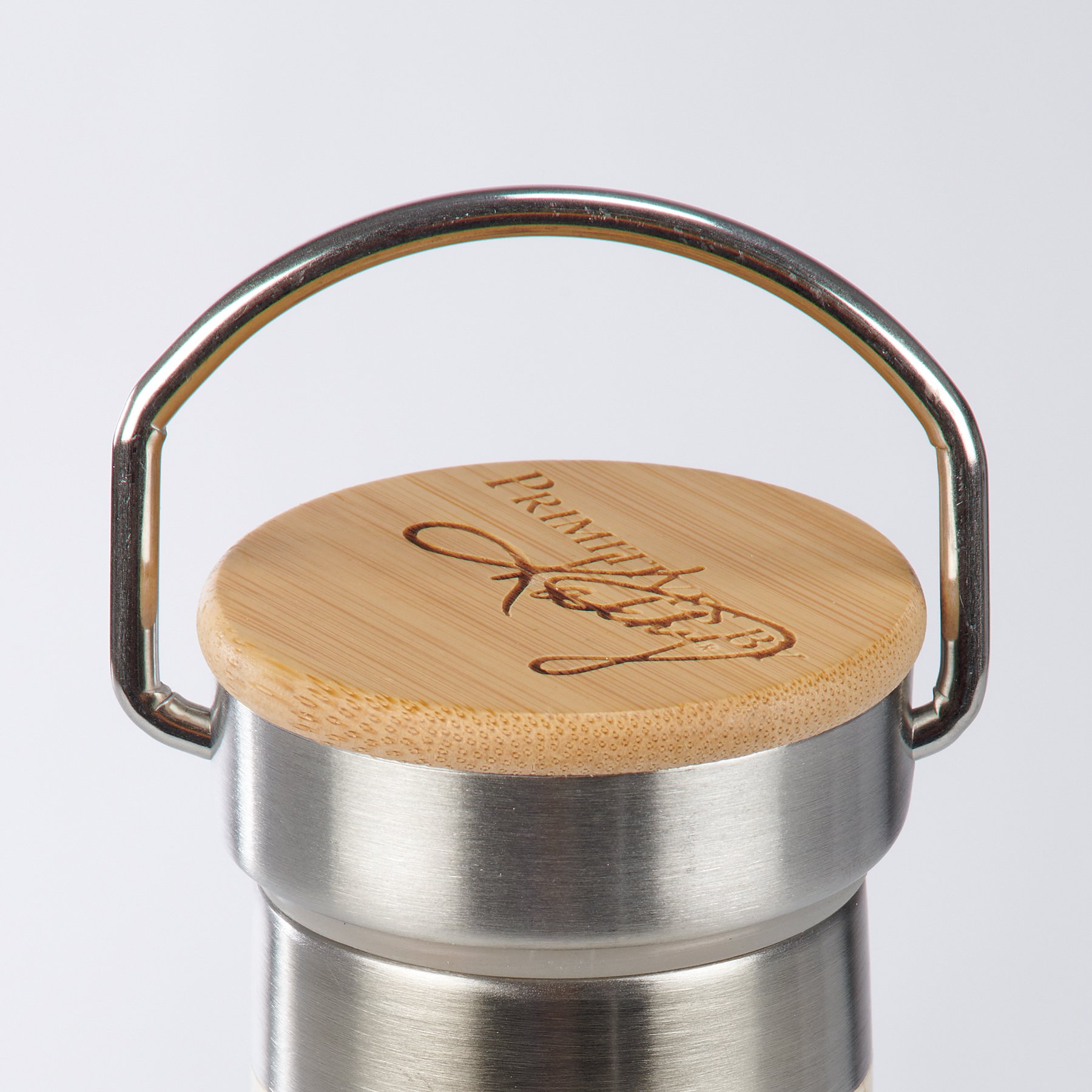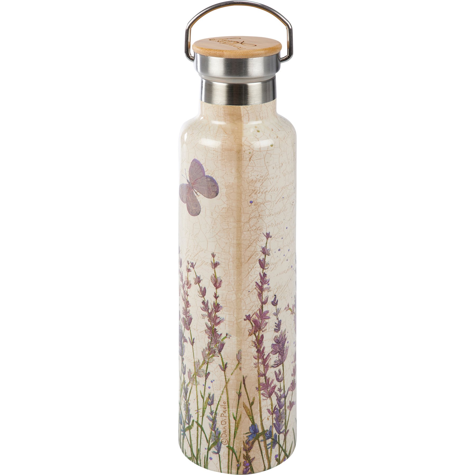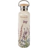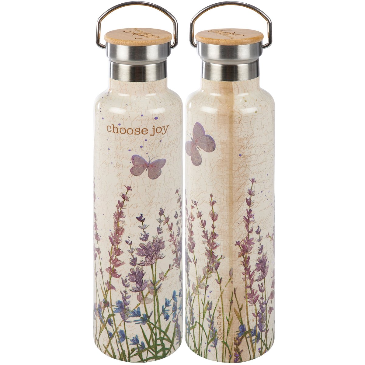 An insulated, double-walled stainless steel water bottle and coordinating lid with bamboo top layer. Featured in our Cottagecore Collection, our bottle displays a full wrap-around design of florals and a butterfly in a rustic style with "Choose Joy" sentiment. Our Choose Joy insulated bottle keeps up to 25 oz beverages cold for 24 hours and hot for 12 hours. Hand-wash only; do not microwave. A charming everyday accessory perfect for on-the-go or at home.