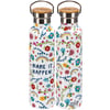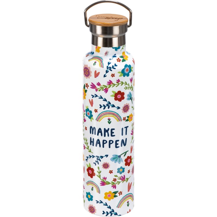 An insulated stainless steel bottle featuring a "Make It Happen" sentiment, vibrant and whimsical floral designs, and an engraved logo on the bamboo lid. Holds 25 ounces. Our Happen insulated bottle keeps beverages cold for 24 hours and hot for 12 hours. Hand-wash only. BPA free.