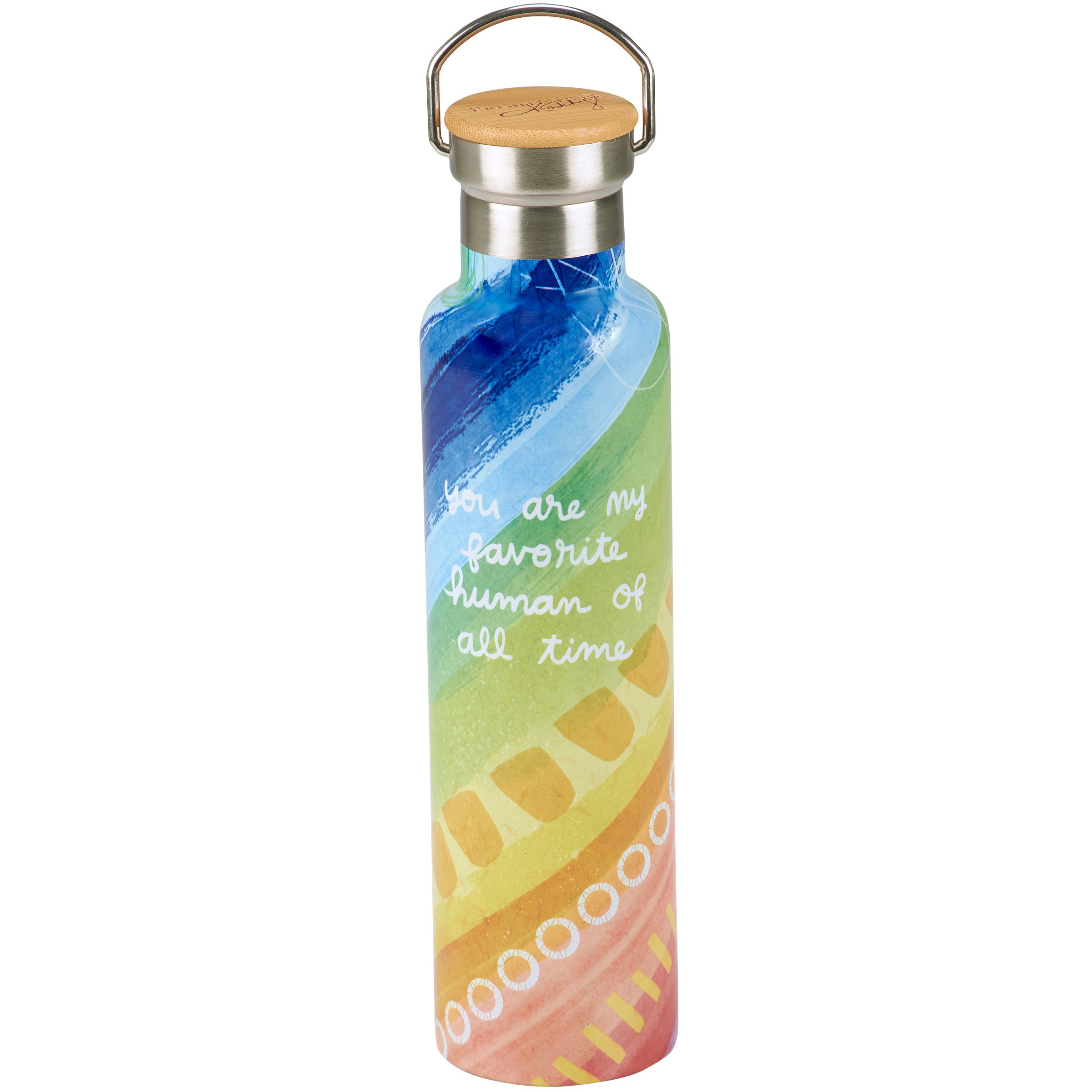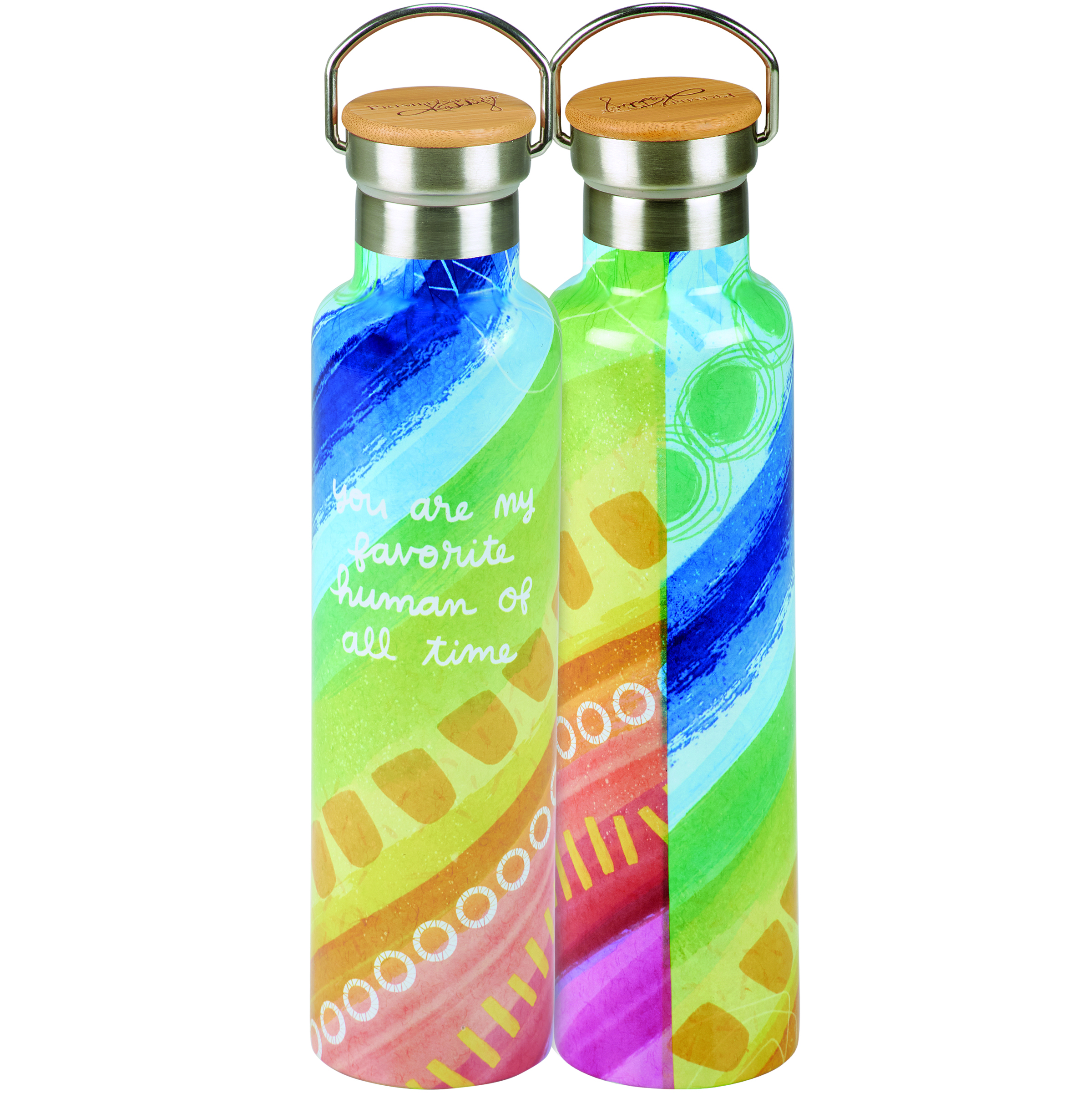 An insulated, double-walled stainless steel water bottle and coordinating lid with bamboo top layer. Featured in ourĀ Inspiration & Blooms Collection, our bottle displays a full wrap-around design of hand illustrated abstract art in a warm color palette with uplifting sentiment that reads "You Are My Favorite Human Of All Time." Our My Favorite insulated bottle keeps up to 25 oz beverages cold for 24 hours and hot for 12 hours. Hand-wash only; do not microwave. An inspirational everyday accessory perfect for on-the-go or at home.