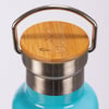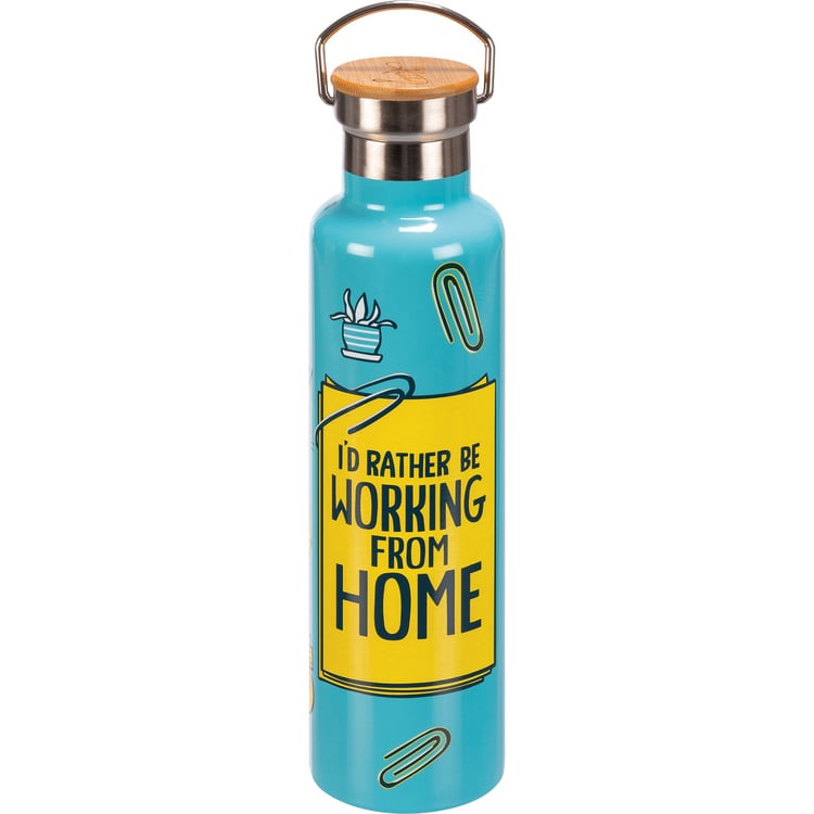 An insulated stainless steel bottle featuring a hand lettered "I'd Rather Be Working From Home" sentiment, work-themed designs, blue palette, and an engraved logo on the bamboo lid. Holds 25 ounces. Our From Home insulated bottle keeps beverages cold for 24 hours and hot for 12 hours. Hand-wash only. BPA free.