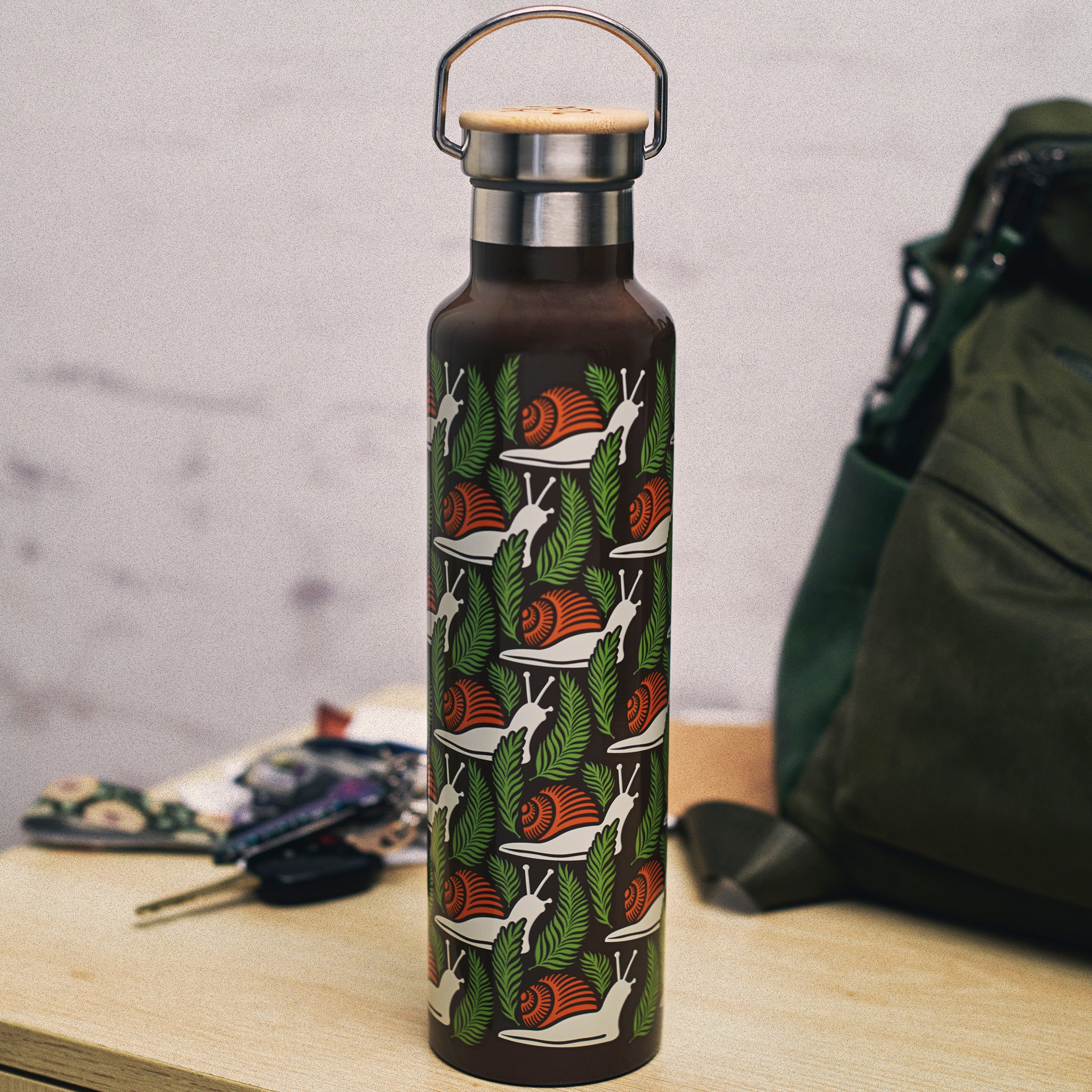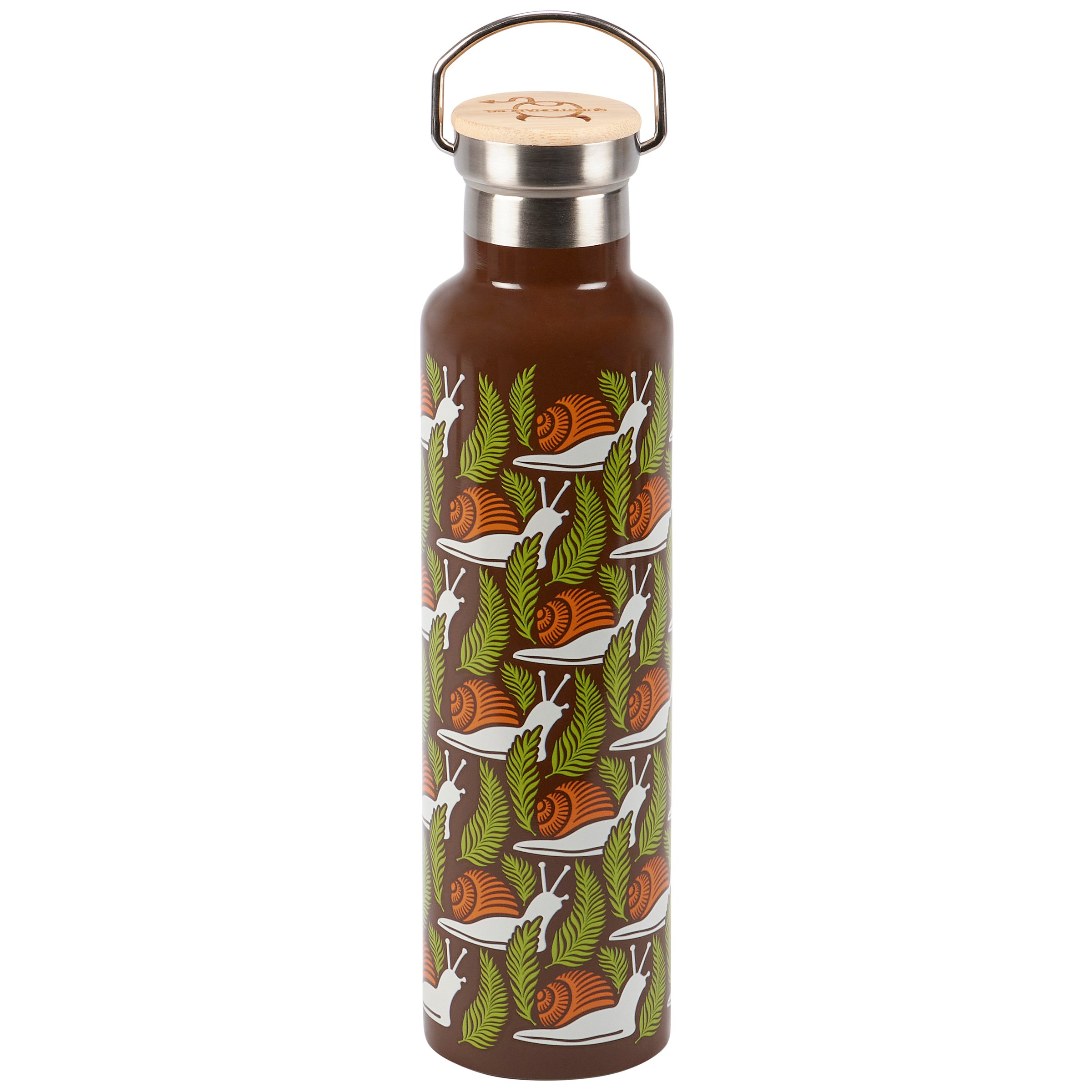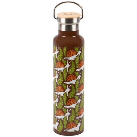 Give anyone that steps into personal space a vibe check with this insulated stainless steel water bottle displaying a full wrap-around earthy design of snails in a bold color palette. Questionables insulated bottles keep up to 25 oz beverages cold for 24 hours and hot for 12 hours and includes a coordinating lid with bamboo top. BPA free bottle is hand wash only; do not microwave. Our Snails insulated bottle is an everyday accessory with a down-to-earth style perfect for staying hydrated on-the-go or at home.