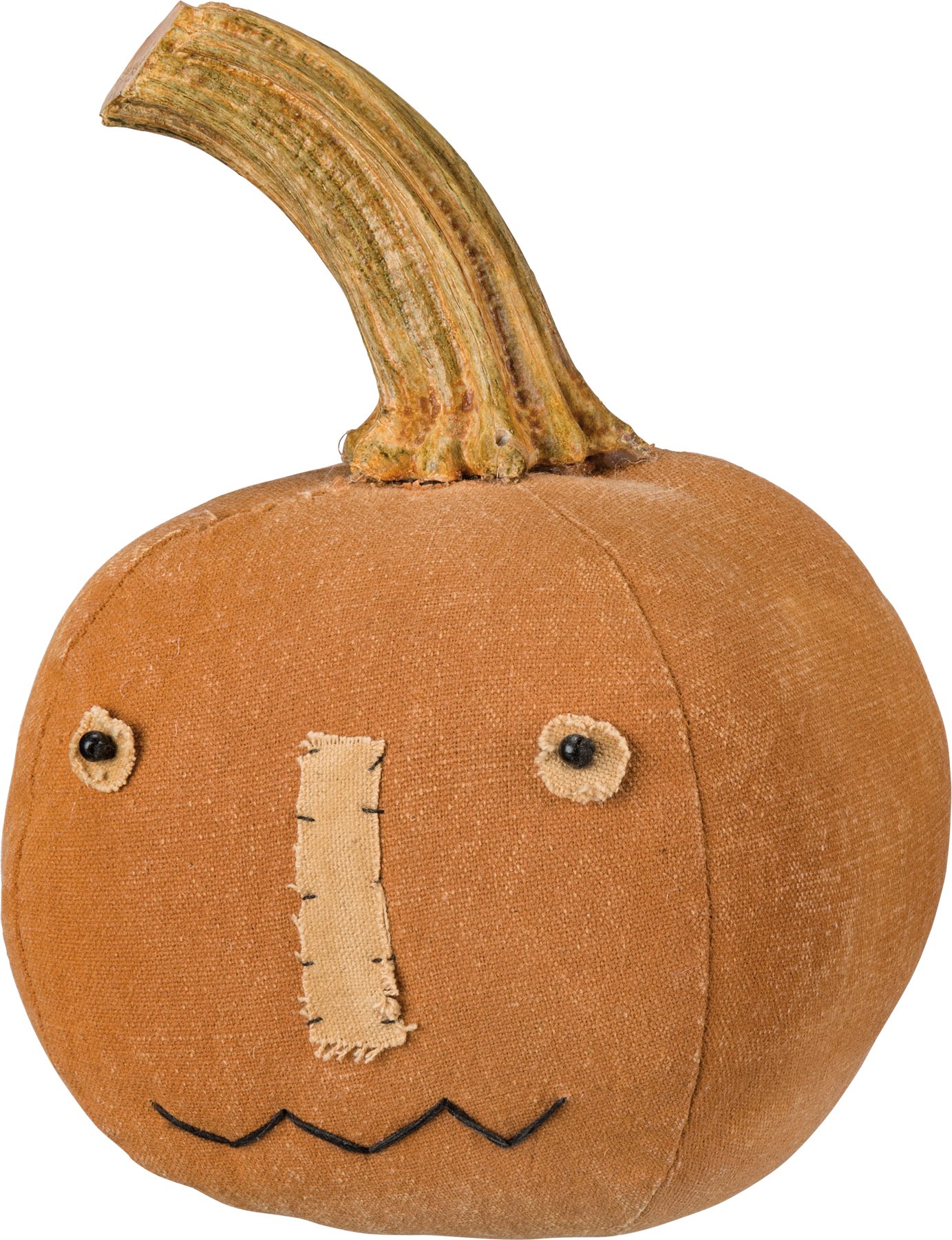 A primitive orange fabric jack-o-lantern with stitched and beaded facial features and wooden stem detail. Complements well with other pieces in collection to create a cohesive Halloween display.