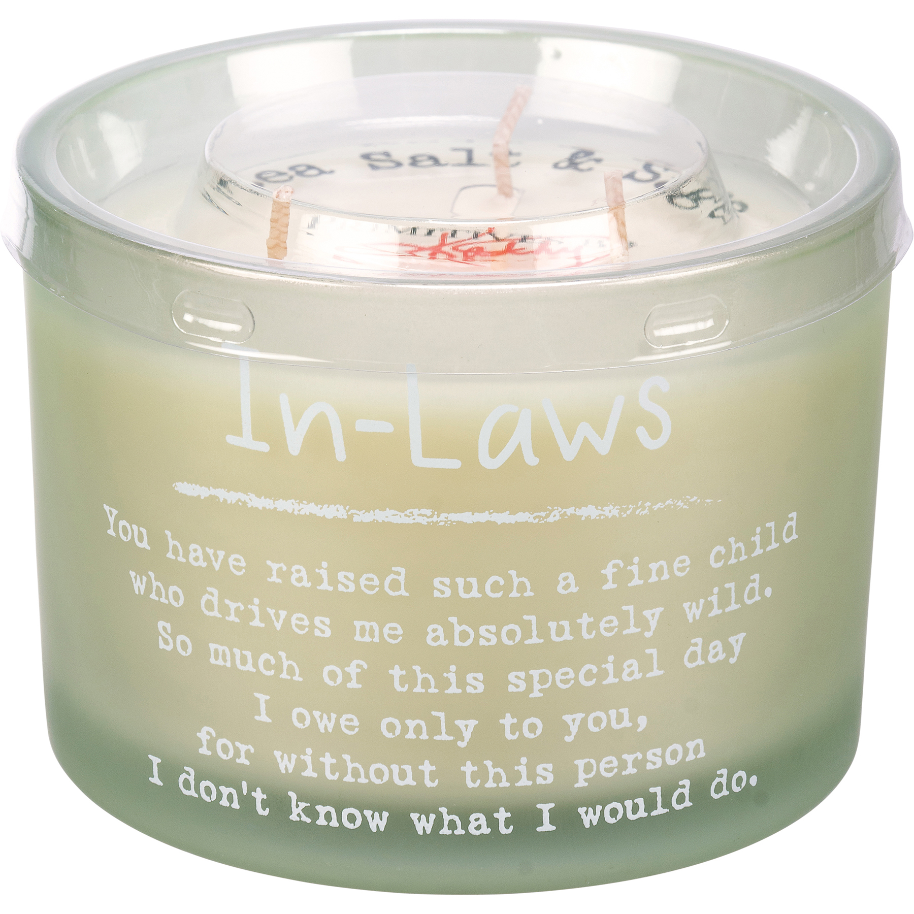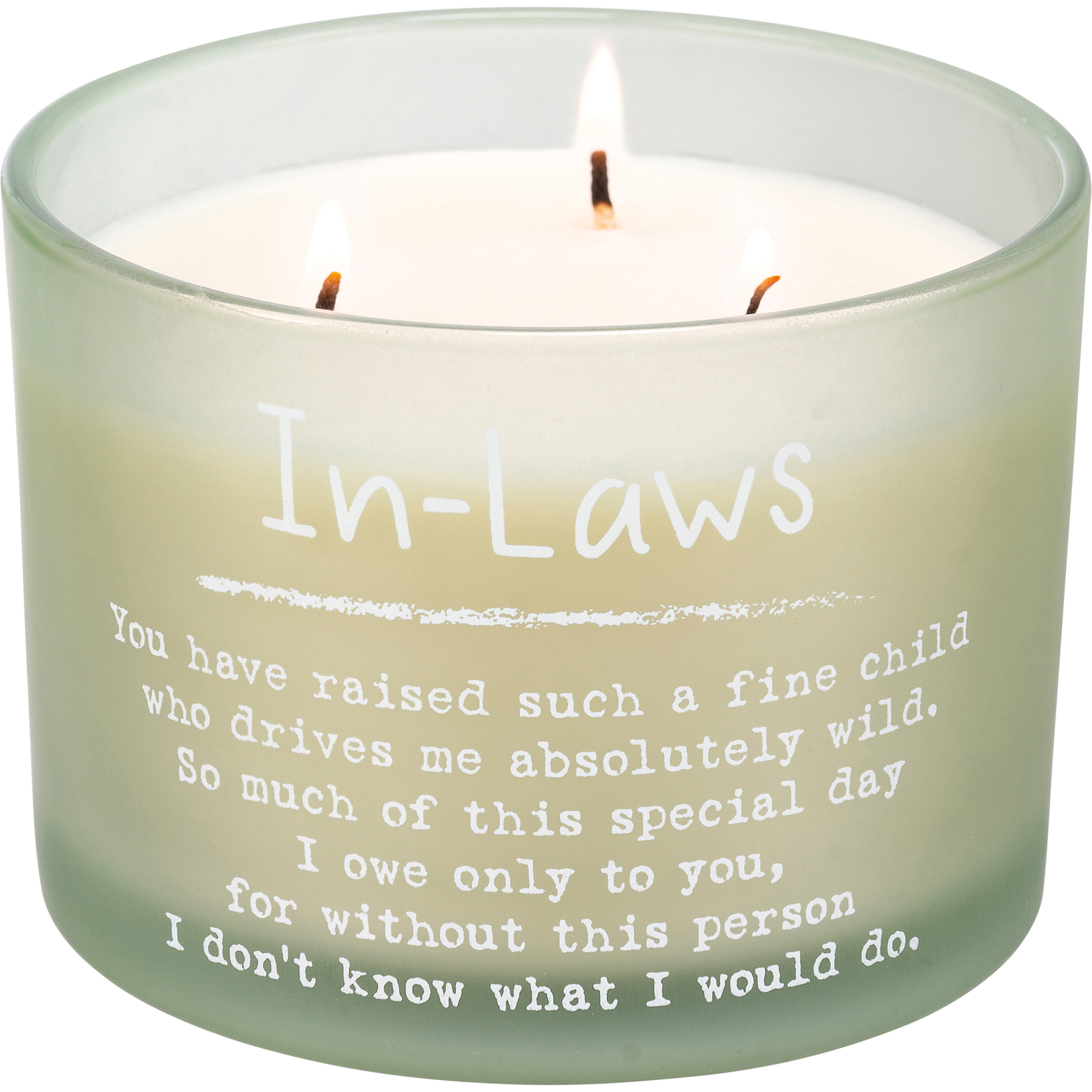 A green-colored frosted glass vessel holds this soy-based wax candle from our Wedding Collection featuring a refreshing sea salt and sage scent with "In-Laws You Have Raised Such A Fine Child Who Drives Me Absolutely Wild. So Much Of This Special Day I Owe Only To You, For Without This Person I Don't Know What I Would Do." sentiment. This 14 oz. candle makes a perfect gift. Our In-Laws candle contains three fabric wicks for a total of 30 hours of burn time. Includes a plastic wax cover for protection and a polished look.