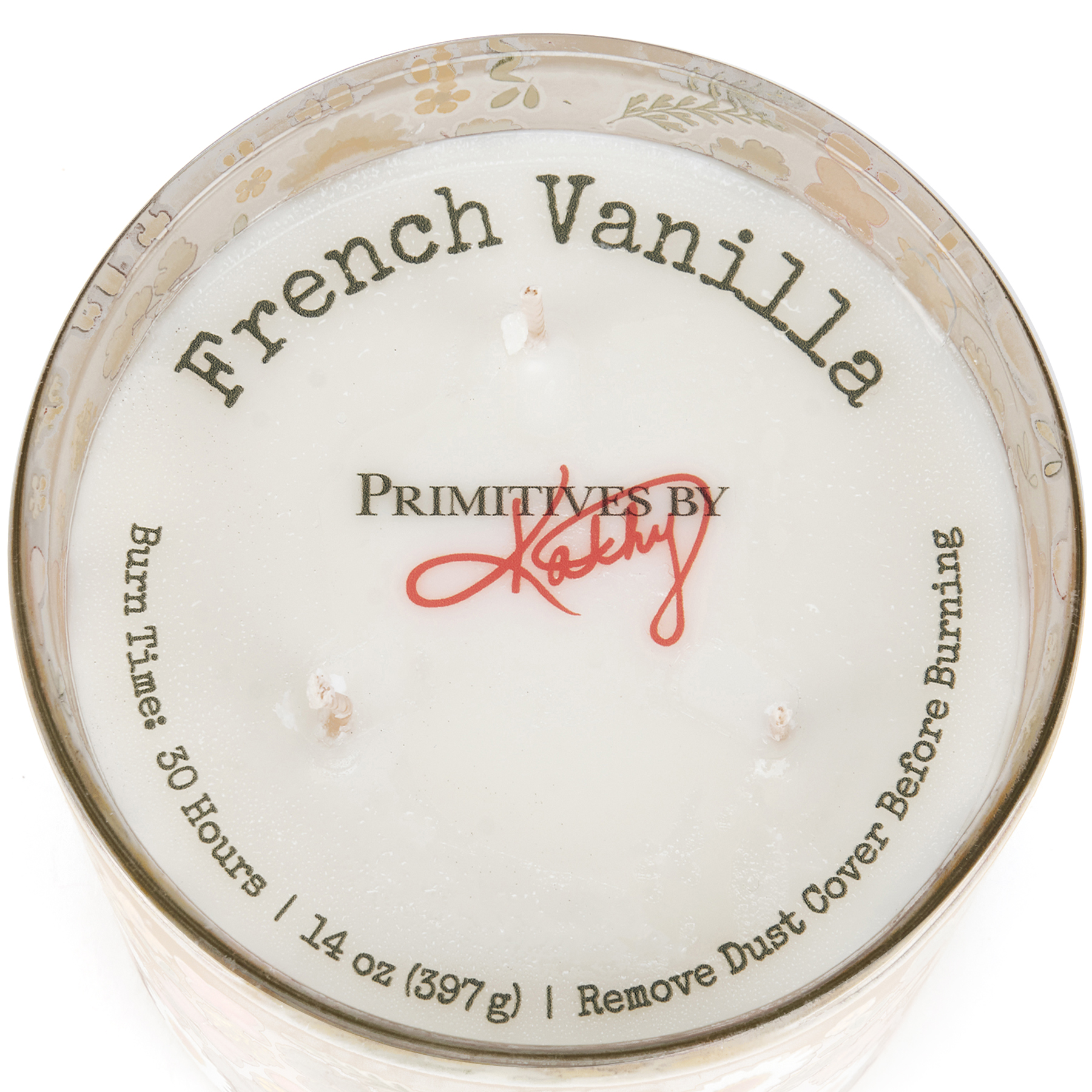 A jar candle from our Botanical Collection displaying a full wrap-around design of flowers inspired by pressed florals in an orange color palette on frosted white glass. Candle features soy-based wax and 3 fabric wicks with 30 hours of burn time activating a calming French Vanilla scent. Our Orange Flowers jar candle includes a dust cover and plastic lid for protection and polished appearance.