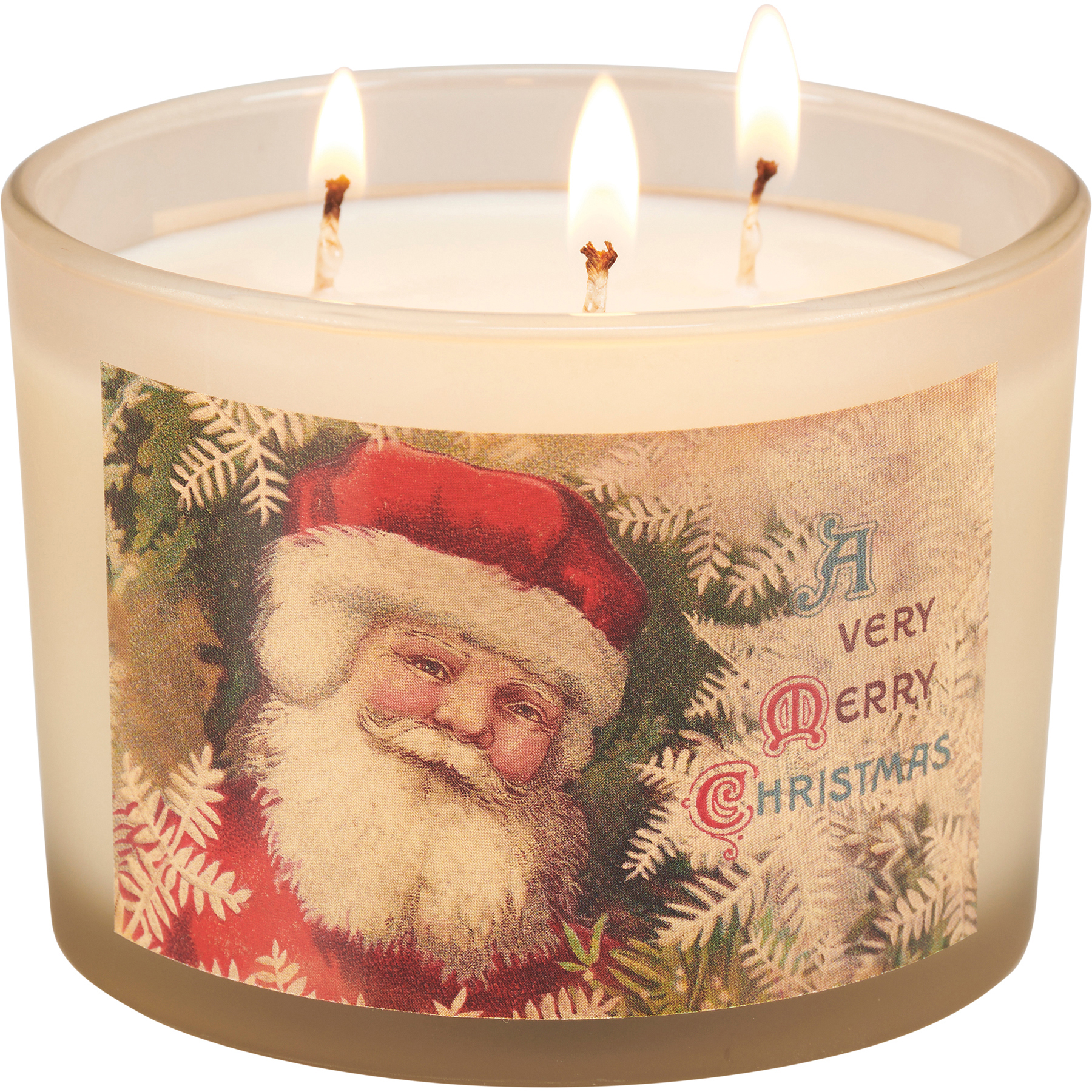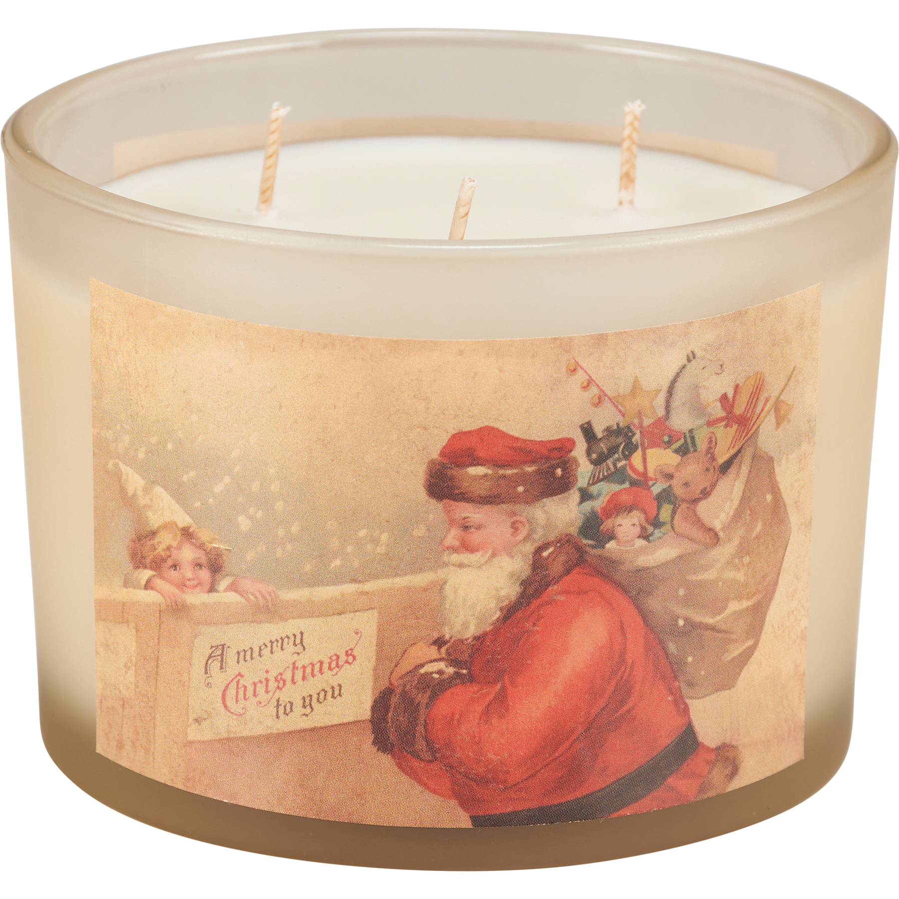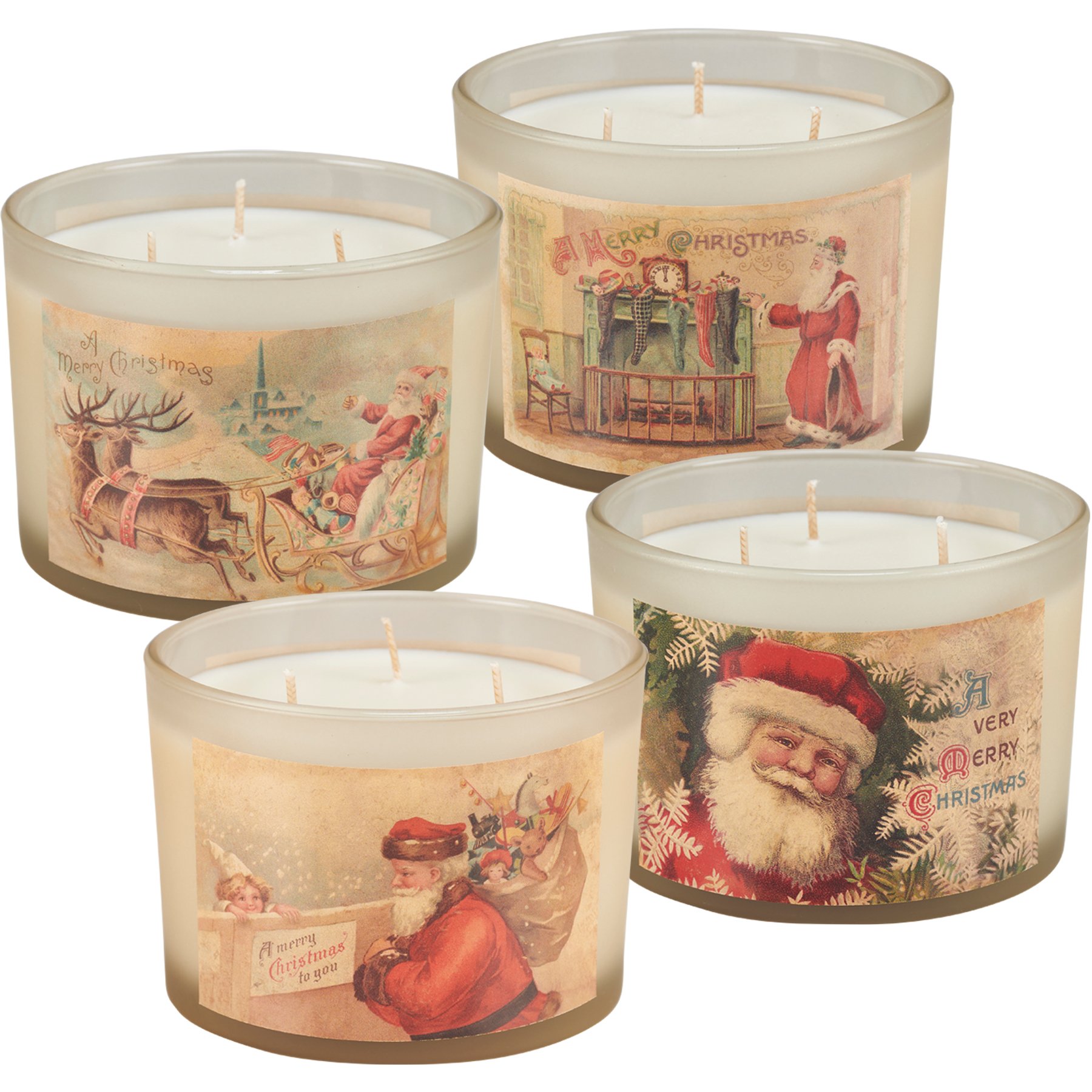 A set of four jar candles from our Christmas Collection displaying individual double-sided designs on a frosted glass jar. Each design features vintage scenes of Santa with various holiday sentiments. Candles feature soy-based wax and 3 fabric wicks with 30 hours of burn time activating a refreshing Evergreen or Peppermint scent. Two of each scent are included. Our Vintage Santas jar candle set includes dust covers and plastic lids for protection and polished appearance. A charming seasonal home accent set great for gifting.