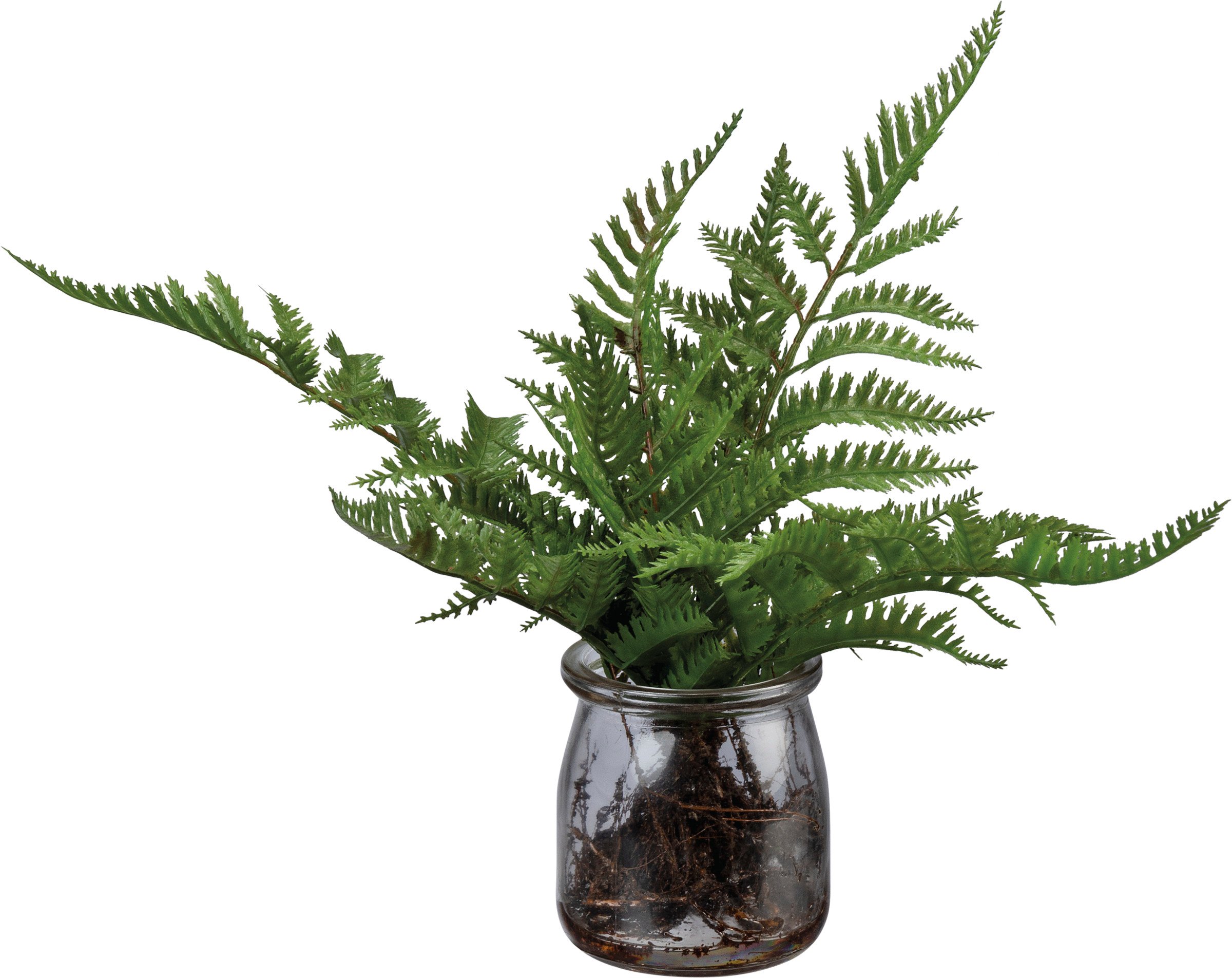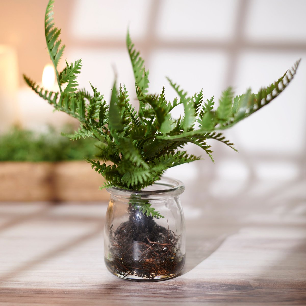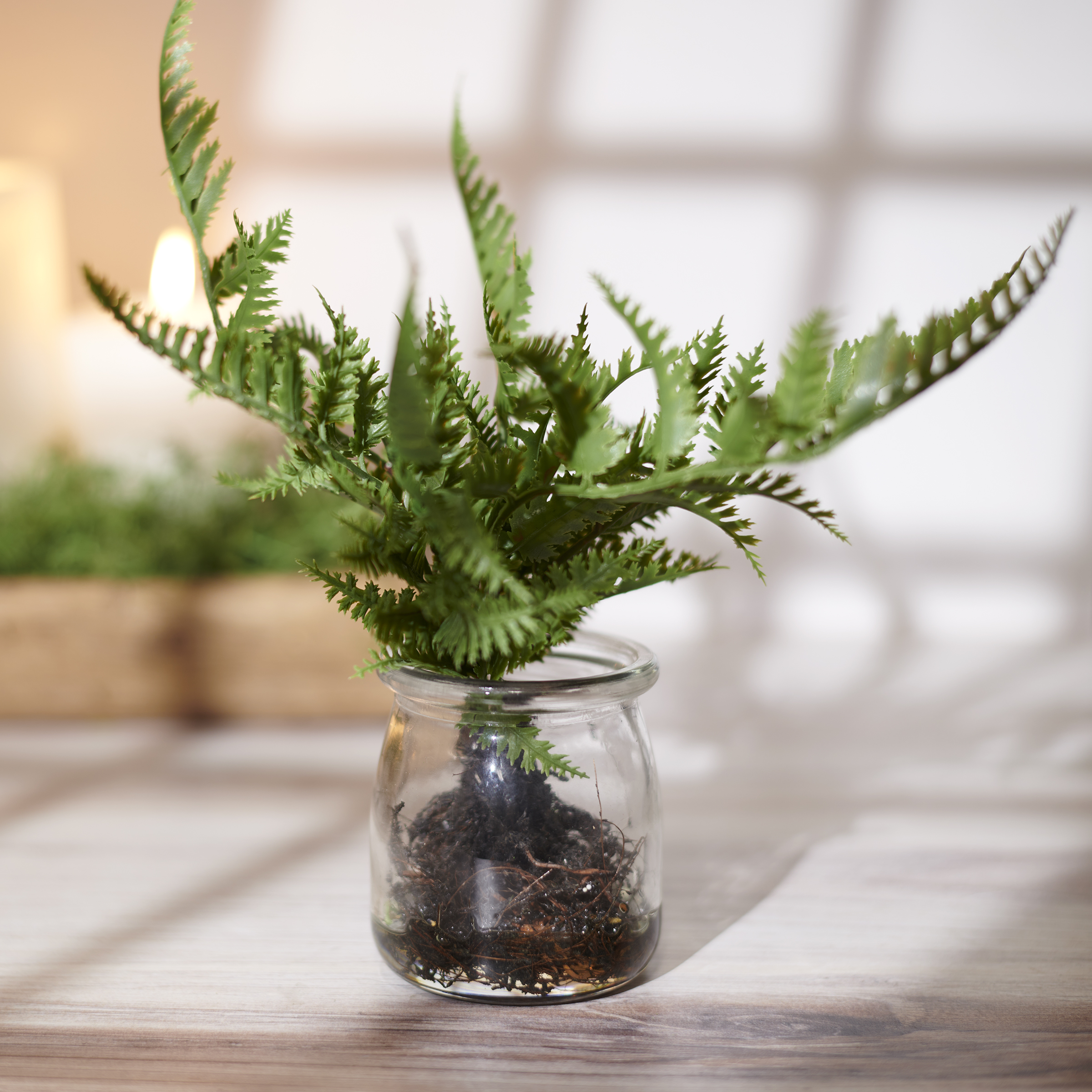 A glass jar planter featuring a botanical fern plant and stone details. Complements well with coordinating pieces in collection for a charming indoor garden.