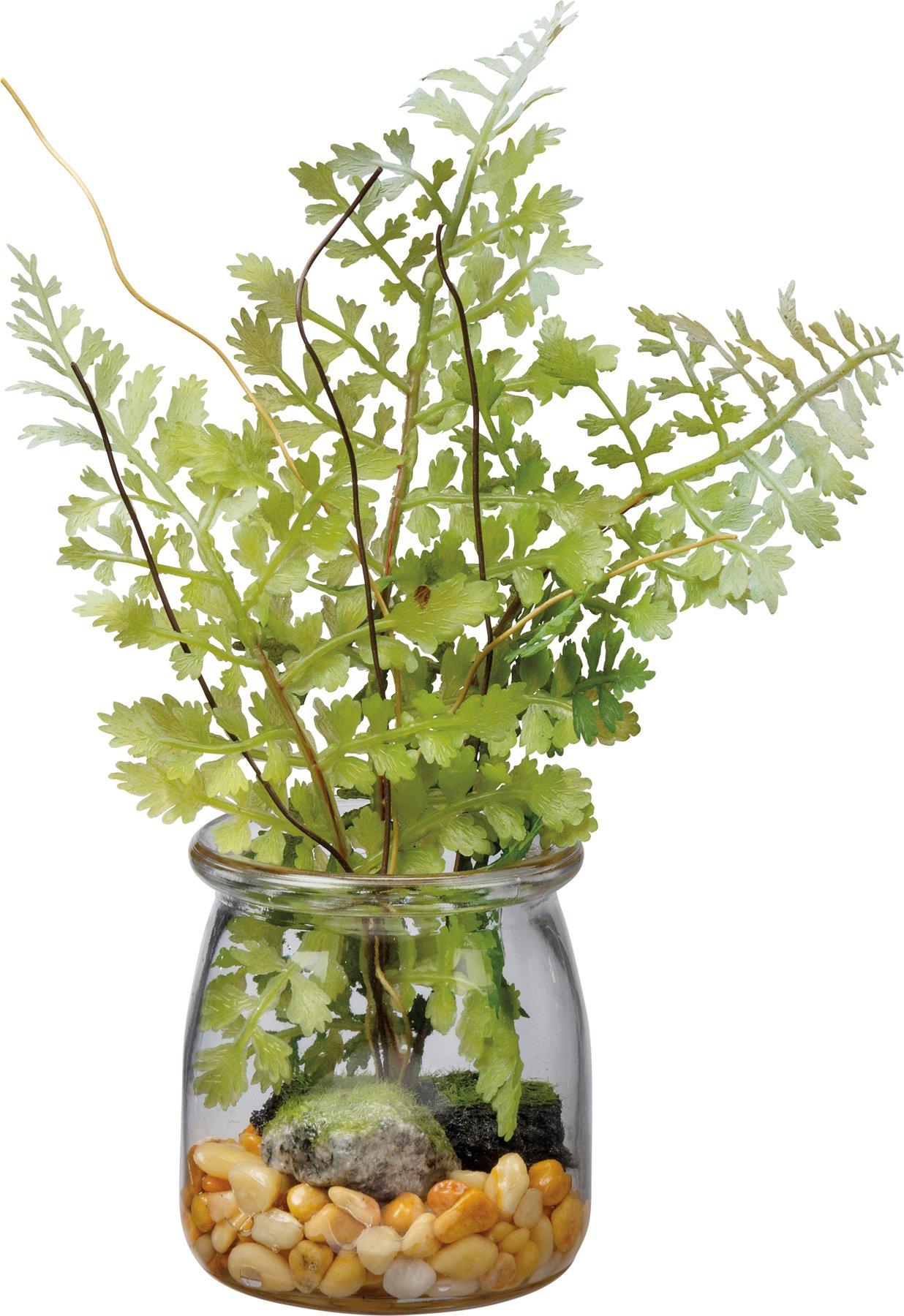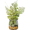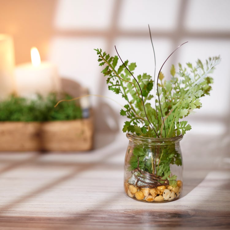 A small glass jar featuring a faux Maidenhair Fern plant with added stone details. Complements well with other pieces in collection to create a rich natural vibe in any space. Complete as shown.