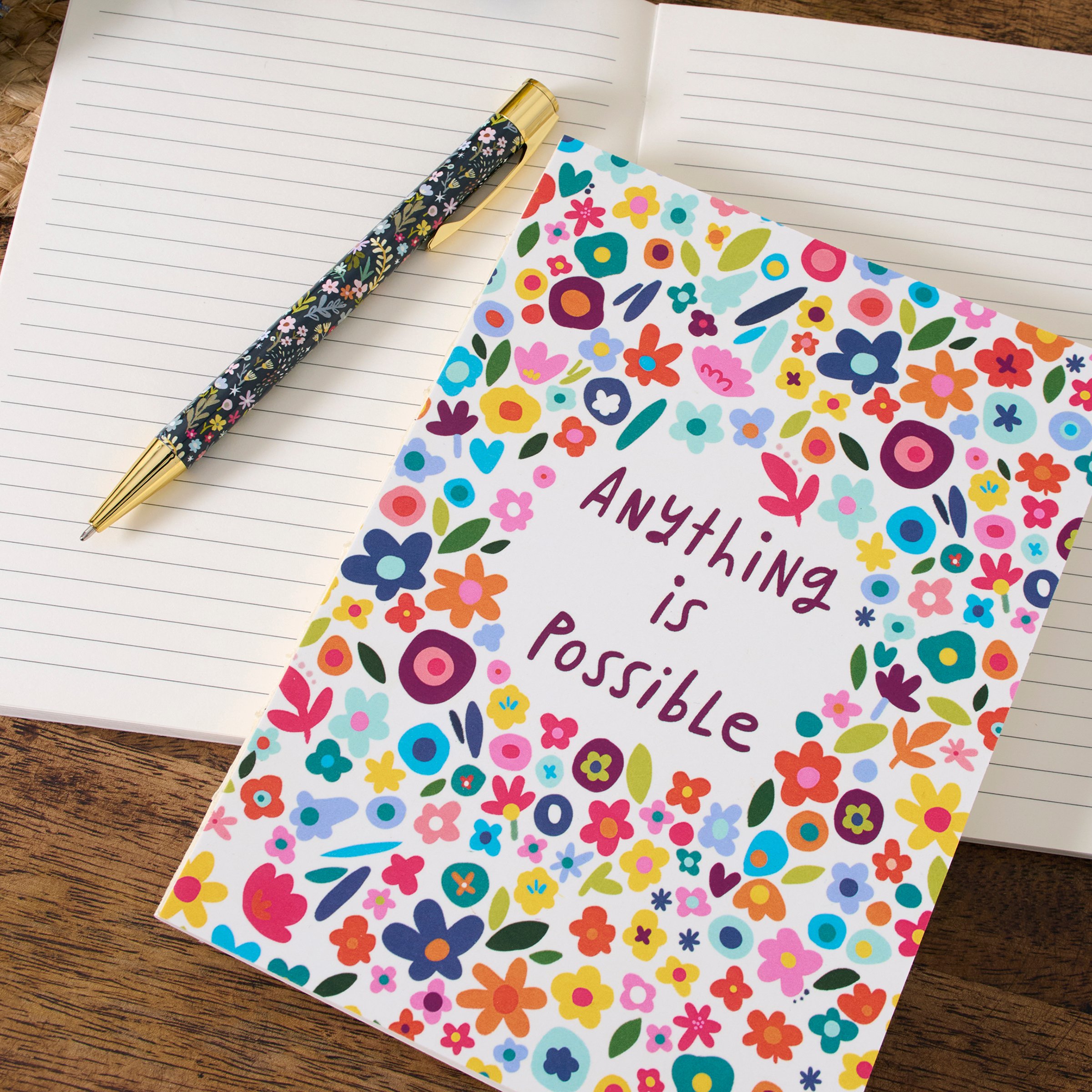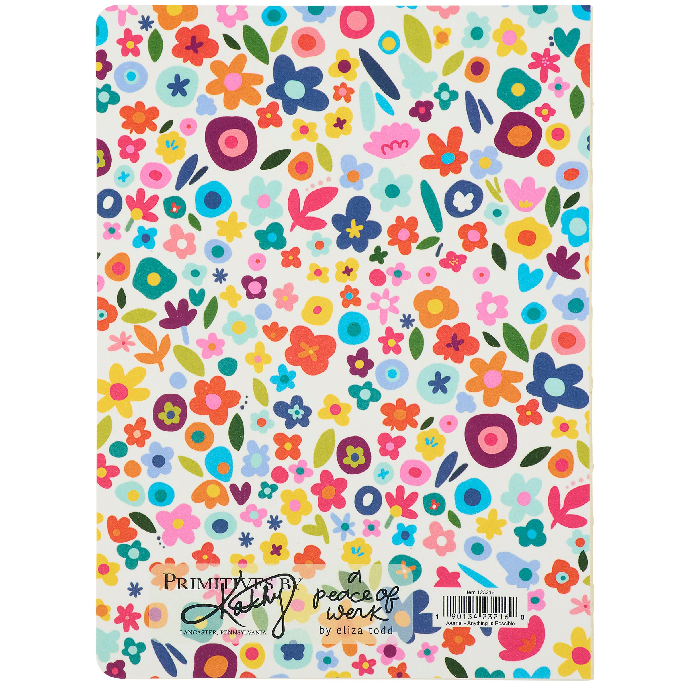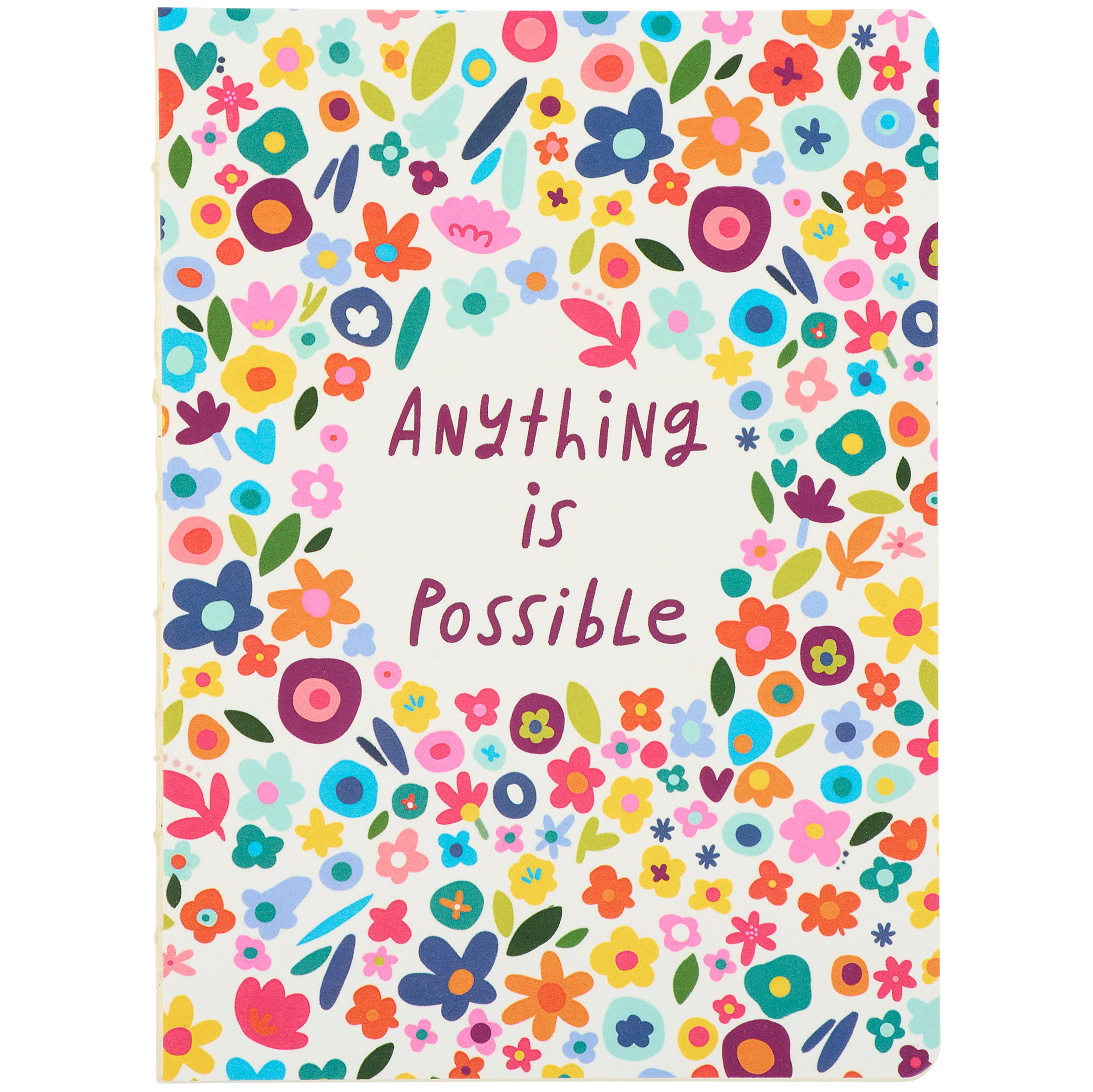 A double-sided journal from our Inspiration & Blooms Collection displaying colorful flower designs surrounding an inspirational sentiment that reads "Anything Is Possible" with coordinating flower designs on the back cover. Floral designs and sentiment are replicated from original hand illustrated artwork. Our Anything Is Possible journal includes 160 lined pages and an open spine to lay flat for easy use when writing. An inspirational gift perfect for a stylish everyday accessory and daily motivation.