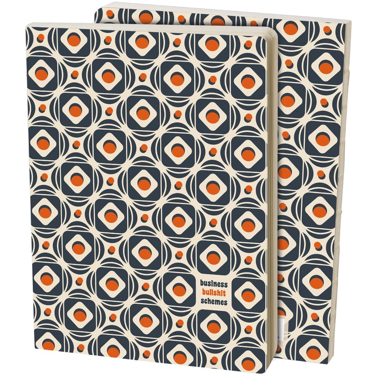 This sassy journal displays "Business Bullshit Schemes" with a stylish retro inspired pattern in a bold color palette perfect for writing those super secret plans for safe keeping. Questionables journals include 160 lined pages and an open spine to lay flat for easy use when writing. Our Business Schemes journal calls back to a retro style while also calling out a modern mentality and is great for gifting like-minded friends or family.