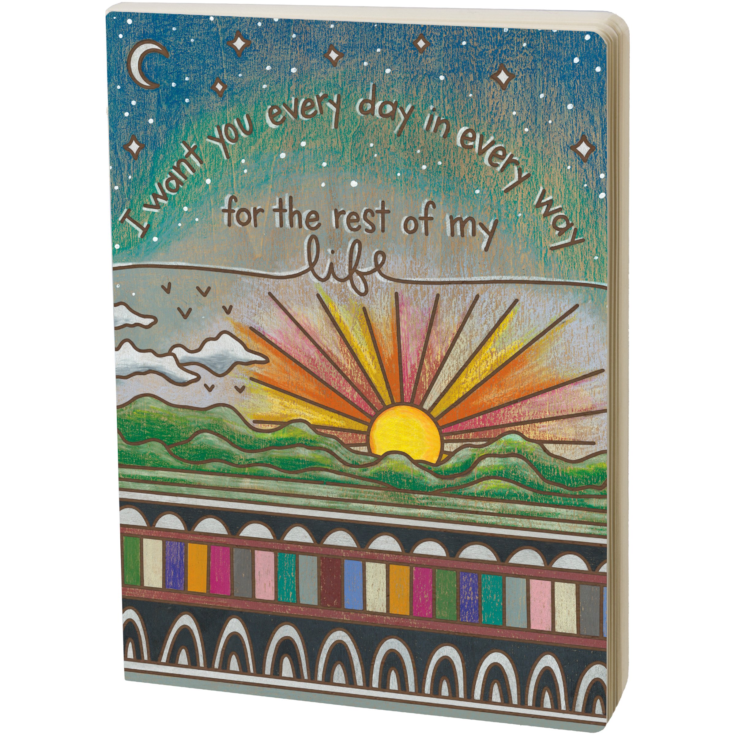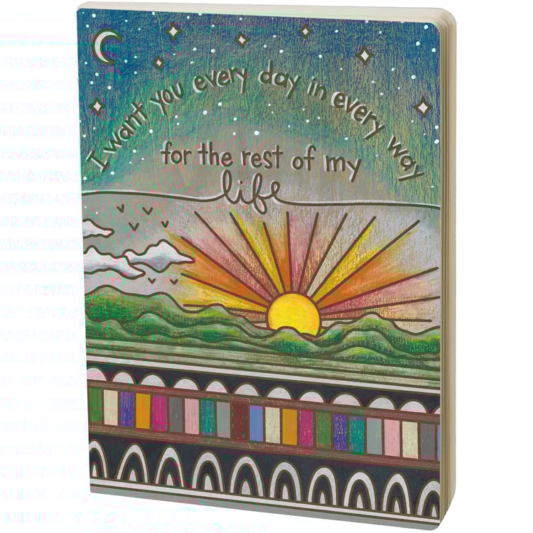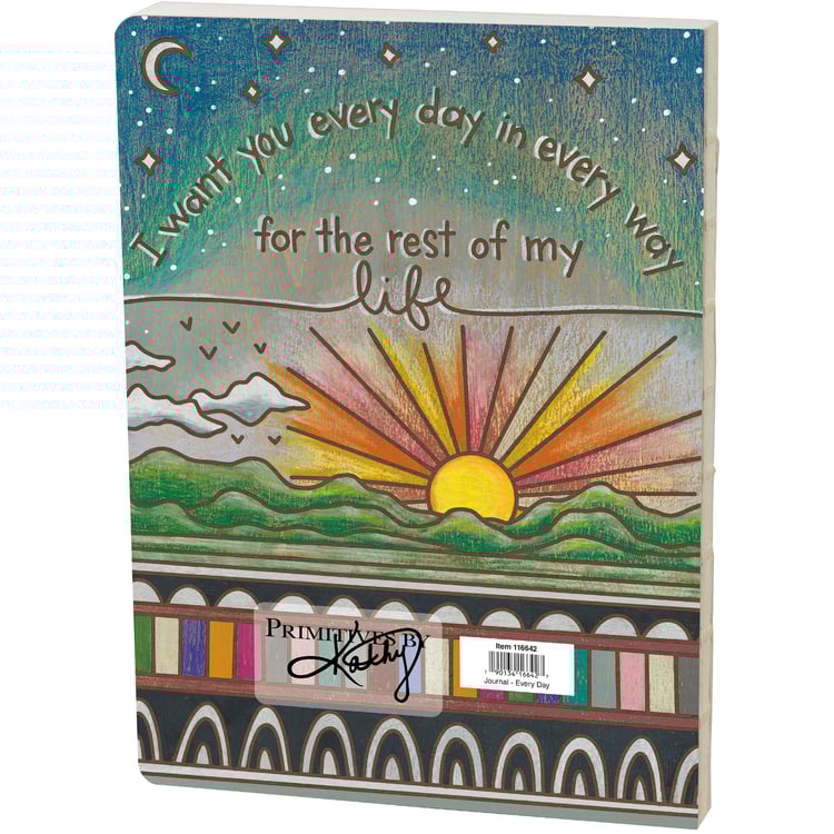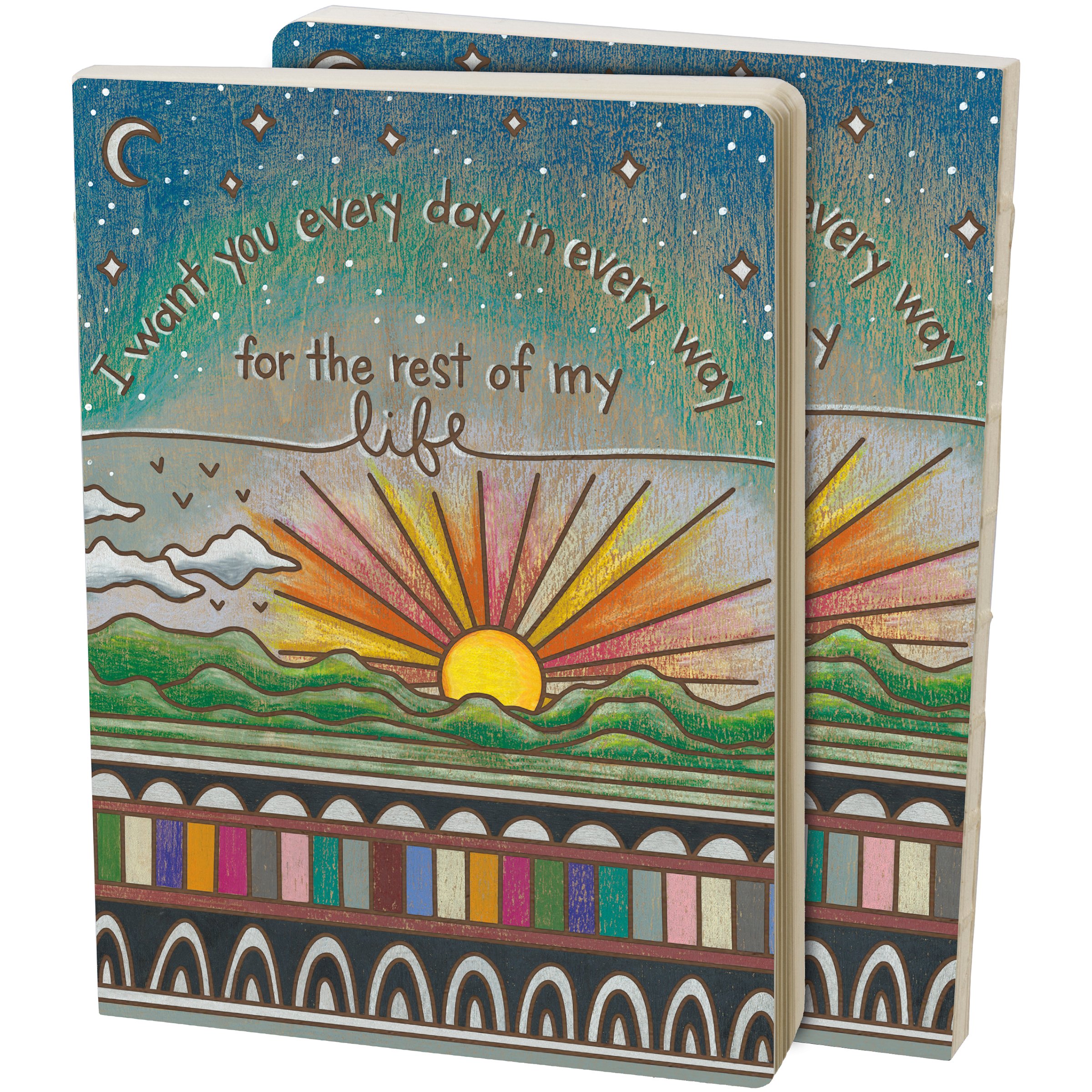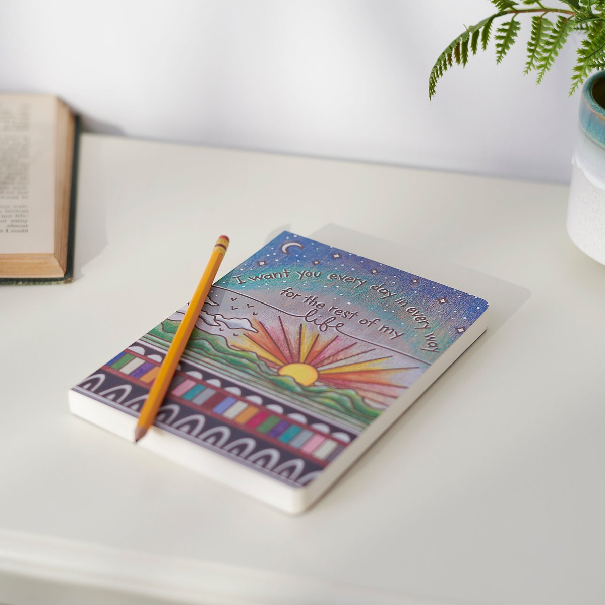 A double-sided journal from ourĀ Wood Burning Collection displaying a vibrant hand illustrated design of a horizon with sun, moon, and stars surrounding a heartwarming sentiment that reads "I Want You Every Day In Every Way For The Rest Of My Life." Design is replicated from original wood burned art. Our Every Day journal contains 160 lined pages and includes an open spine to lay flat for easy use. An inspirational gift perfect for an everyday accessory.