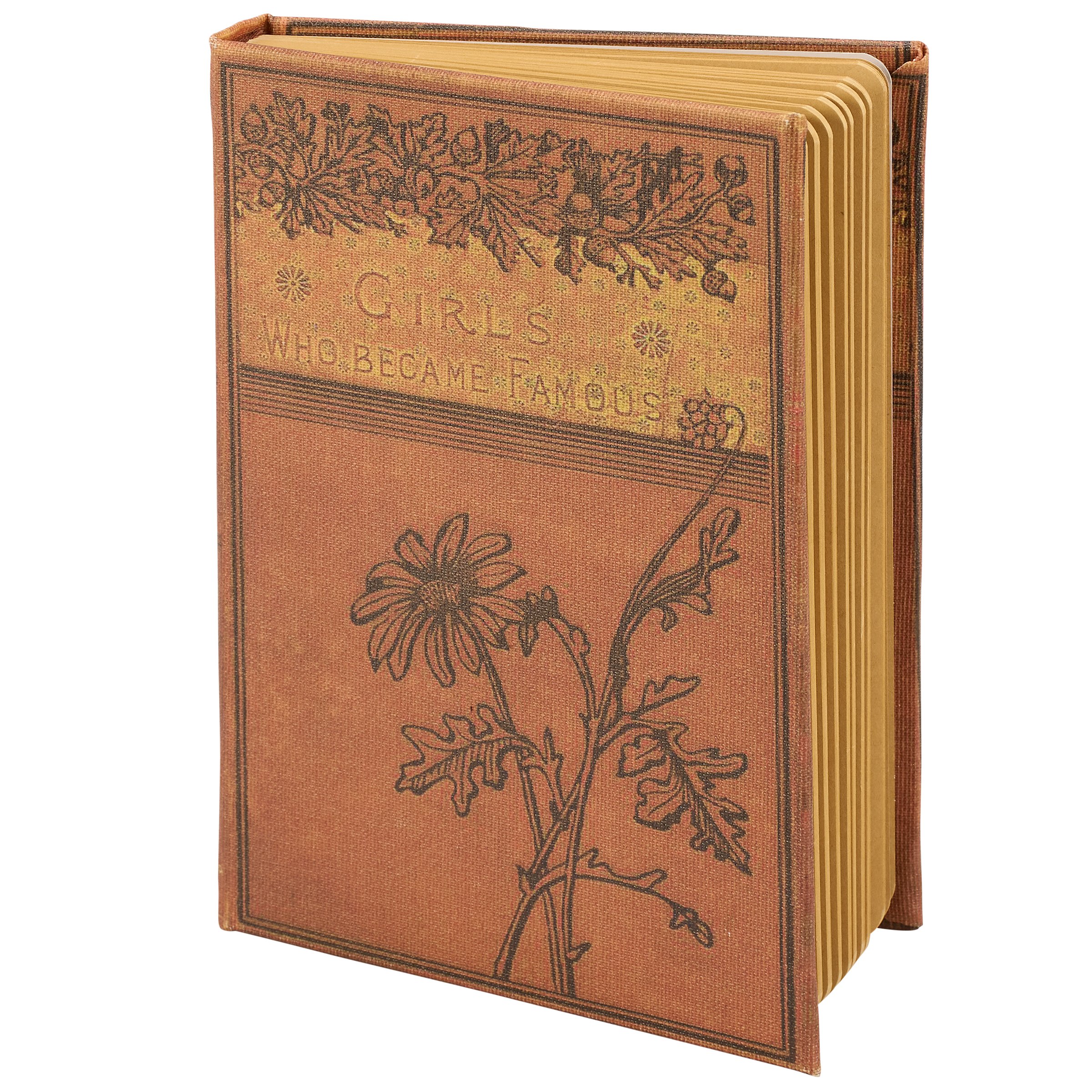 A high-quality decorative journal from our Dark Academia Collection displaying a vintage book inspired double-sided design. Vintage book design features a textured linen wrap with illustrated florals and book title that reads "Girls Who Became Famous." Journal spine also displays a coordinating design with book title and author to give the appearance of a book when on a shelf. Our Famous Girls journal includes 170 lined pages on vintage style paper to complete the aged appearance. A vintage book-themed gift perfect for any home office or desk.