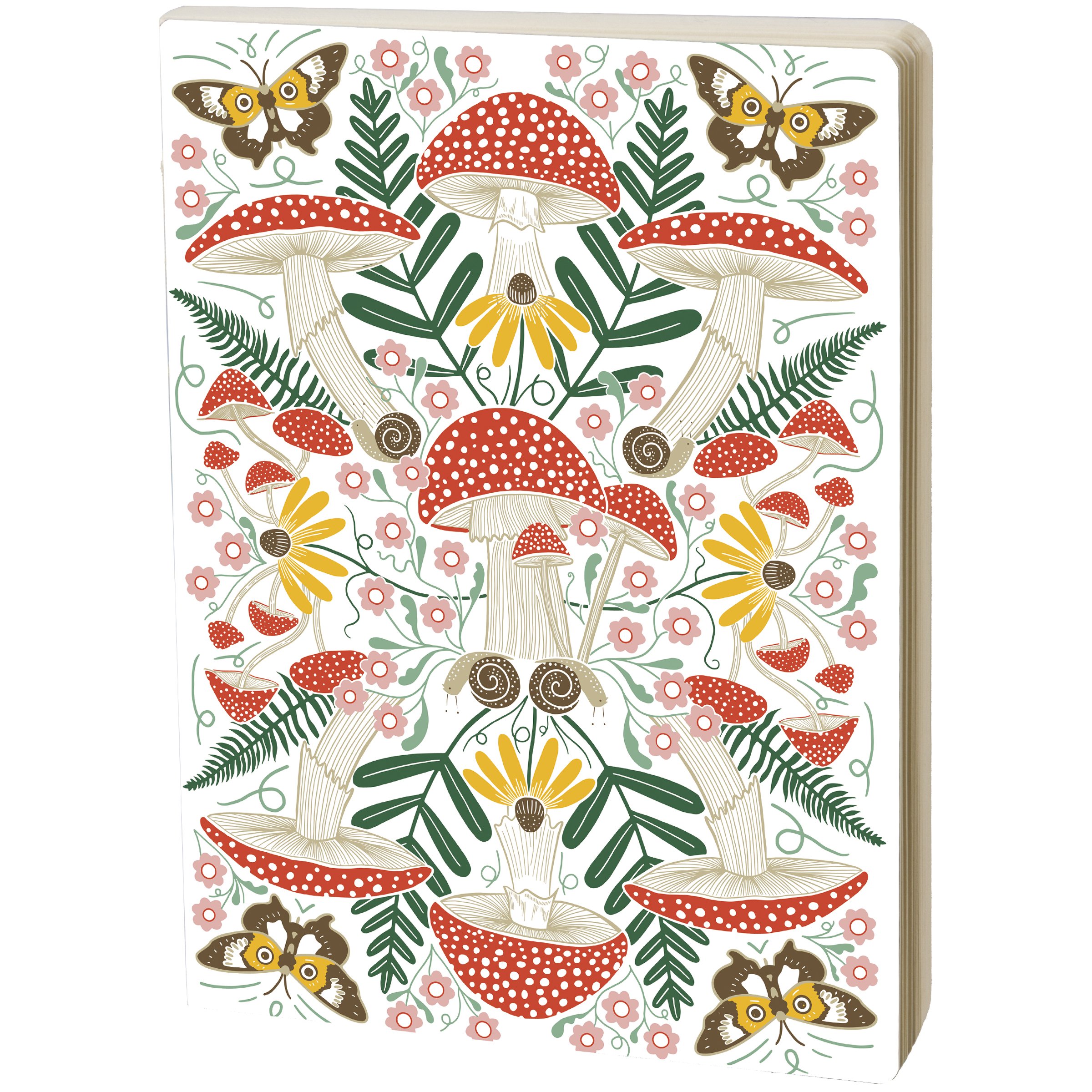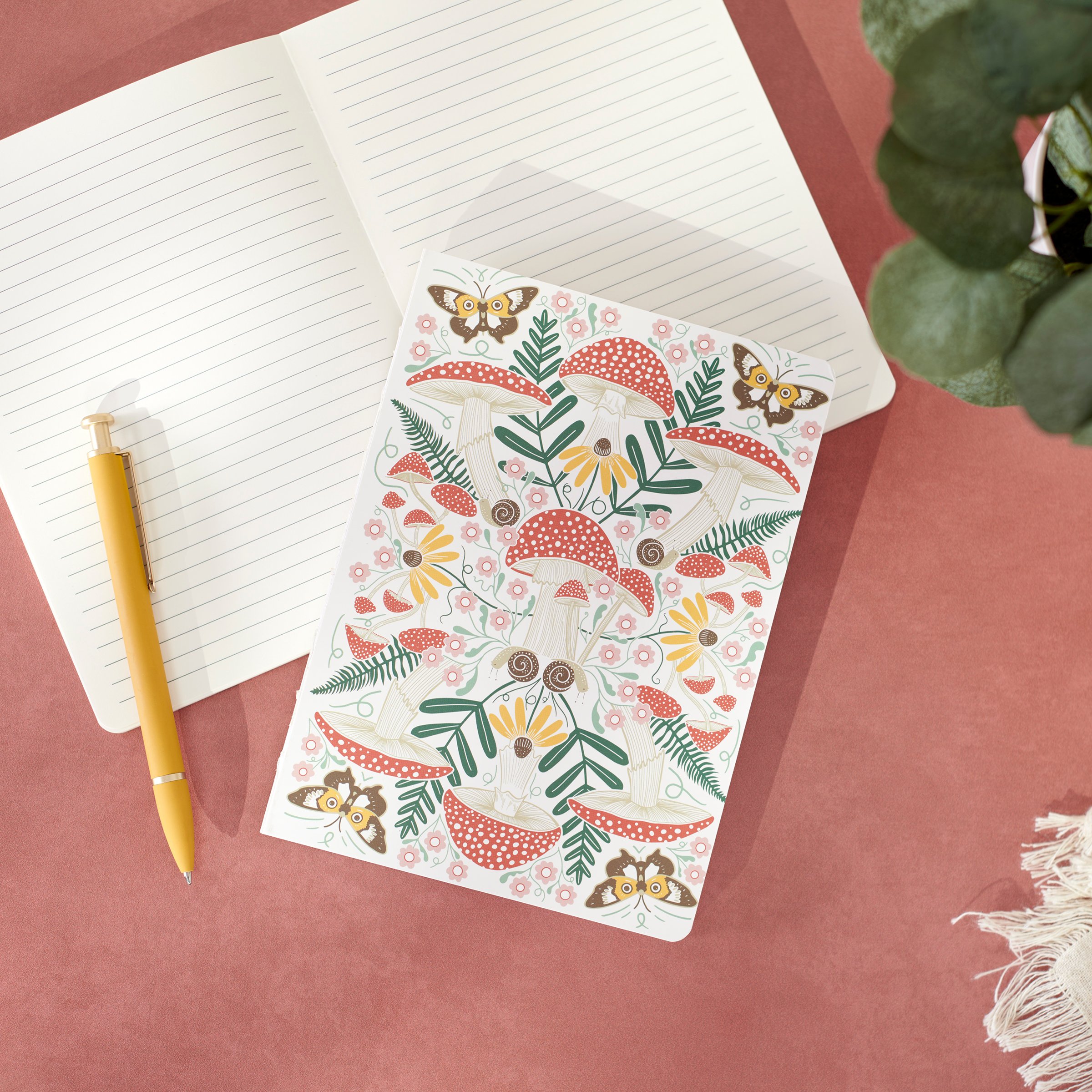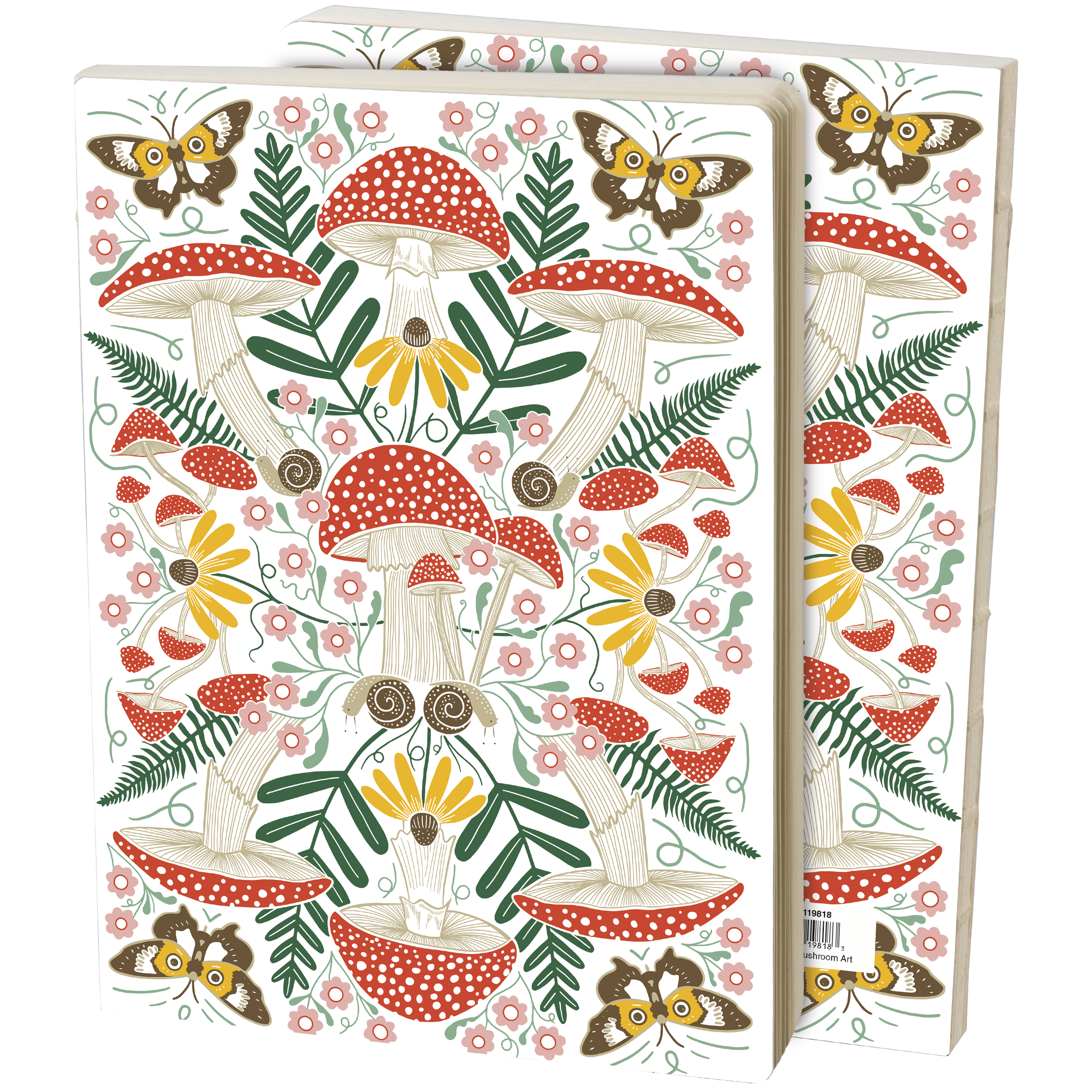 A double-sided journal from our Cottagecore Collection displaying nature inspired patterns of mushrooms, flowers, and butterflies on the front and back. Nature designs are replicated from original hand illustrated artwork inspired by folk art. Our Mushroom Art journal includes 160 lined pages and an open spine to lay flat for easy use when writing. A stylish nature-themed gift perfect for an everyday accessory.