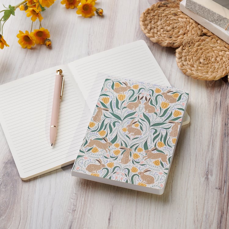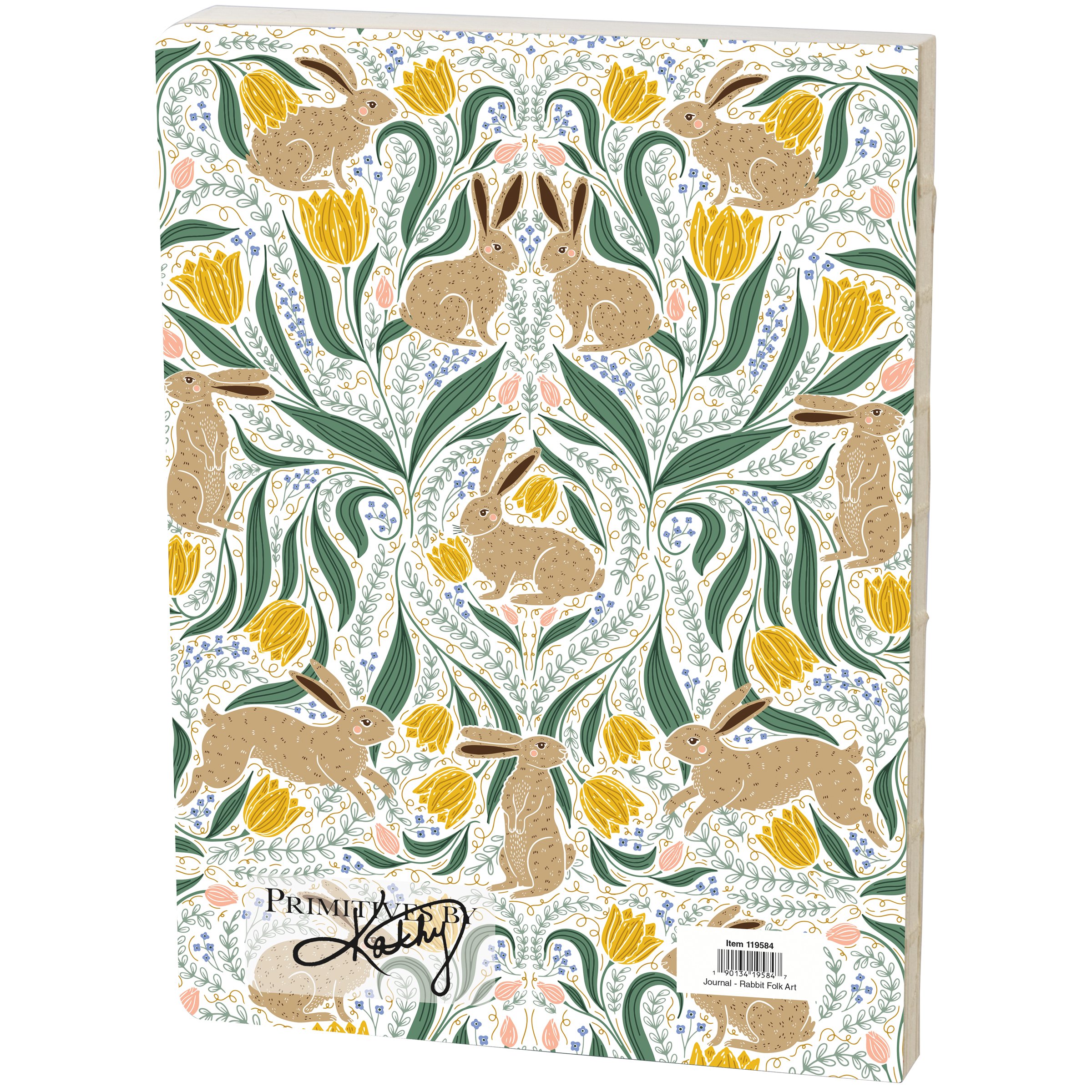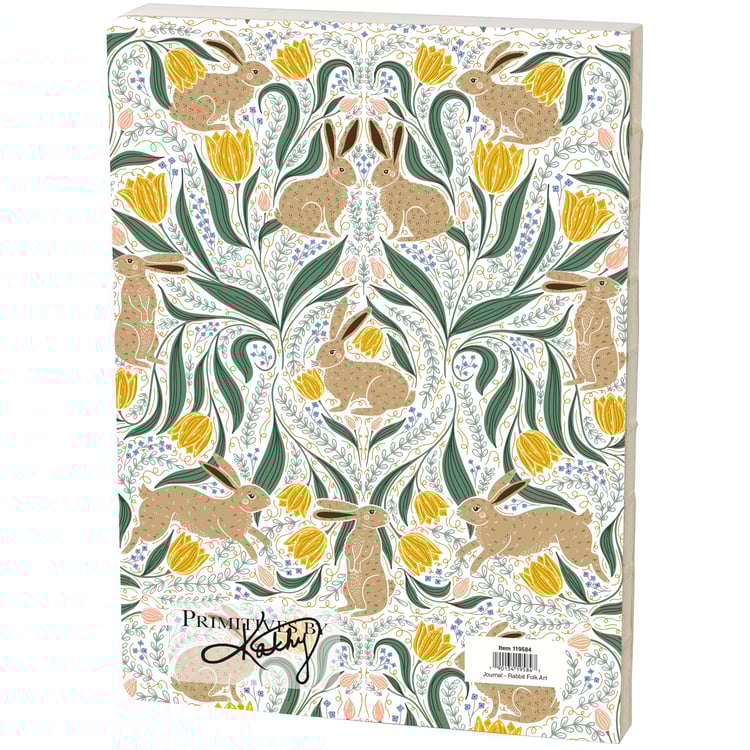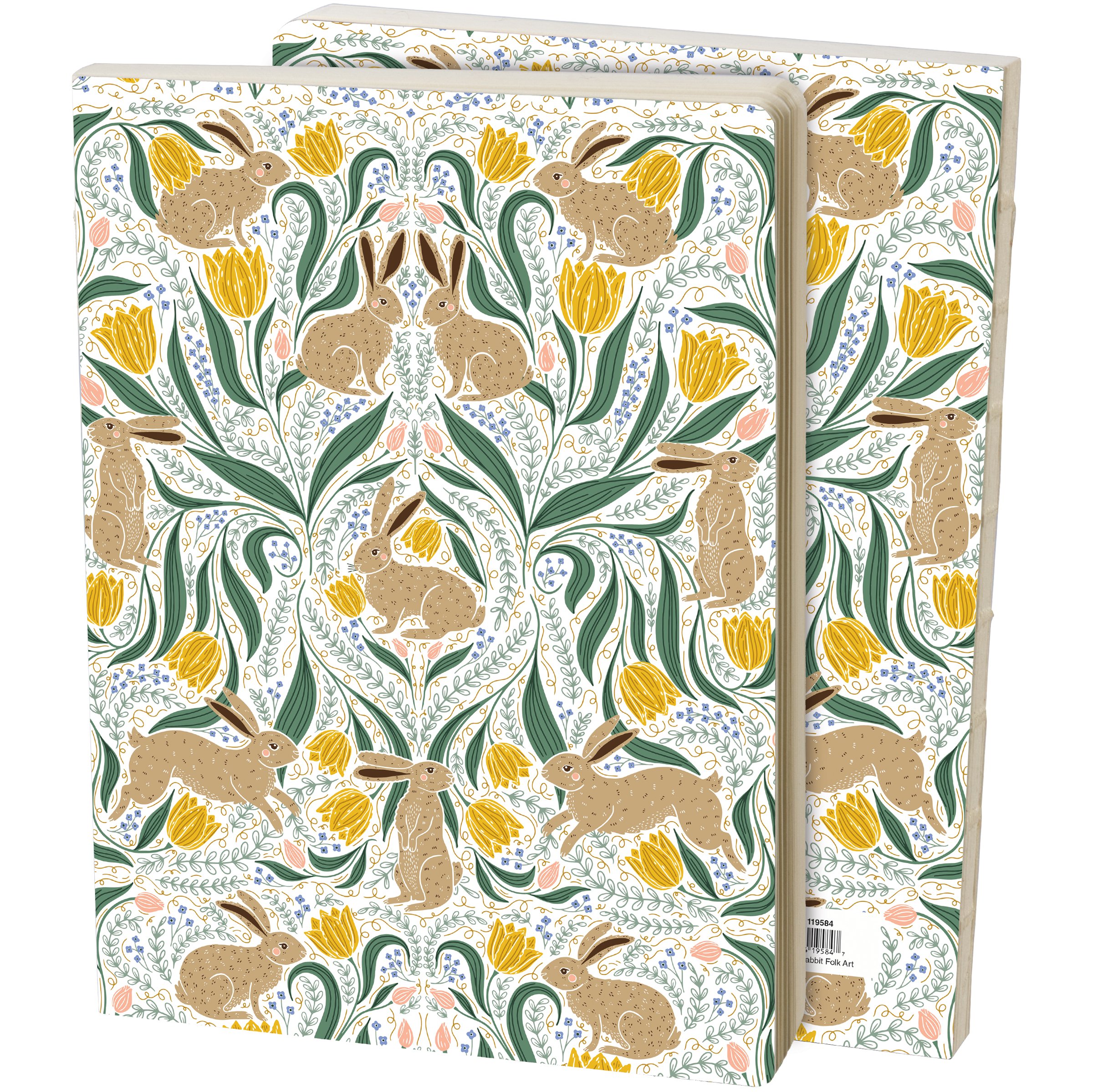 A double-sided journal from our Easter & Spring Collection displaying various charming rabbit designs complemented by spring flowers on the front and back. Designs are replicated from original hand illustrated artwork inspired by folk art. Our Rabbit Folk Art journal includes 160 lined pages and an open spine to lay flat for easy use. A stylish gift perfect for a seasonal accessory.