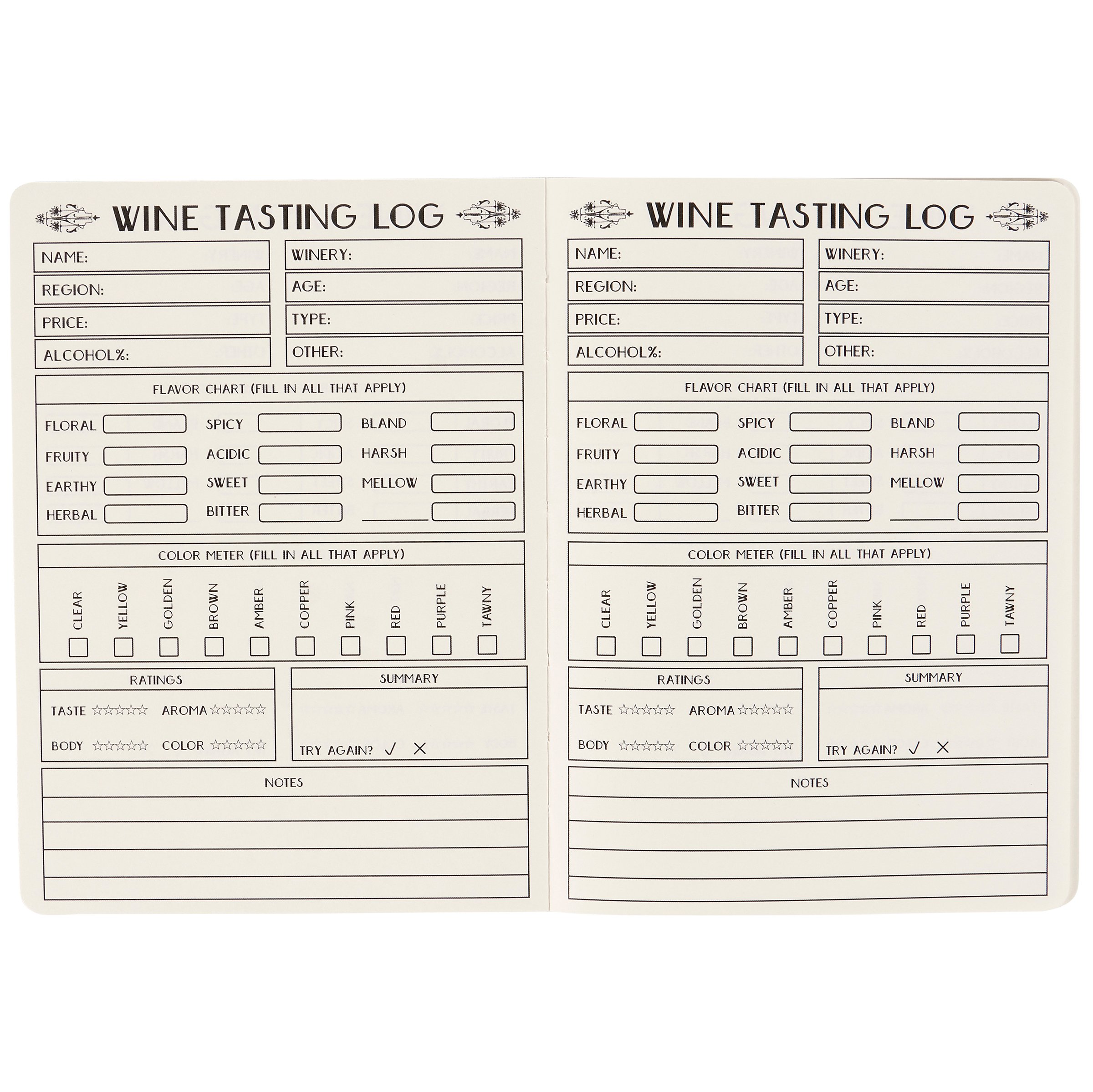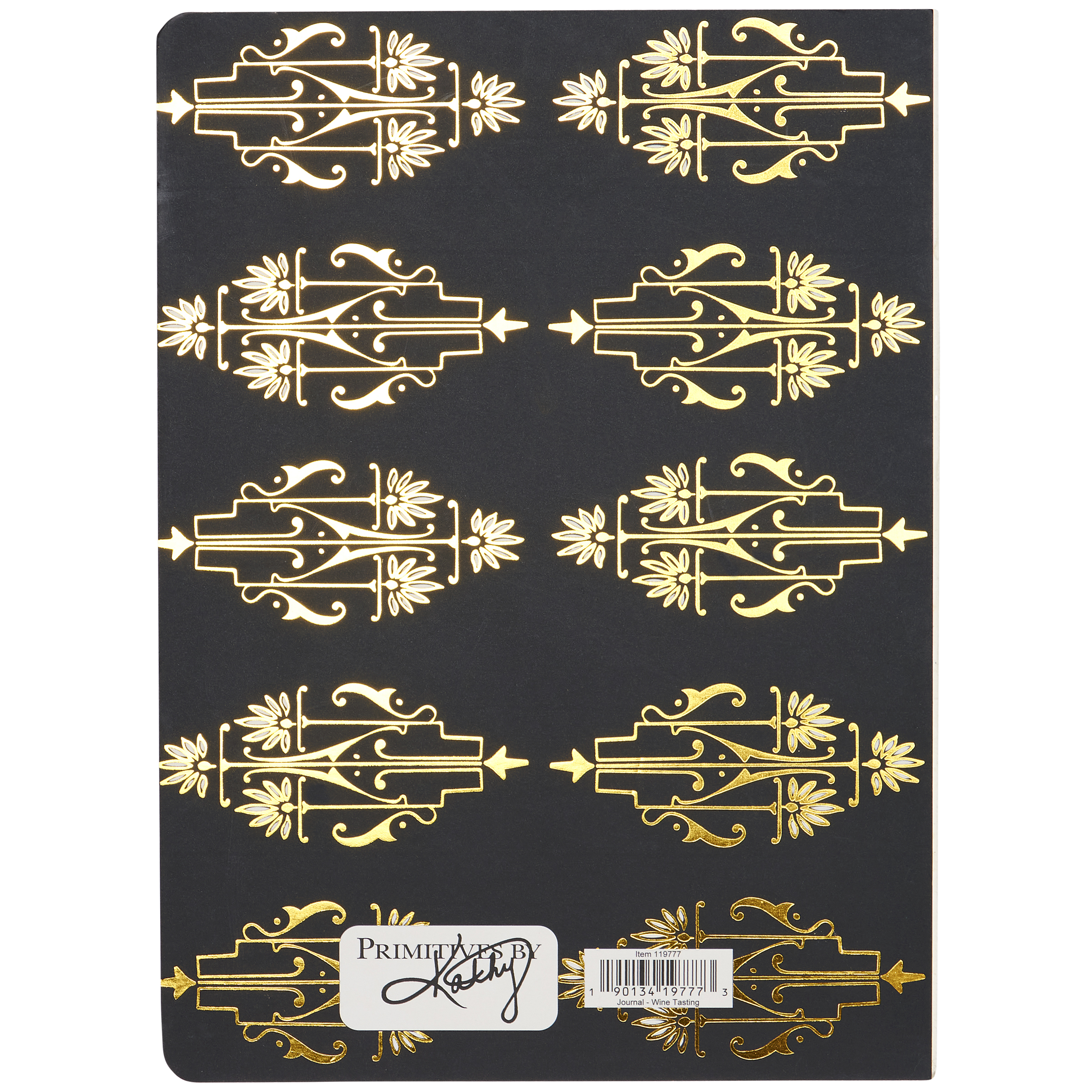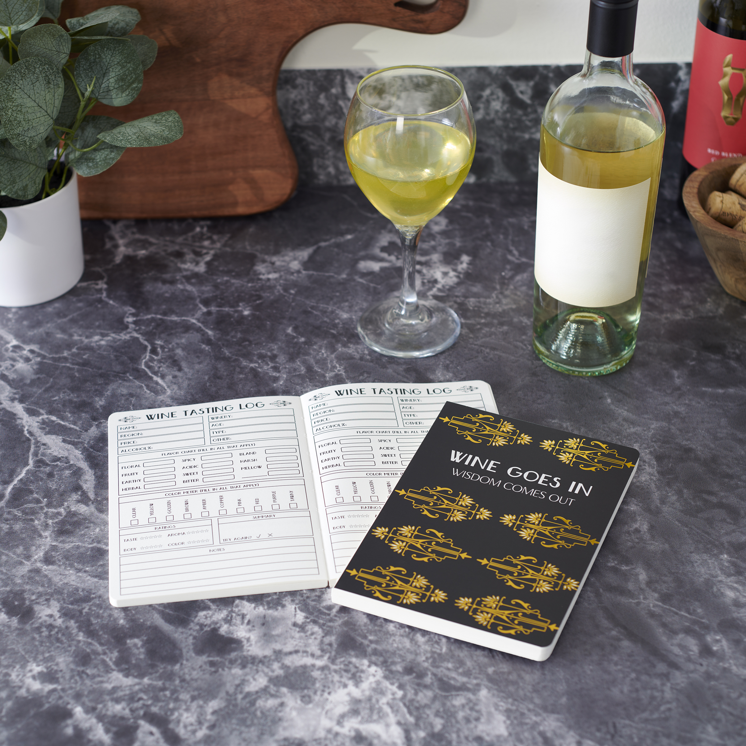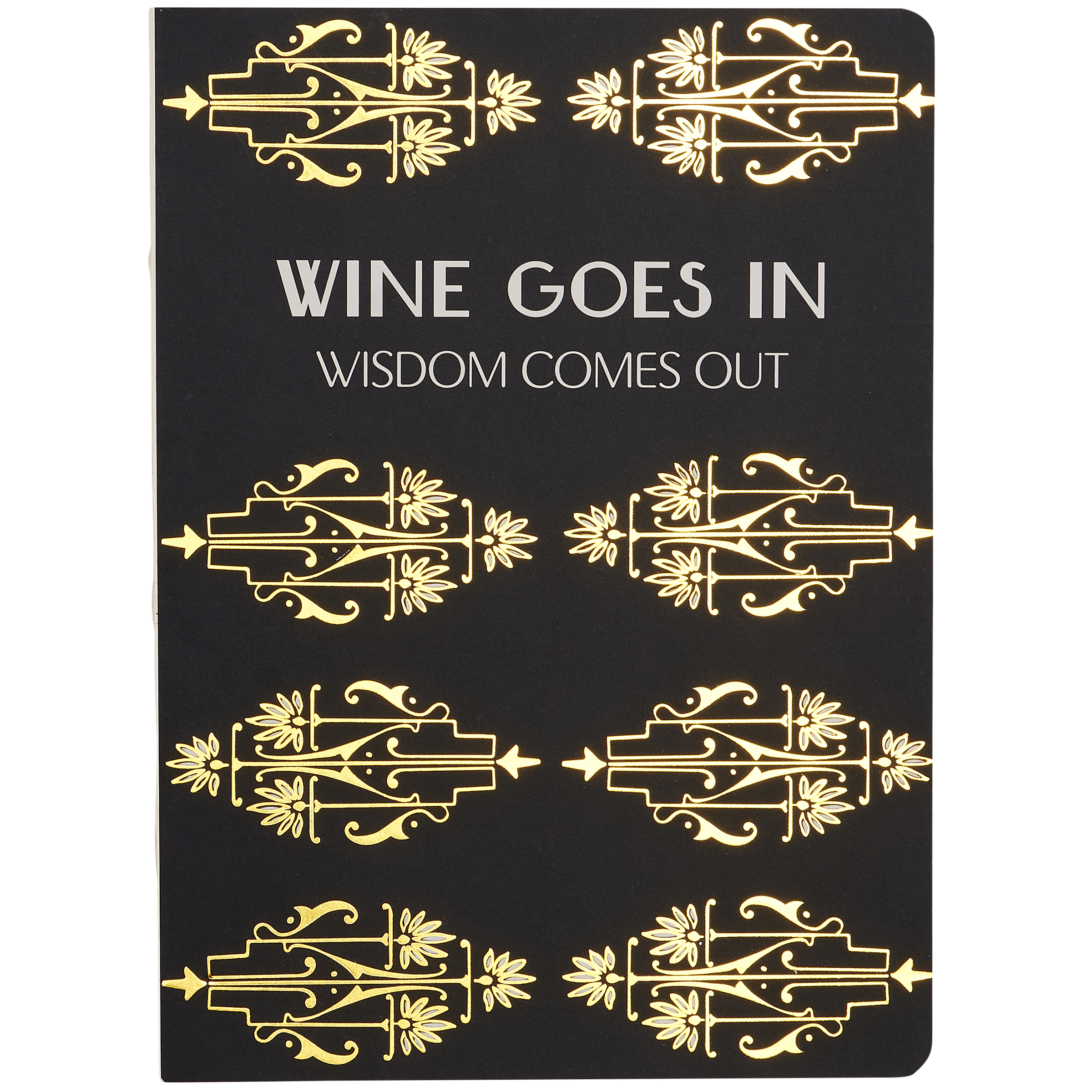 A double-sided journal from our Art Deco Collection featuring a wine tasting log design. Front and back journal covers display an art deco inspired pattern with gold metallic accents as well as a fun wine-themed sentiment that reads "Wine Goes In - Wisdom Comes Out." Our Wine Tasting journal contains an owner information page on the inside cover with 160 pages of guided wine tasting notes and an open spine to lay flat for easy use when writing. A fun wine-themed gift perfect for capturing a wine tasting journey.