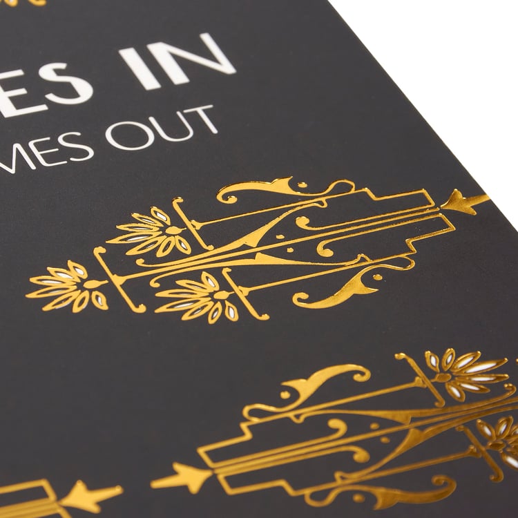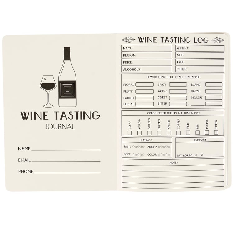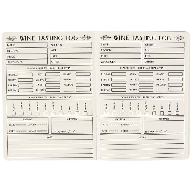 A double-sided journal from our Art Deco Collection featuring a wine tasting log design. Front and back journal covers display an art deco inspired pattern with gold metallic accents as well as a fun wine-themed sentiment that reads "Wine Goes In - Wisdom Comes Out." Our Wine Tasting journal contains an owner information page on the inside cover with 160 pages of guided wine tasting notes and an open spine to lay flat for easy use when writing. A fun wine-themed gift perfect for capturing a wine tasting journey.