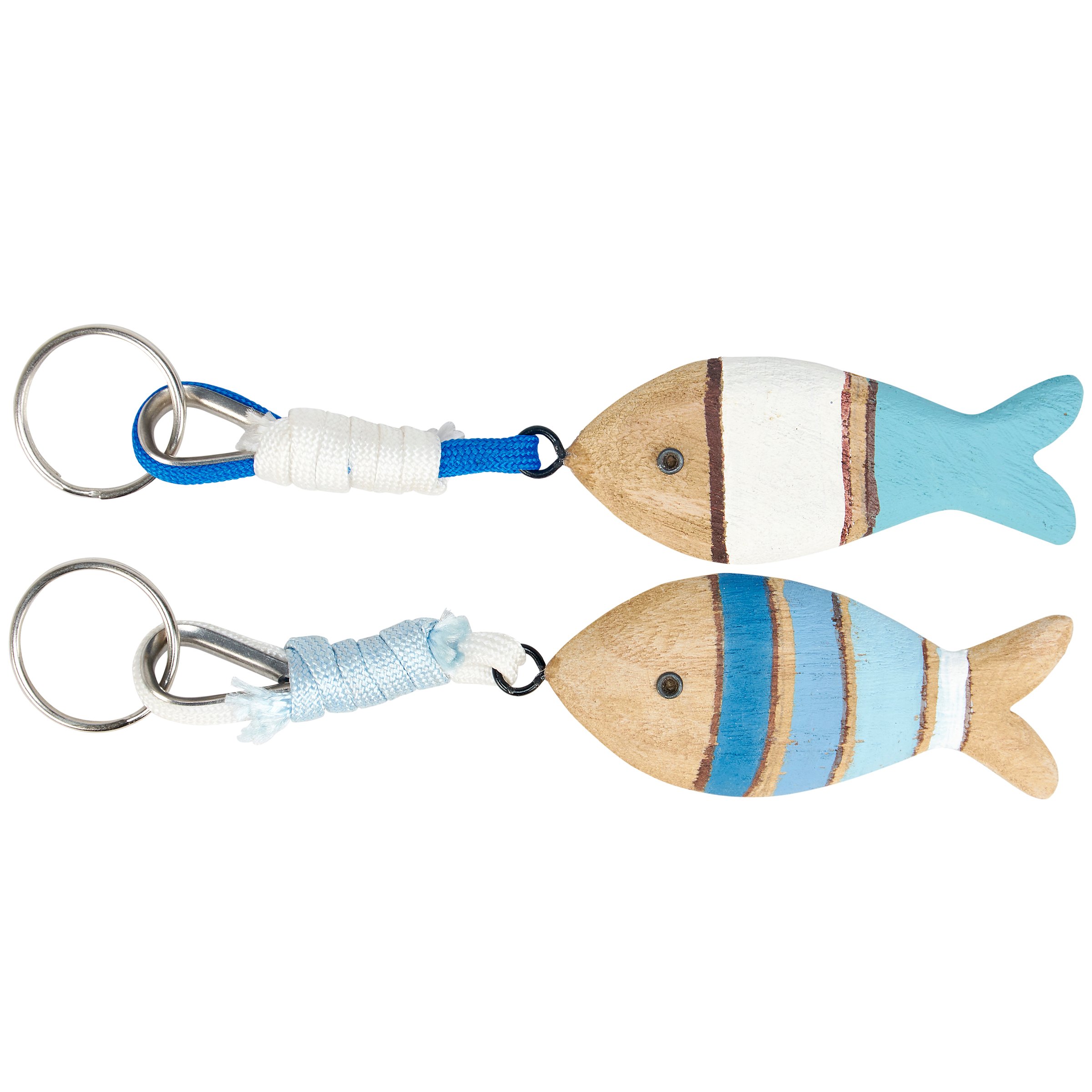 A set of 2 wooden keychains from our Beach Collection displaying individual rustic fish designs with painted details and metal hardware accents for a handmade aesthetic. Each rustic fish features a metal loop attached to a twine wrapped chain with a keyring to attach to zippers, keys, and more. Our Wooden Fish keychain set is a rustic beach-themed gift perfect for an everyday accessory.