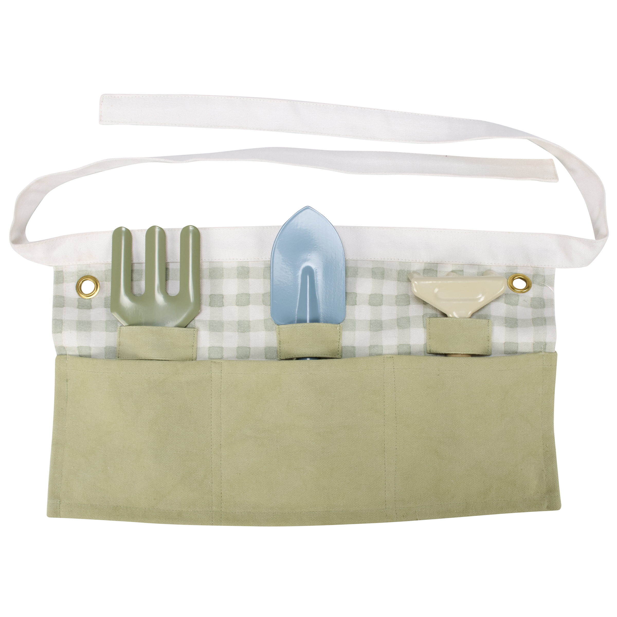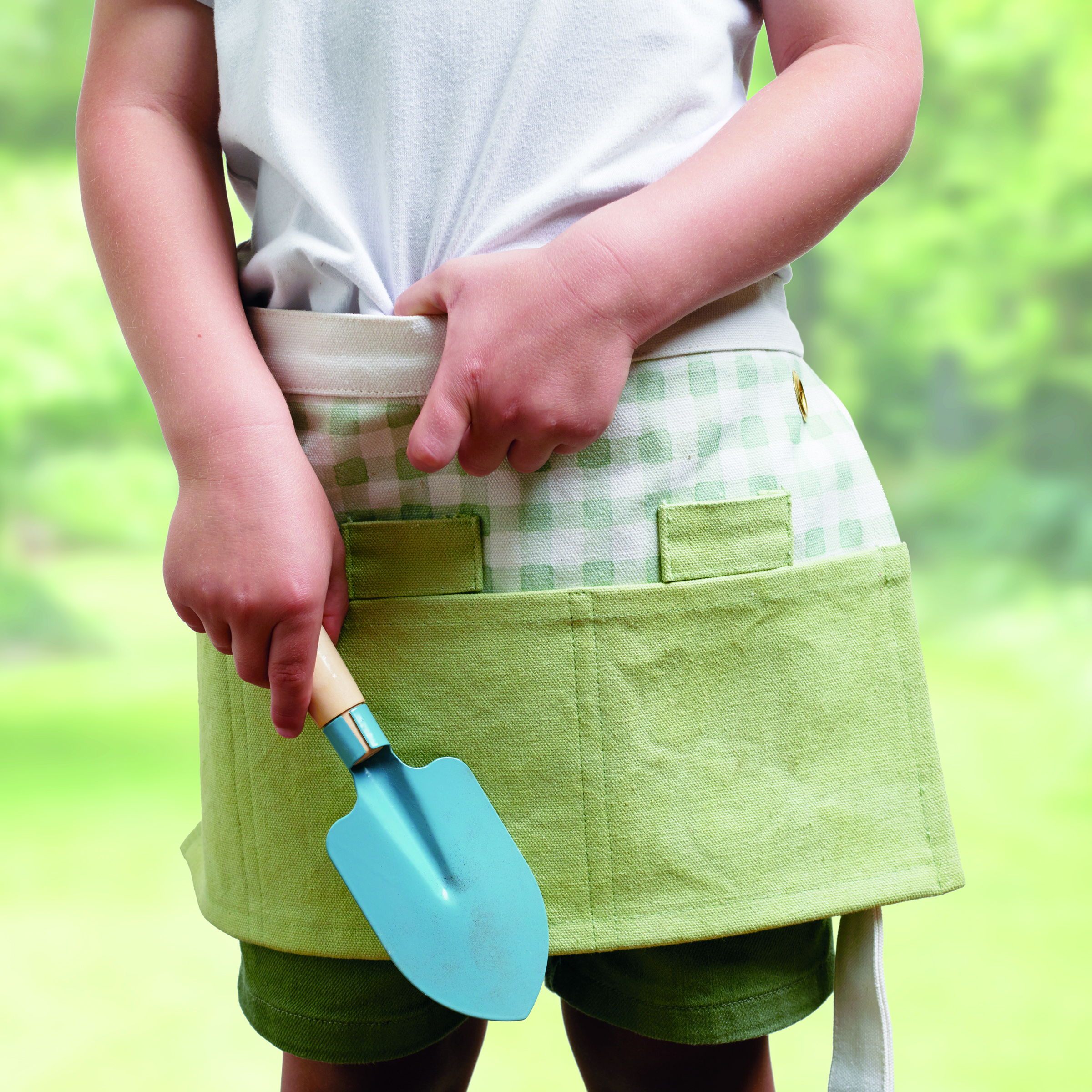 A thick canvas kids apron from our Garden Collection featuring a half apron style with spaces to hold tools and metal grommets on each side to hang accessories, making it perfect for kids to use while helping with gardening. Kids apron displays a green color on the pockets and coordinating green gingham pattern behind tool holders. Garden apron includes waist ties to create the perfect fit. Our Green Gingham kids apron is conveniently machine-washable for easy cleaning. Packaged with three cardboard cutouts displaying tool designs to show how garden apron can be used. Actual garden tools pictured not included. A charming garden-themed gift that creates special moments for parents and kids.