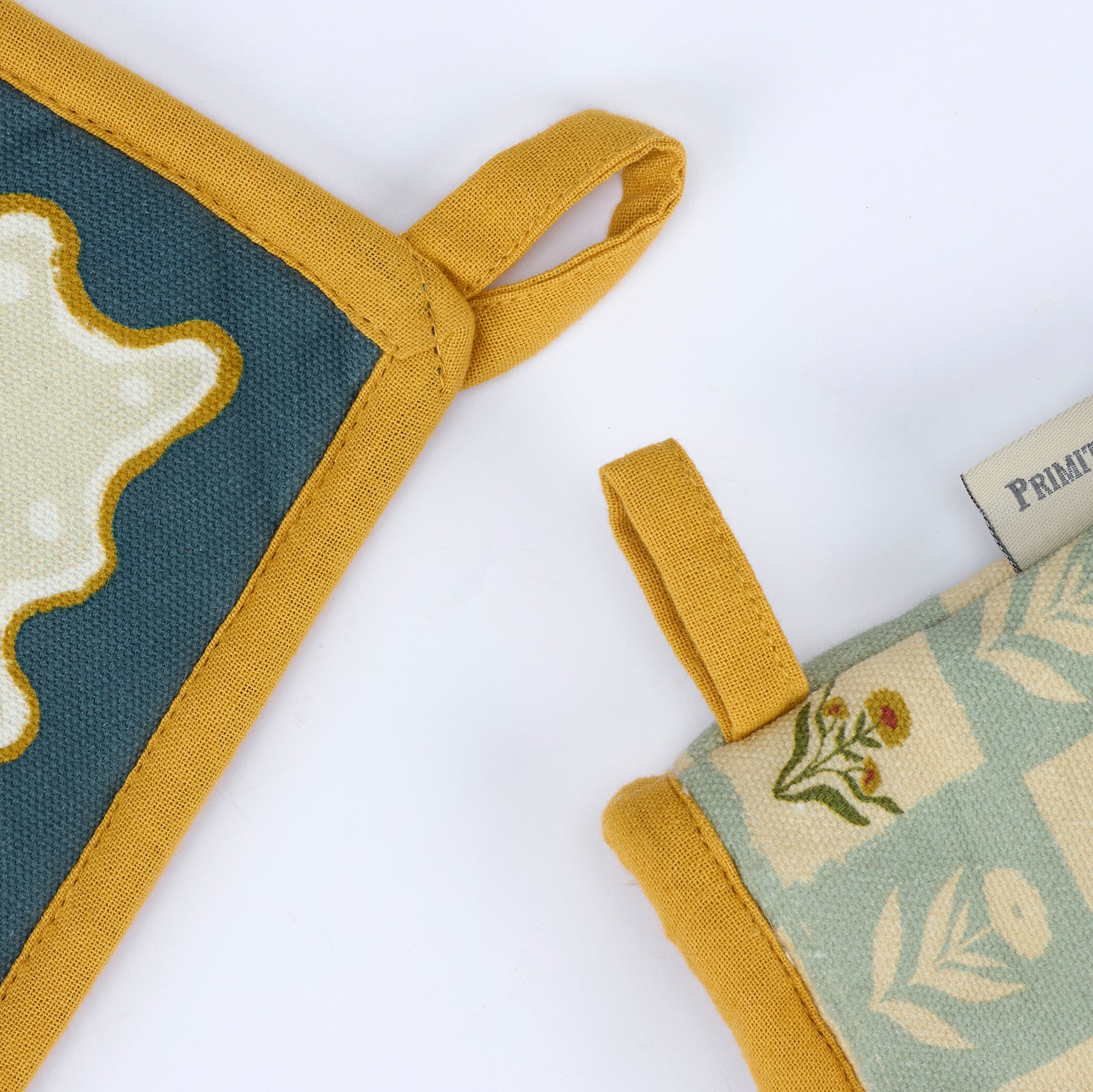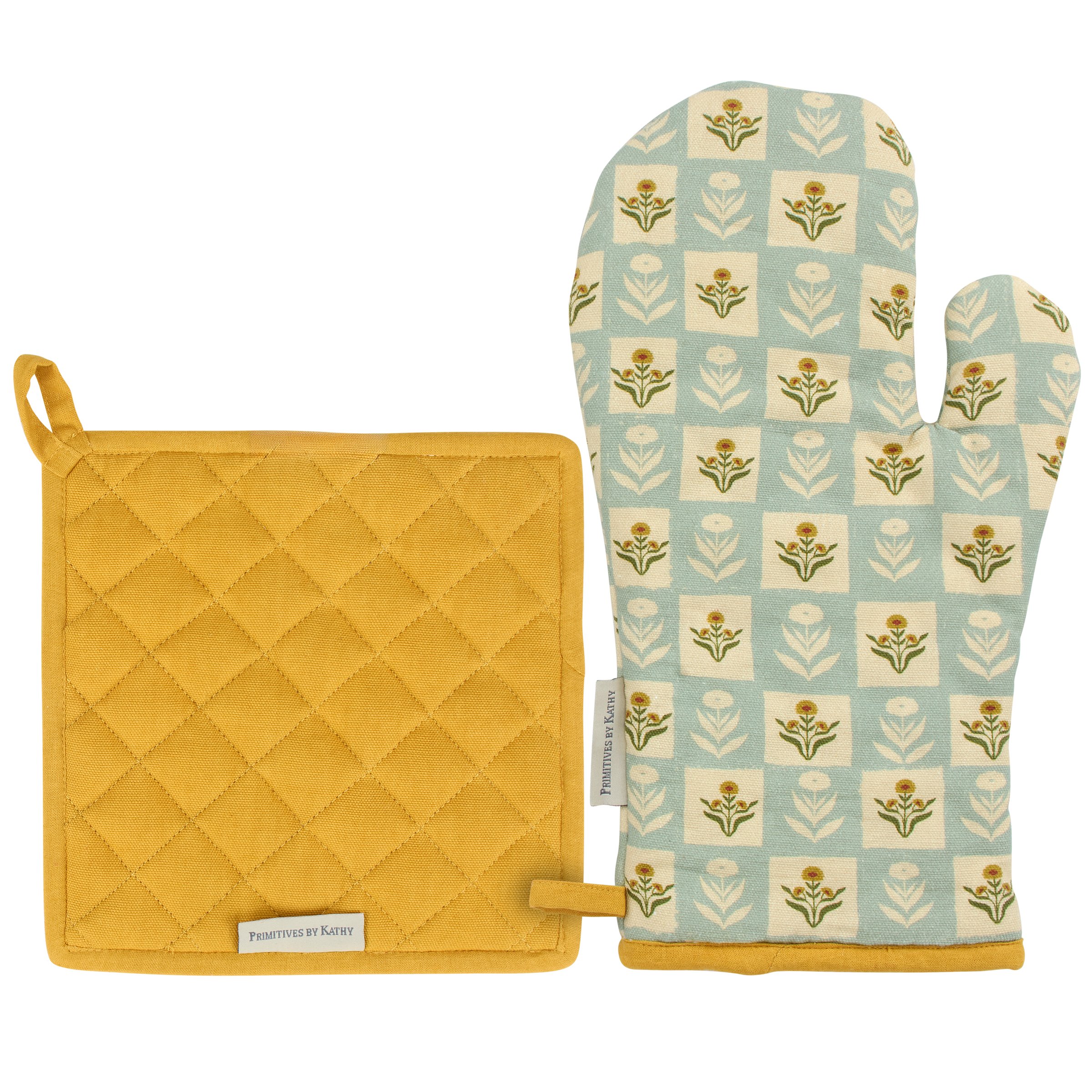 A kitchen set from our Fall & Harvest Collection including a hot pad and matching oven mitt featuring folk art inspired fall floral designs replicated from original art hand painted in a unique watercolor style. Hot pad design displays a fall floral design and oven mitt displays a pattern of the fall floral design with gold trim on both. Our Fall Folk Floral kitchen set is conveniently machine-washable for easy cleaning and includes a loop on each item for hanging. A folk art fall gift perfect for a seasonal kitchen accessory.