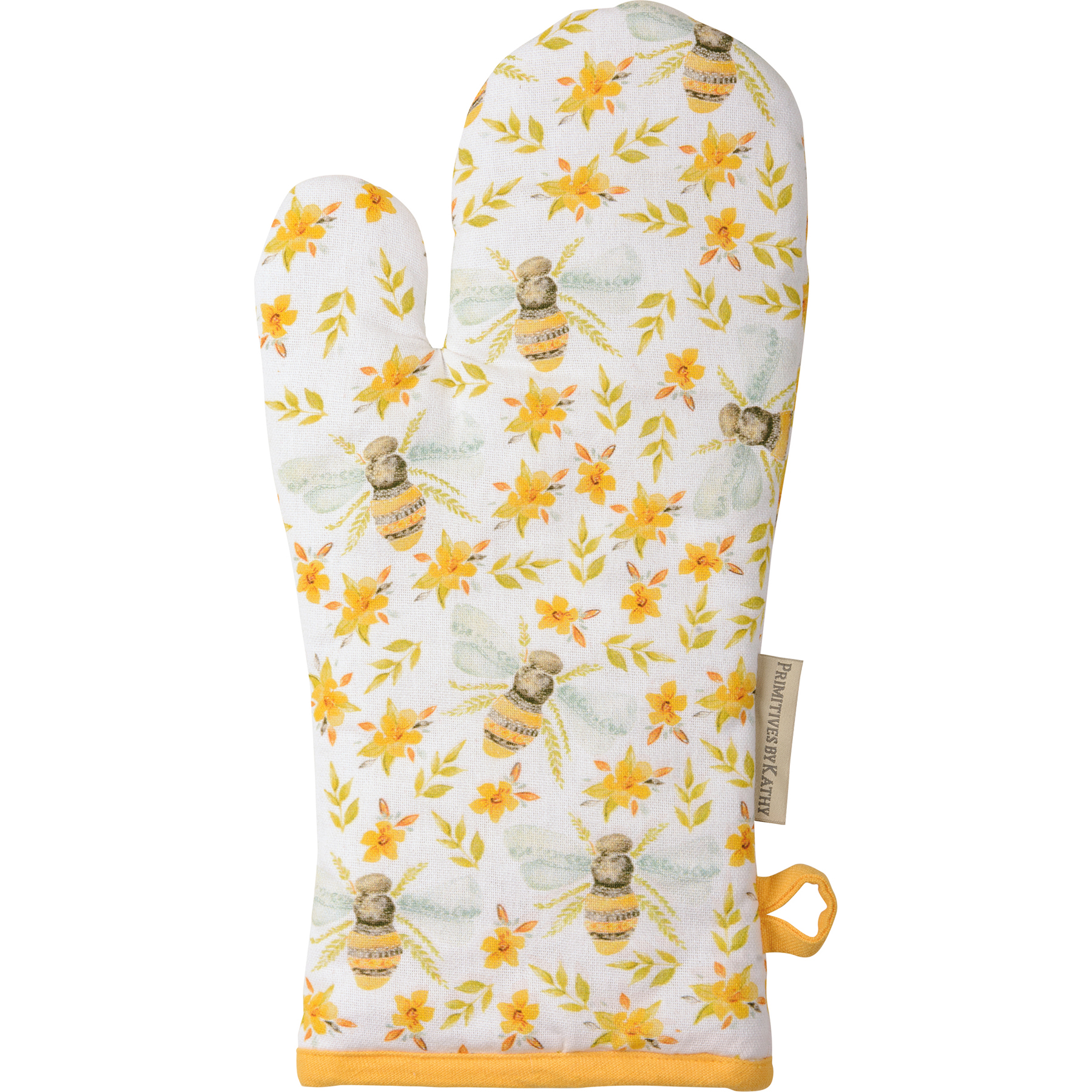 A cotton kitchen set from our Garden Collection featuring a hot pad and an oven mitt with coordinating watercolor bee and floral designs. Hot pad features background gingham pattern on both sides. Our floral bee kitchen set is machine-washable. Great for gifting!