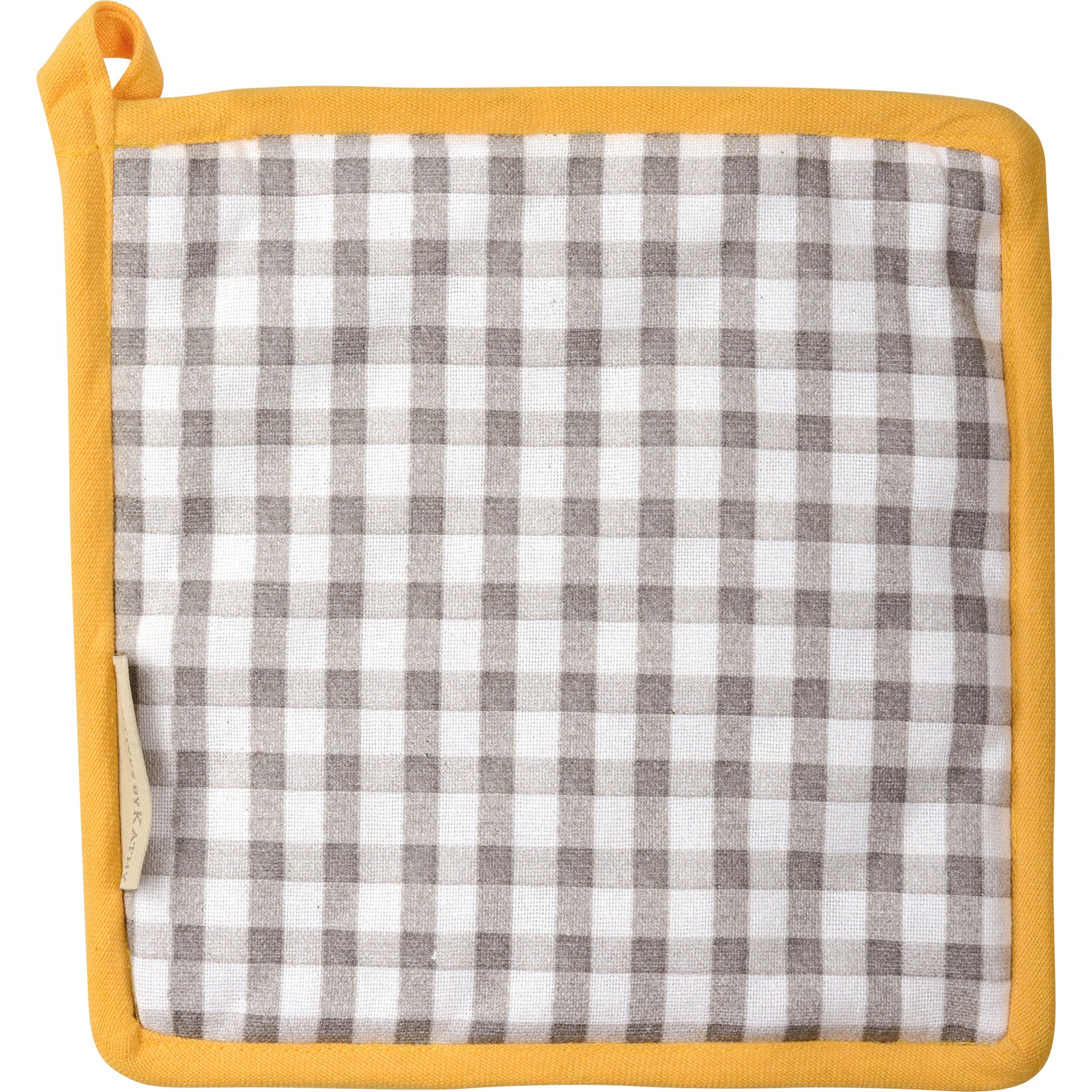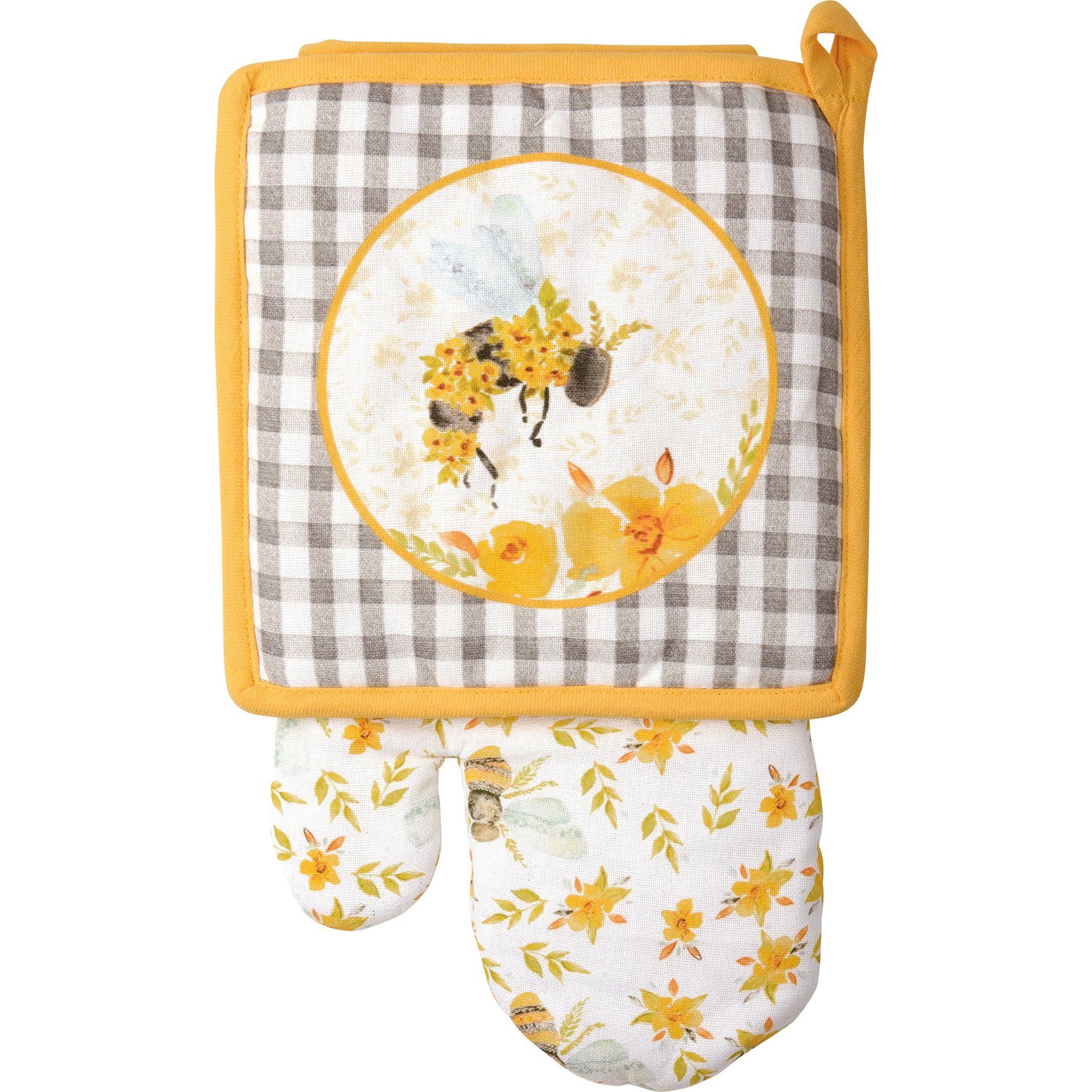 A cotton kitchen set from our Garden Collection featuring a hot pad and an oven mitt with coordinating watercolor bee and floral designs. Hot pad features background gingham pattern on both sides. Our floral bee kitchen set is machine-washable. Great for gifting!
