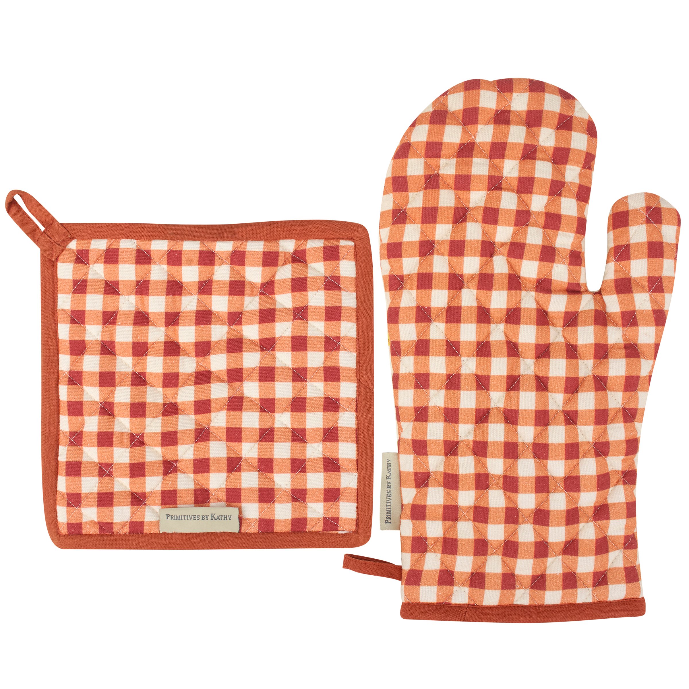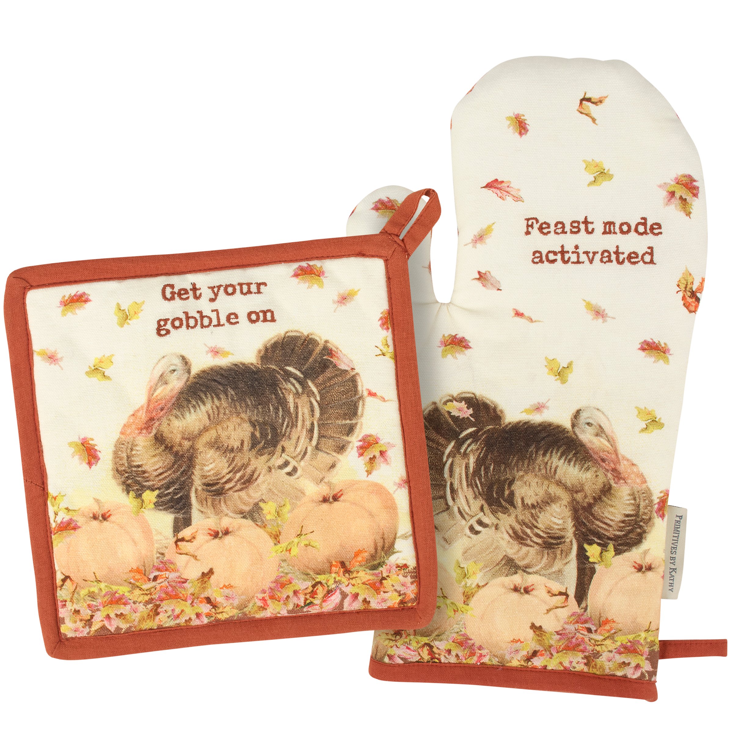 A kitchen set from our Fall & Harvest Collection including a hot pad and matching oven mitt displaying vintage art of a turkey and pumpkins with fun turkey puns embroidered on the front and coordinating autumn brown gingham patterns on the back. Hot pad design features "Get Your Gobble On" sentiment and oven mitt features "Feast Mode Activated" with brown trim on both. Our Get Your Gobble On kitchen set is conveniently machine-washable for easy cleaning and includes a loop on each item for hanging. A fun fall gift perfect for a seasonal kitchen accessory.