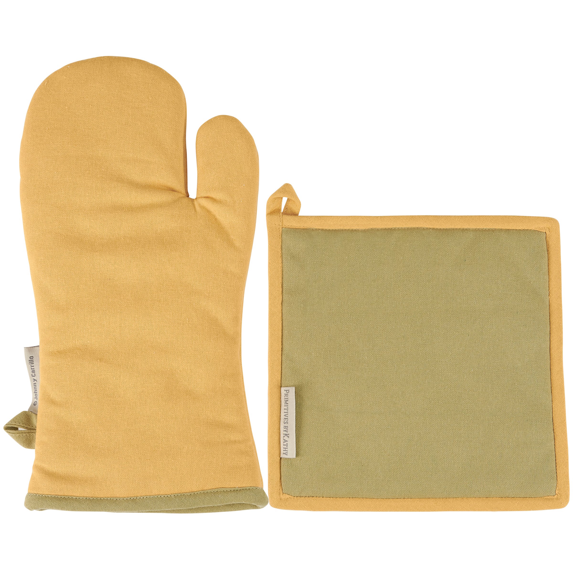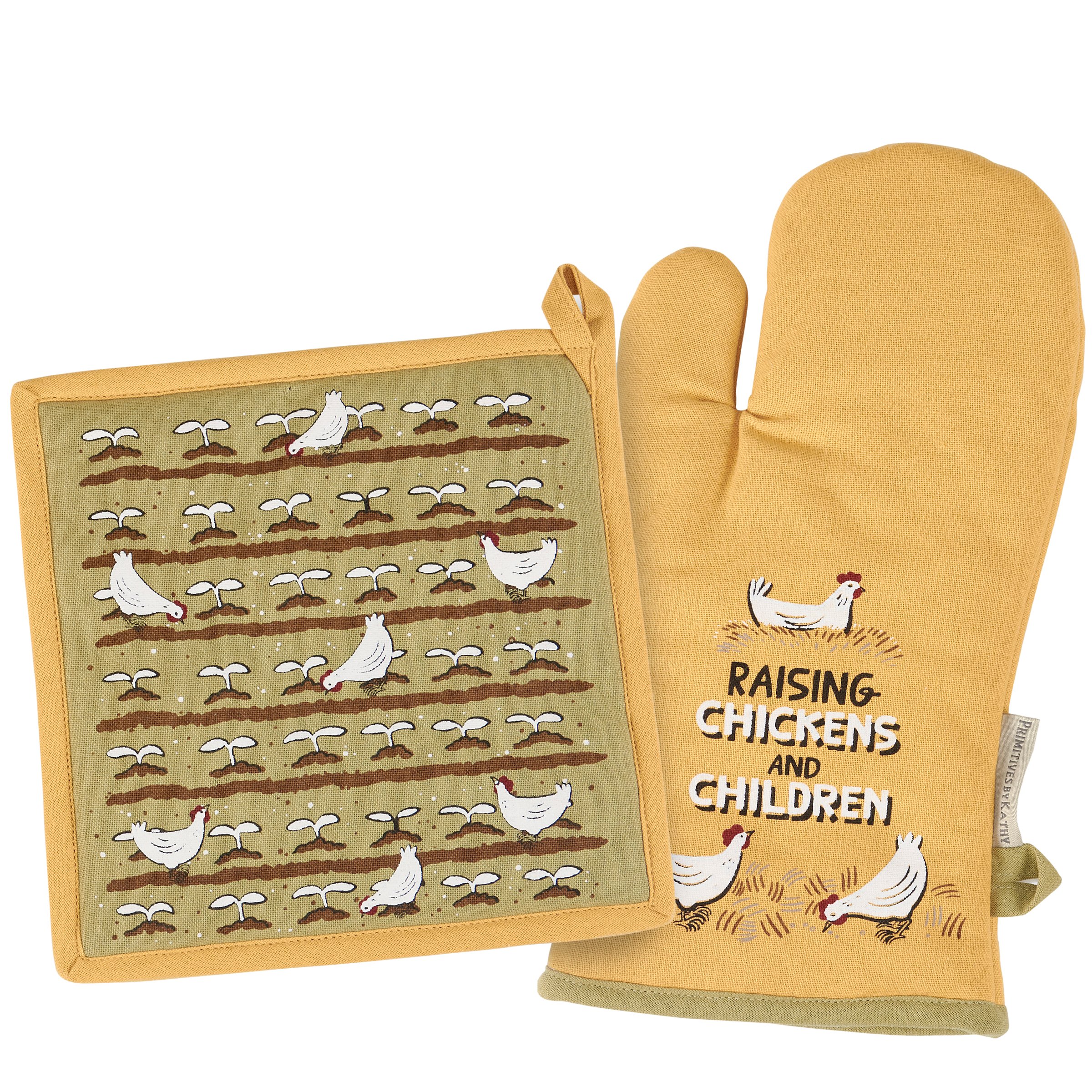 A kitchen set from our Homestead Collection including an oven mitt and matching potholder displaying fun hand illustrated designs inspired by the homestead lifestyle. Oven mitt features a design of chickens with a farm-themed sentiment that reads "Raising Chickens And Children" and potholder features a design of chickens in a crop field. Our Raising Chickens kitchen set is conveniently machine-washable for easy cleaning and includes a loop on each item to hang. A fun farm-themed gift set perfect for an everyday kitchen accessory.