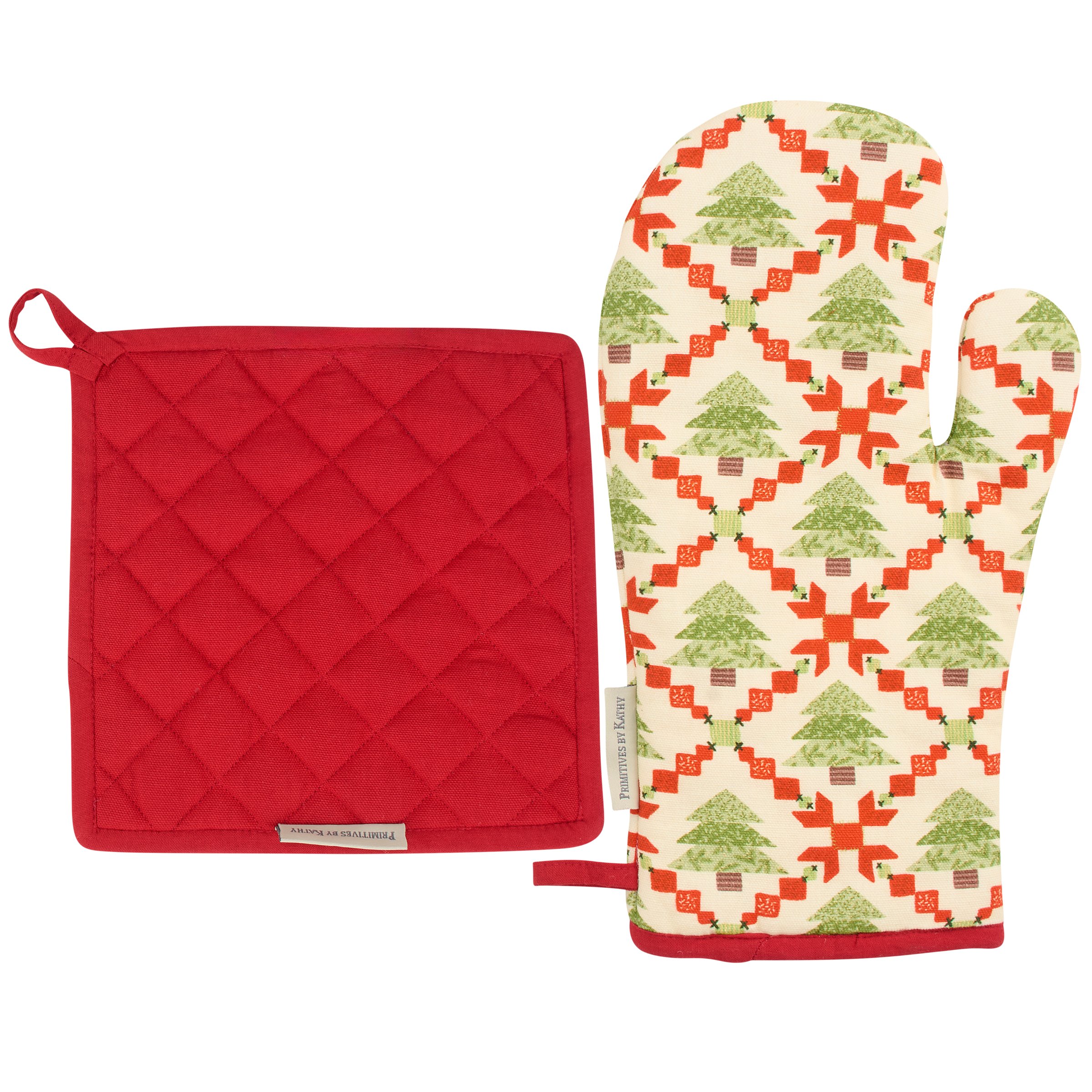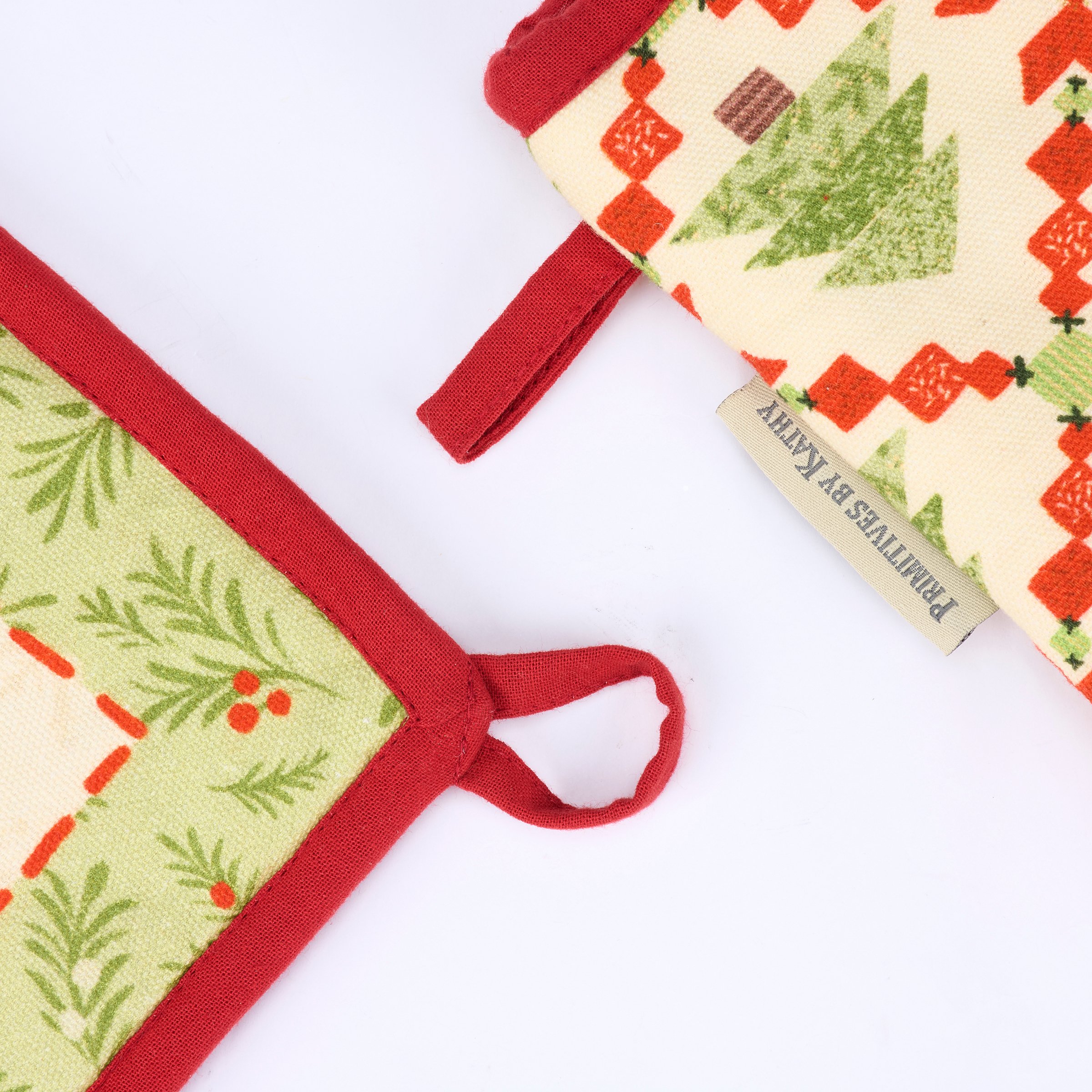 A kitchen set from our Christmas Collection including a hot pad and matching oven mitt featuring craft inspired Christmas quilt designs replicated from original art hand painted in a unique watercolor style. Hot pad design displays a tree quilt patch design and oven mitt displays a pattern of tree quilt patches with red trim on both. Our Tree Quilt kitchen set is conveniently machine-washable for easy cleaning and includes a loop on each item for hanging. A craft themed Christmas gift perfect for a seasonal kitchen accessory.