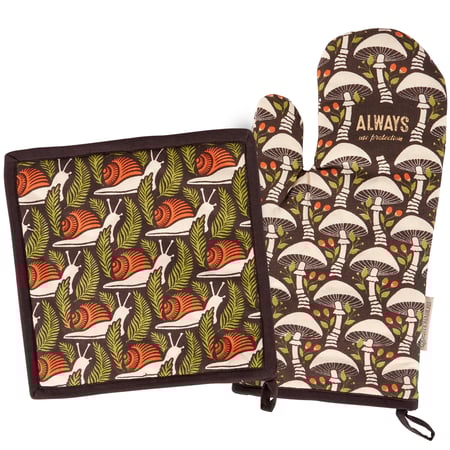 This sarcastic kitchen set includes an oven mitt and matching potholder featuring coordinating nature inspired patterns in an earthy color palette. Oven mitt displays "Always Use Protection" for a sassy way to promote safety in the kitchen and... elsewhere. Questionables kitchen sets are machine-washable for stress-free cleaning after making a mess in the kitchen. Each item includes a loop for hanging. Our Use Protection kitchen set adds chill vibes and honest sentiments to the kitchen that is perfect for everyday expression or gifting to your favorite cook.